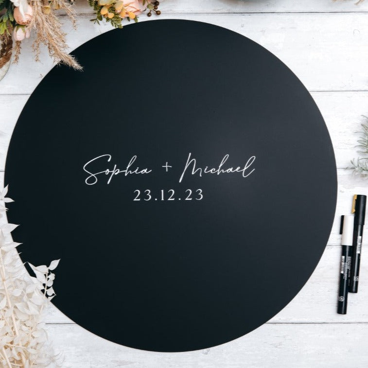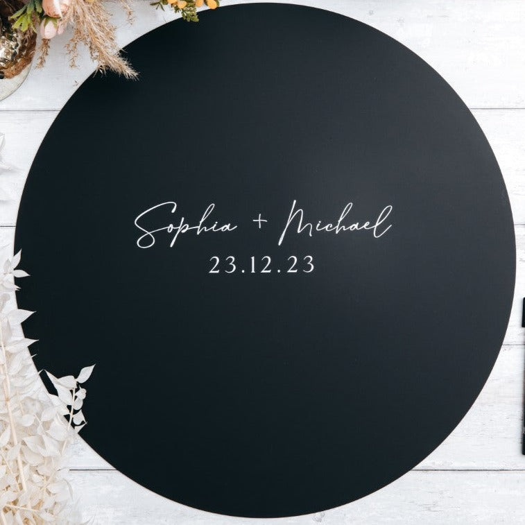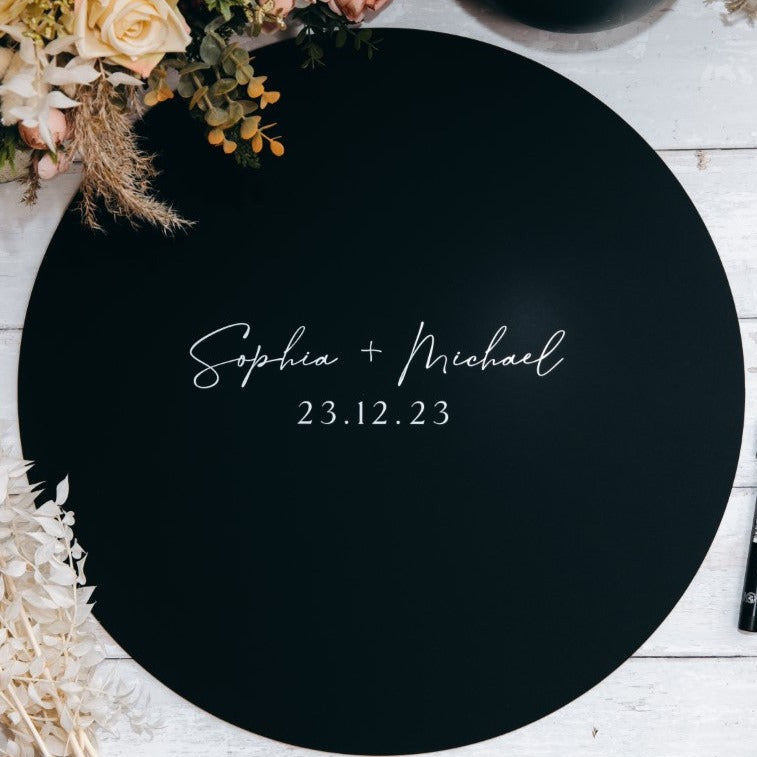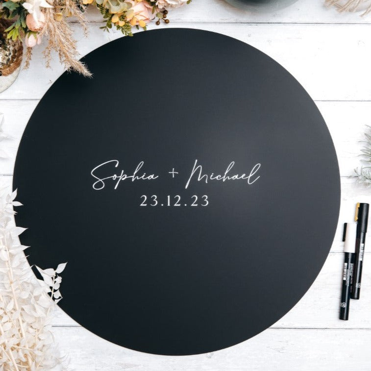 Elevate your special day with our custom wedding guest book sign, available in two sizes: small (30cm) and large (50cm). Each sign is expertly crafted using UV ink printed on 3mm acrylic, and can be personalised to your preferences. Please note that pens are not included, but we suggest using a paint marker pen. Choose from a selection of finishes to compliment your wedding aesthetic.