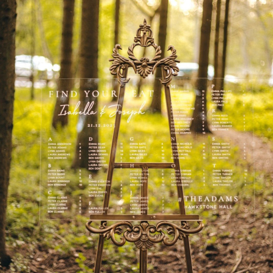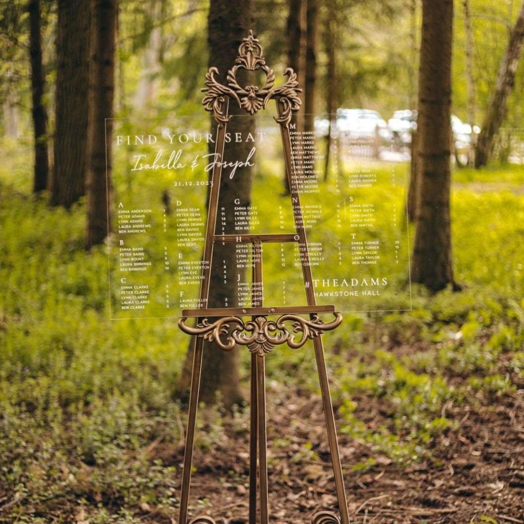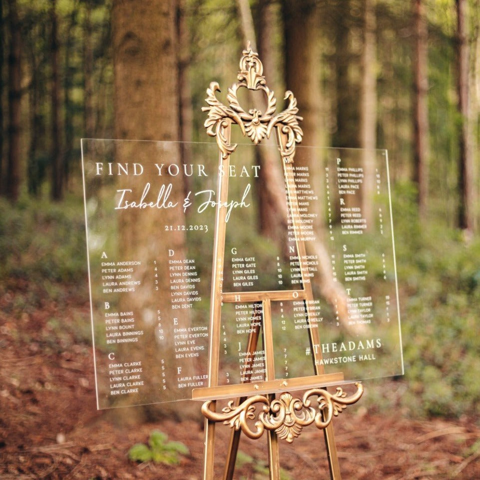 Elevate your wedding with our engraved acrylic wedding table plan. This luxurious piece adds a sophisticated touch to your special day. Available in various colours, shapes, and sizes, it offers a customisable design to fit your unique style. Make a statement with this exclusive centrepiece.