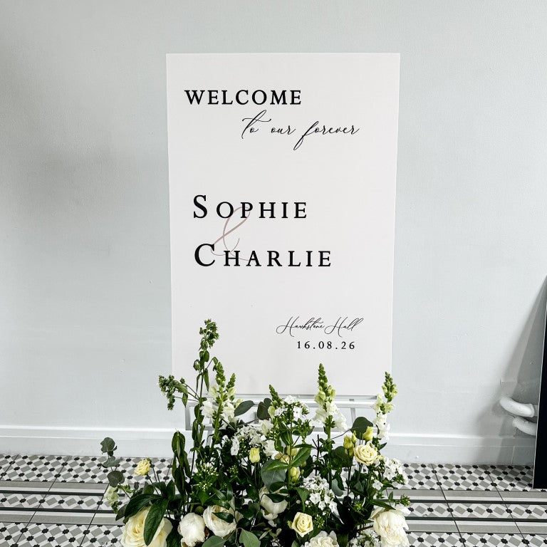 Elevate your wedding experience with our customisable wedding welcome sign. Crafted from either 5mm foam board, 3mm eco board, for an environmentally friendly option or 3mm acrylic for a luxurious gloss finish. Available in a variety of colours, shapes, and sizes, this statement piece adds an exclusive touch to your special day. Personalise the wording to your liking and select from our diverse colour palette or request a unique hue to perfectly compliment your wedding theme. Complete the look with a coordinating table plan for a harmonious and sophisticated aesthetic.