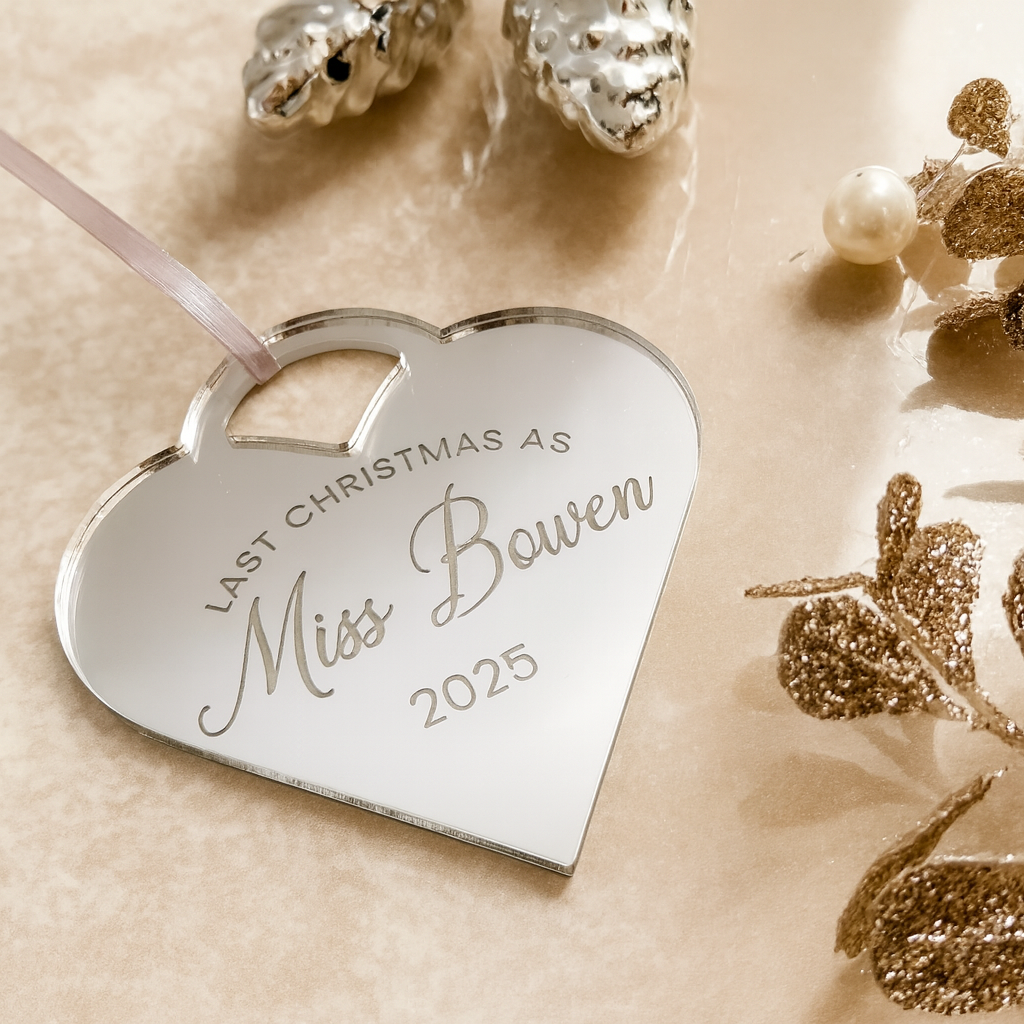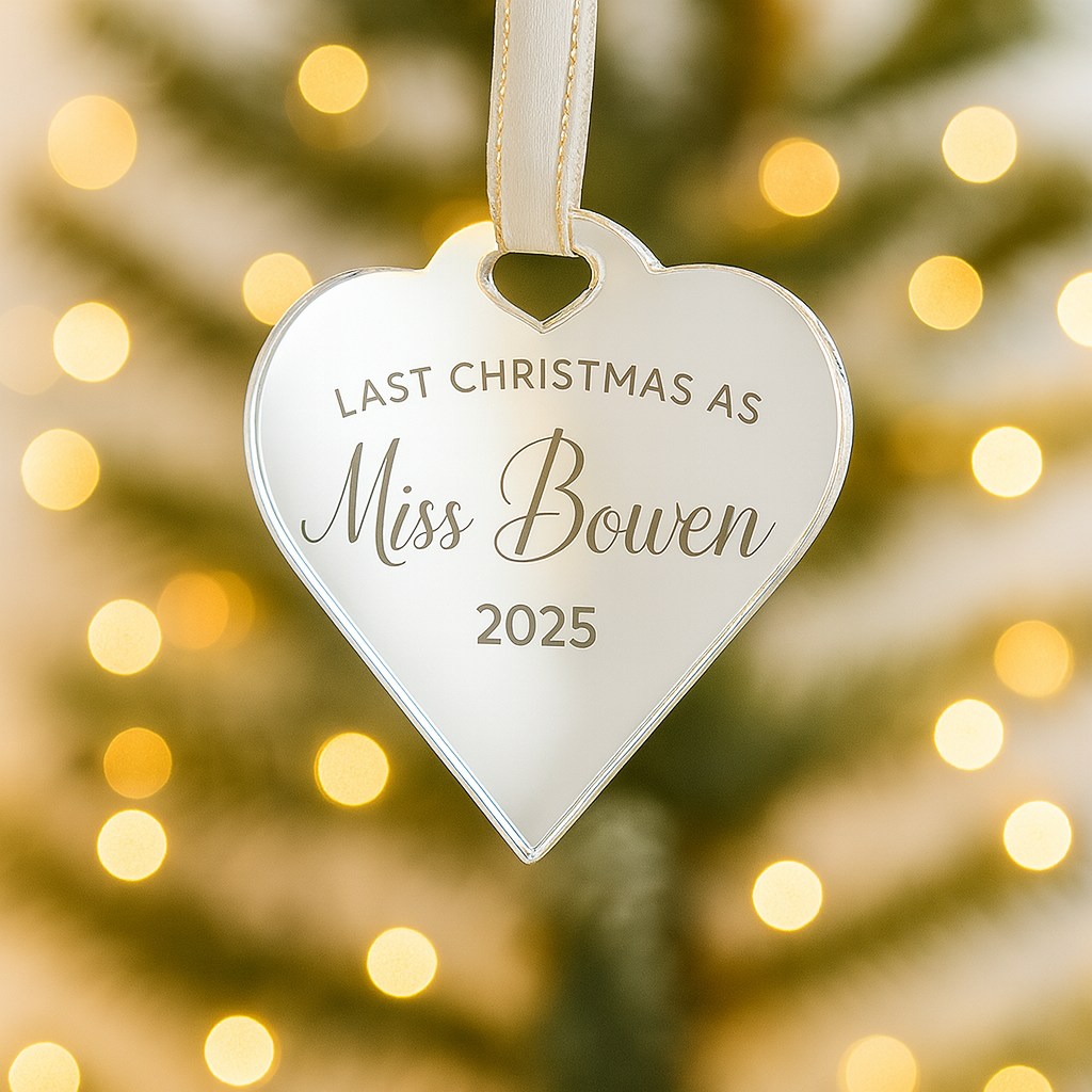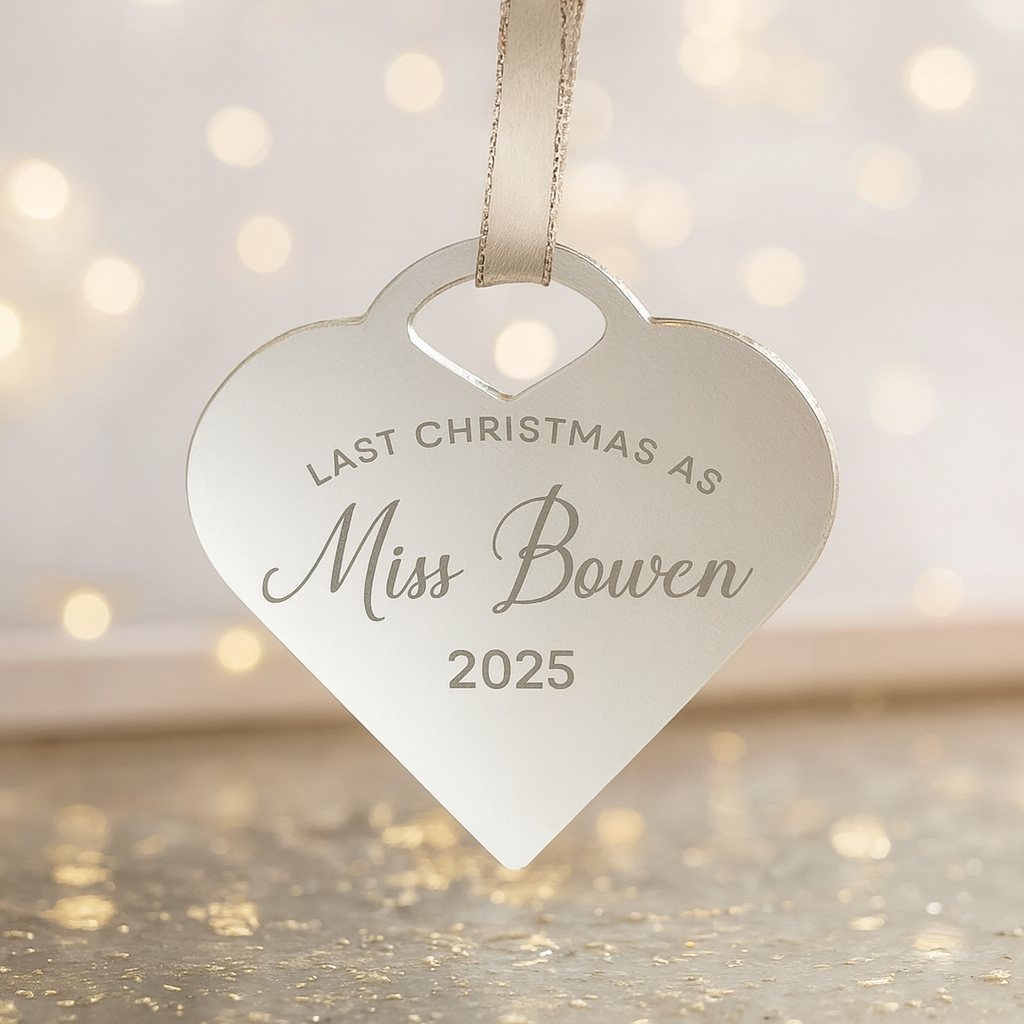 Elegantly engraved for the bride-to-be, this stunning Christmas bauble comes in a range of exquisite finishes. Its approximate diameter of 8cm and 3mm acrylic material add a touch of sophistication. And for that finishing touch, a basic grey ribbon is included separately.