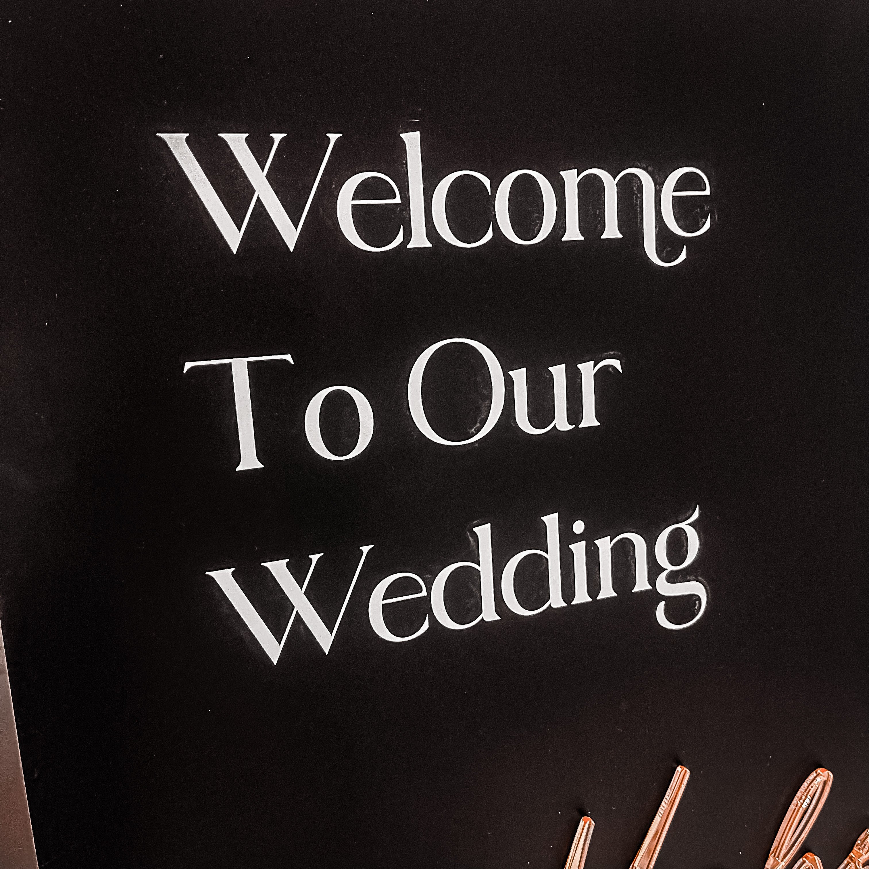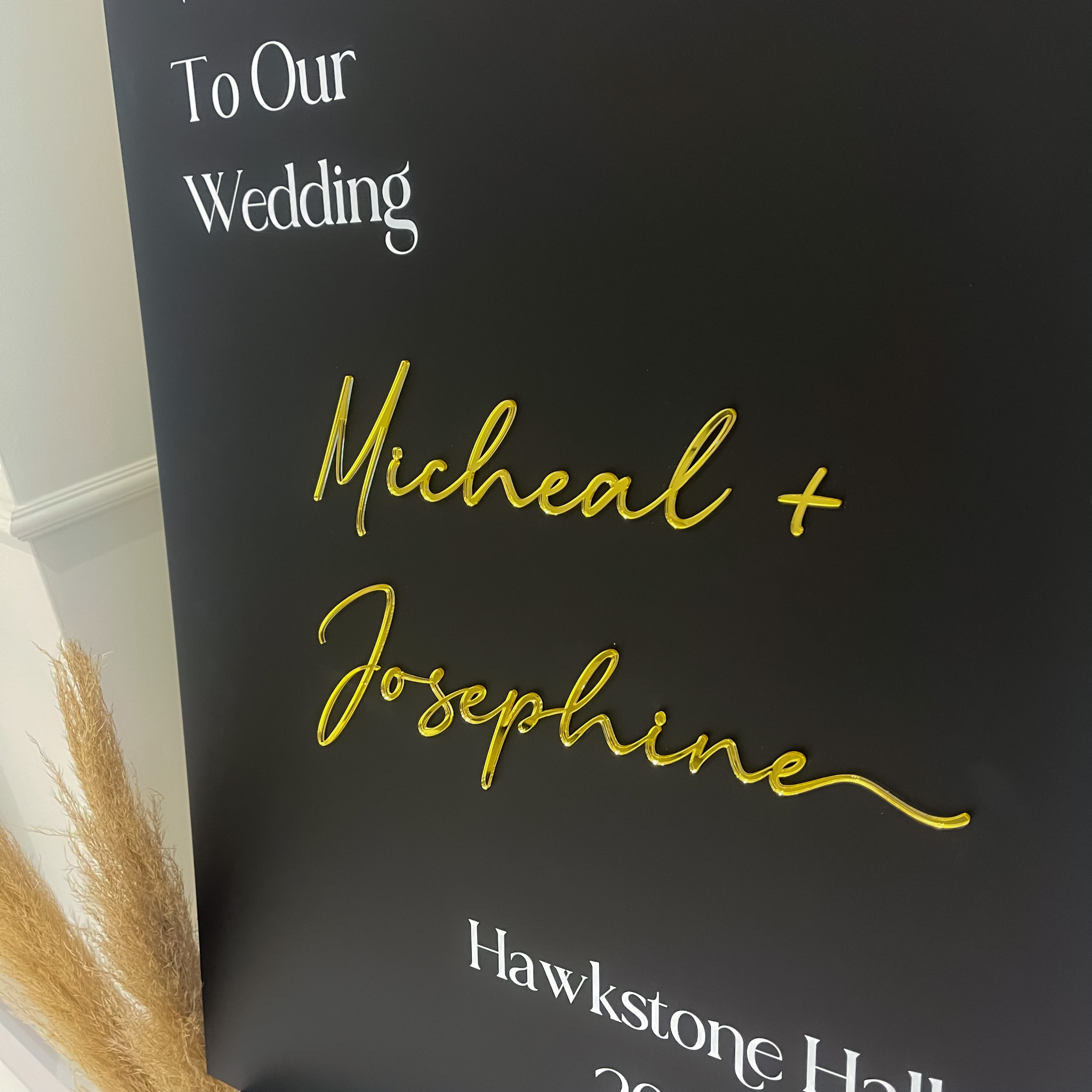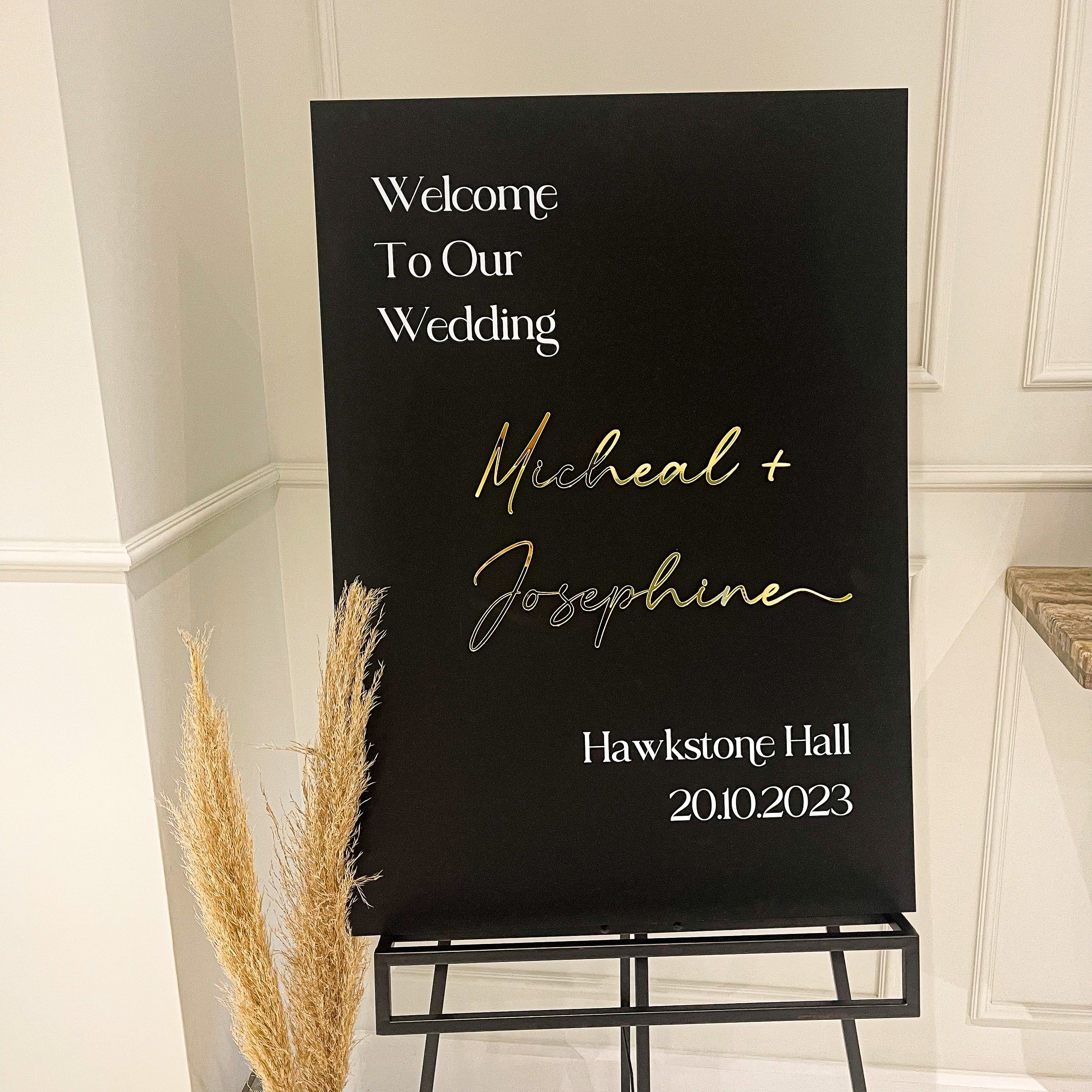 Welcome your guests in style with our luxurious black and gold wedding welcome sign. Made with high-quality acrylic, this sign features beautiful mirror details and can be customised to match your wedding theme. Add a touch of elegance to your special day with our coordinating seating chart.