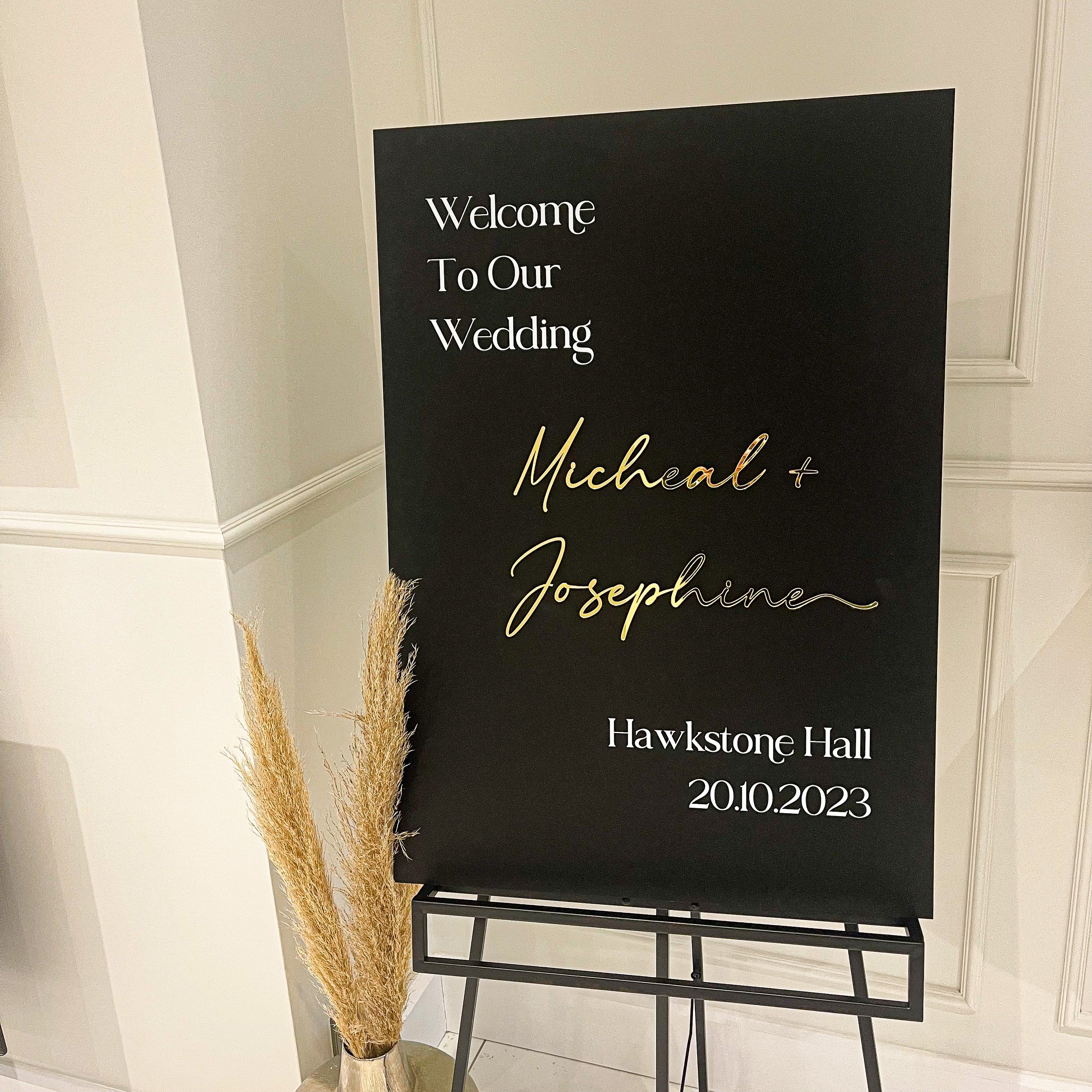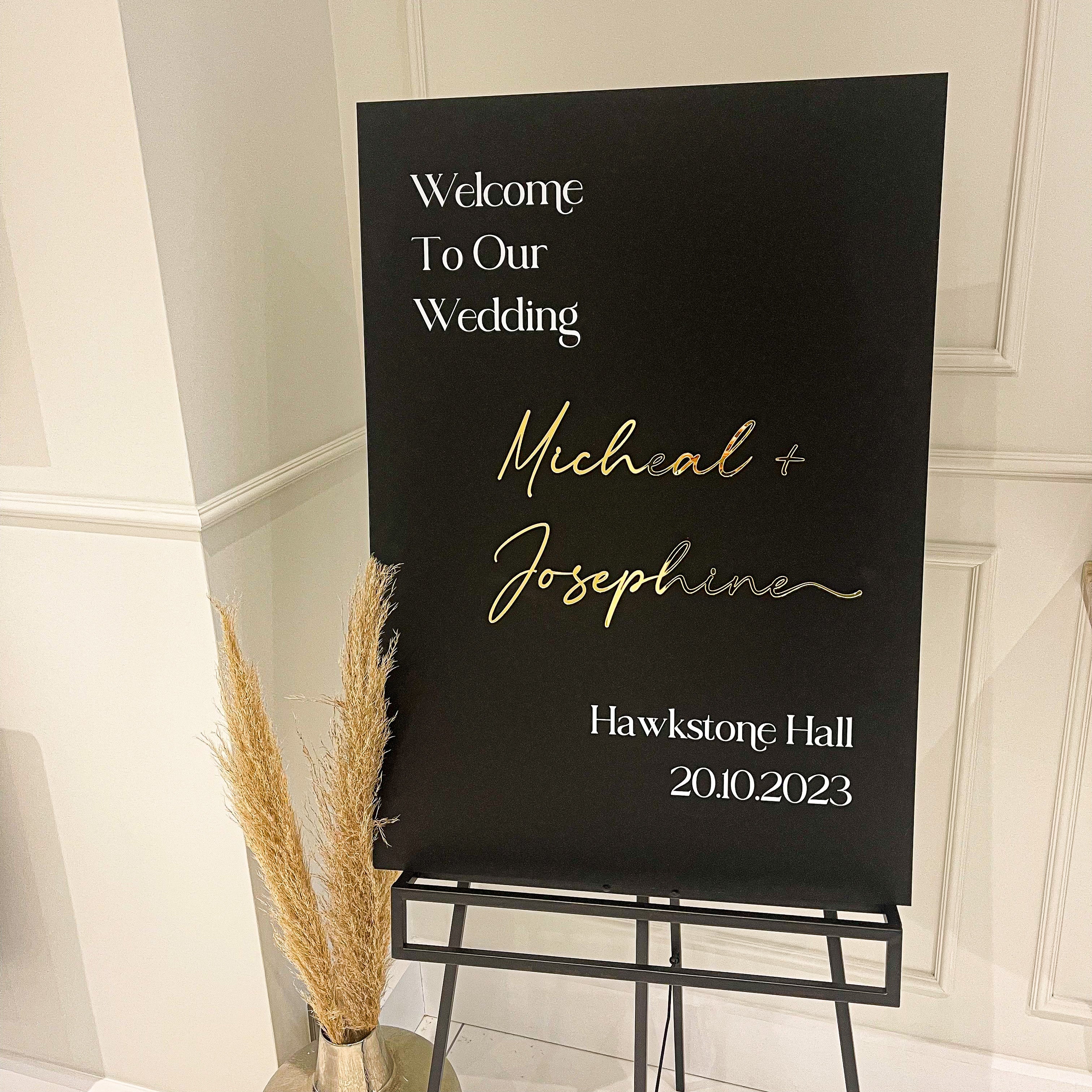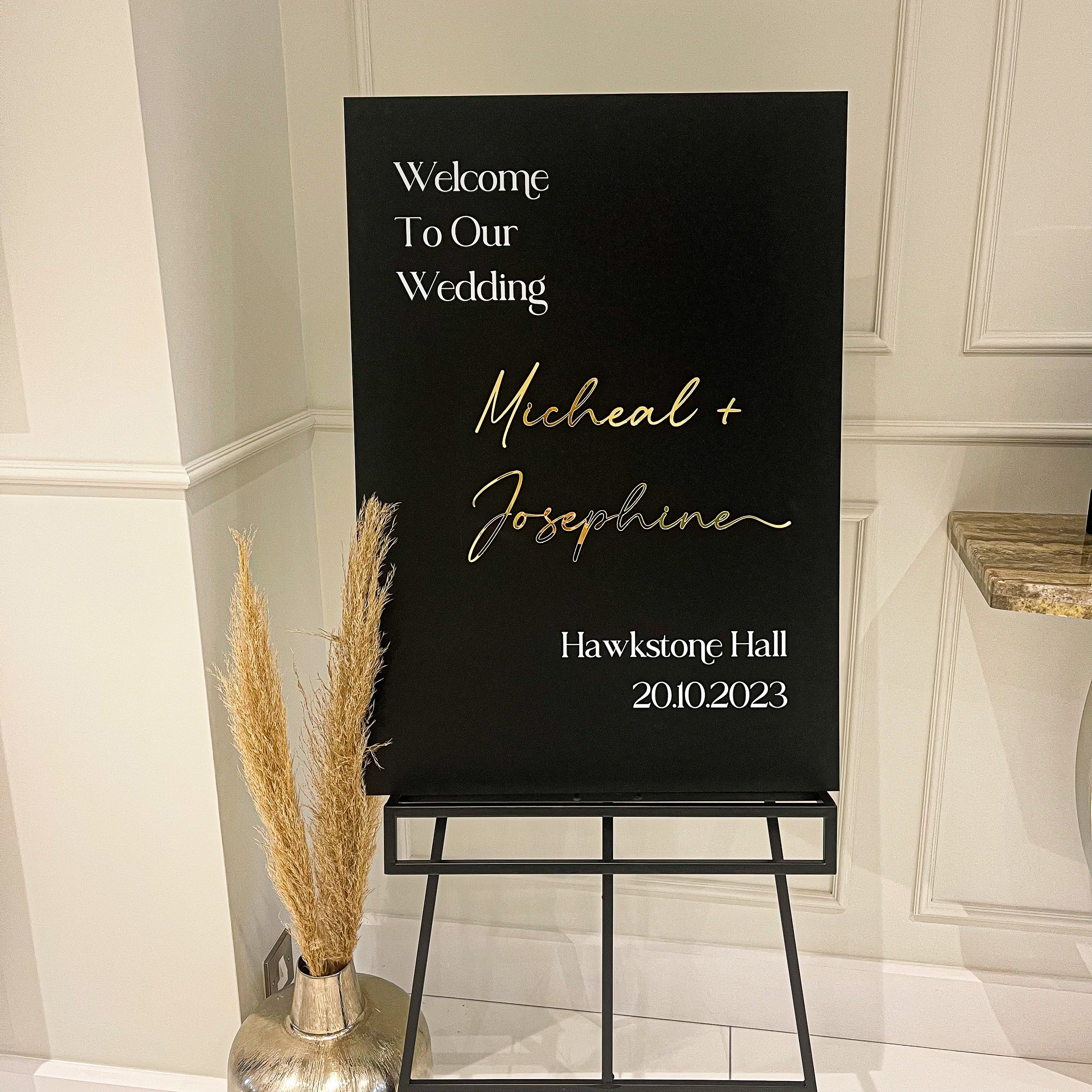 Welcome your guests in style with our luxurious black and gold wedding welcome sign. Made with high-quality acrylic, this sign features beautiful mirror details and can be customised to match your wedding theme. Add a touch of elegance to your special day with our coordinating seating chart.