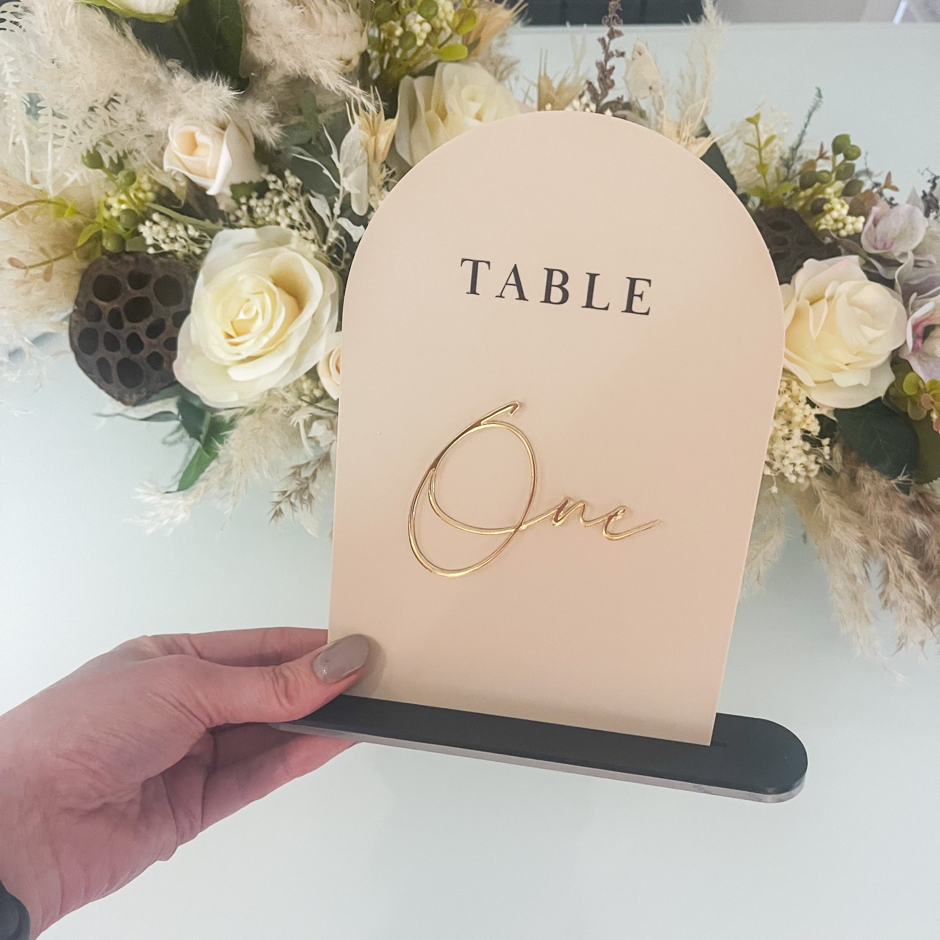Elevate your wedding tables with our dome top beige & gold table numbers. Made of UV-printed 3mm acrylic, each stand comes with a choice of finishes and a variety of fonts to choose from. For added luxury, select from white, black, silver, gold, or rose gold mirror acrylic lettering. Personalise your tables further by requesting a different coloured base or coordinating the lettering with your sign. Simply add your specifications to the personalisation box.