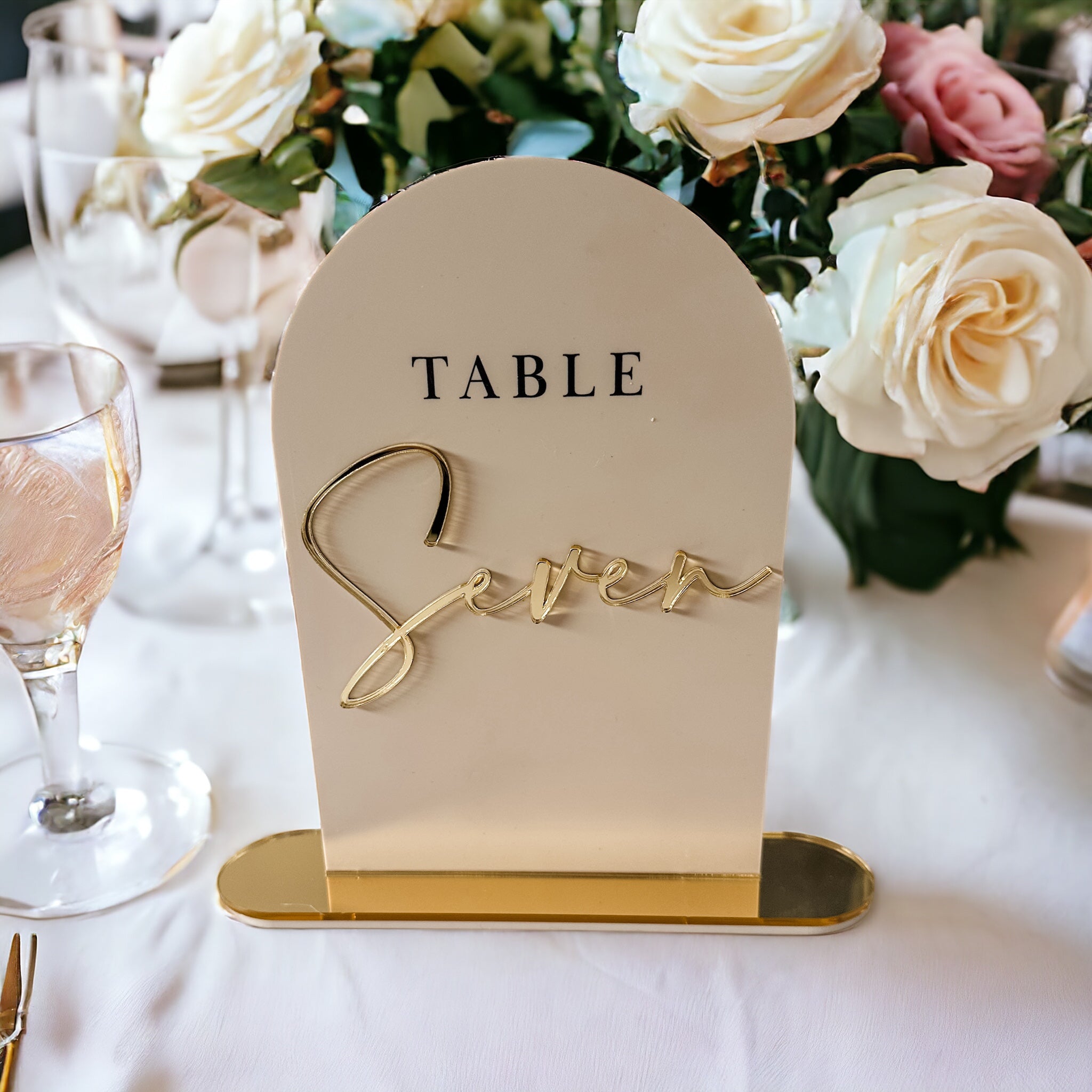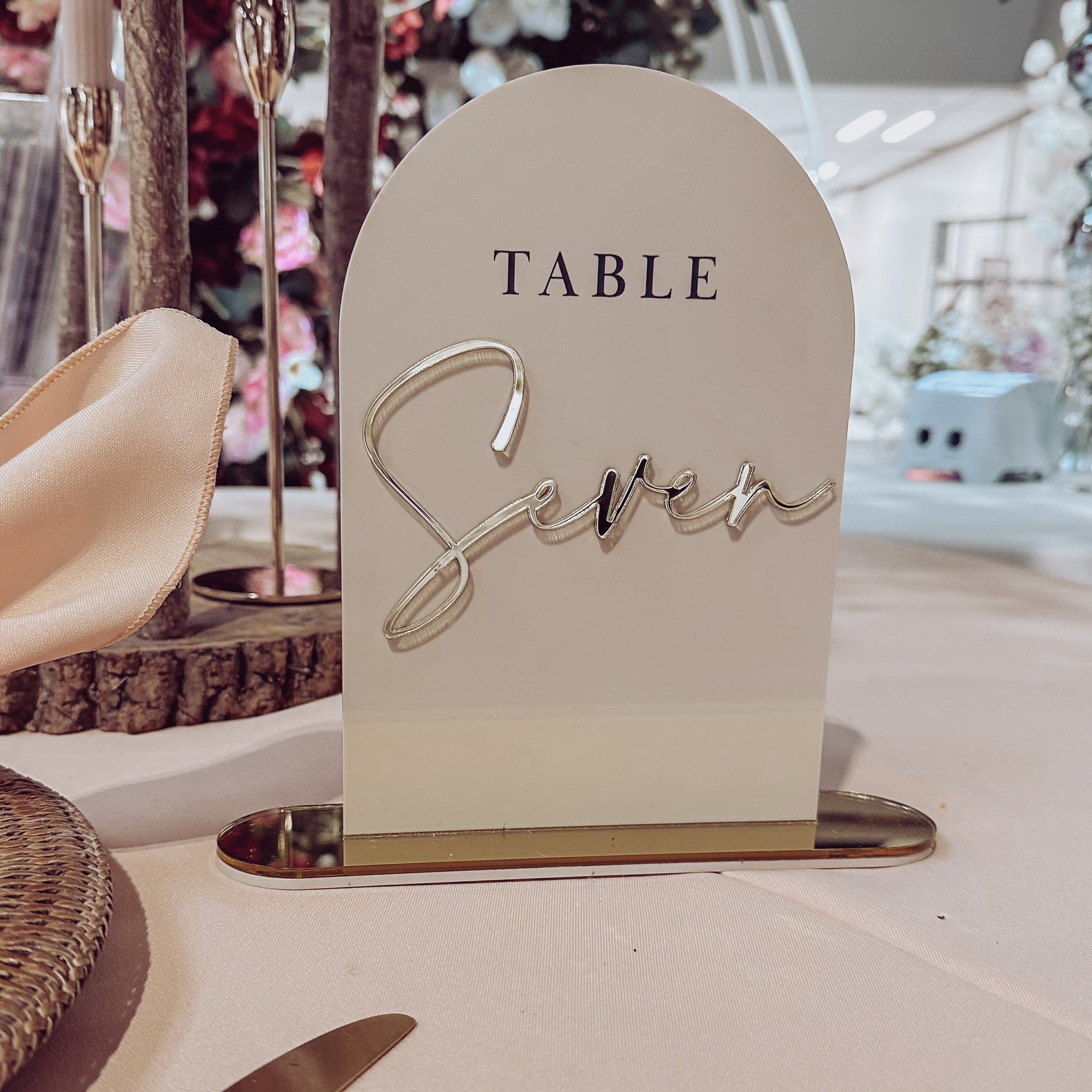 Elevate your wedding table décor with our exquisite UV printed 3mm acrylic table numbers. Included is a sleek stand and the option to choose from a variety of elegant fonts. With a range of stunning finishes available, including white or black acrylic and silver, gold, or rose gold mirror acrylic lettering, you can create a luxurious and personalised touch to your special day.