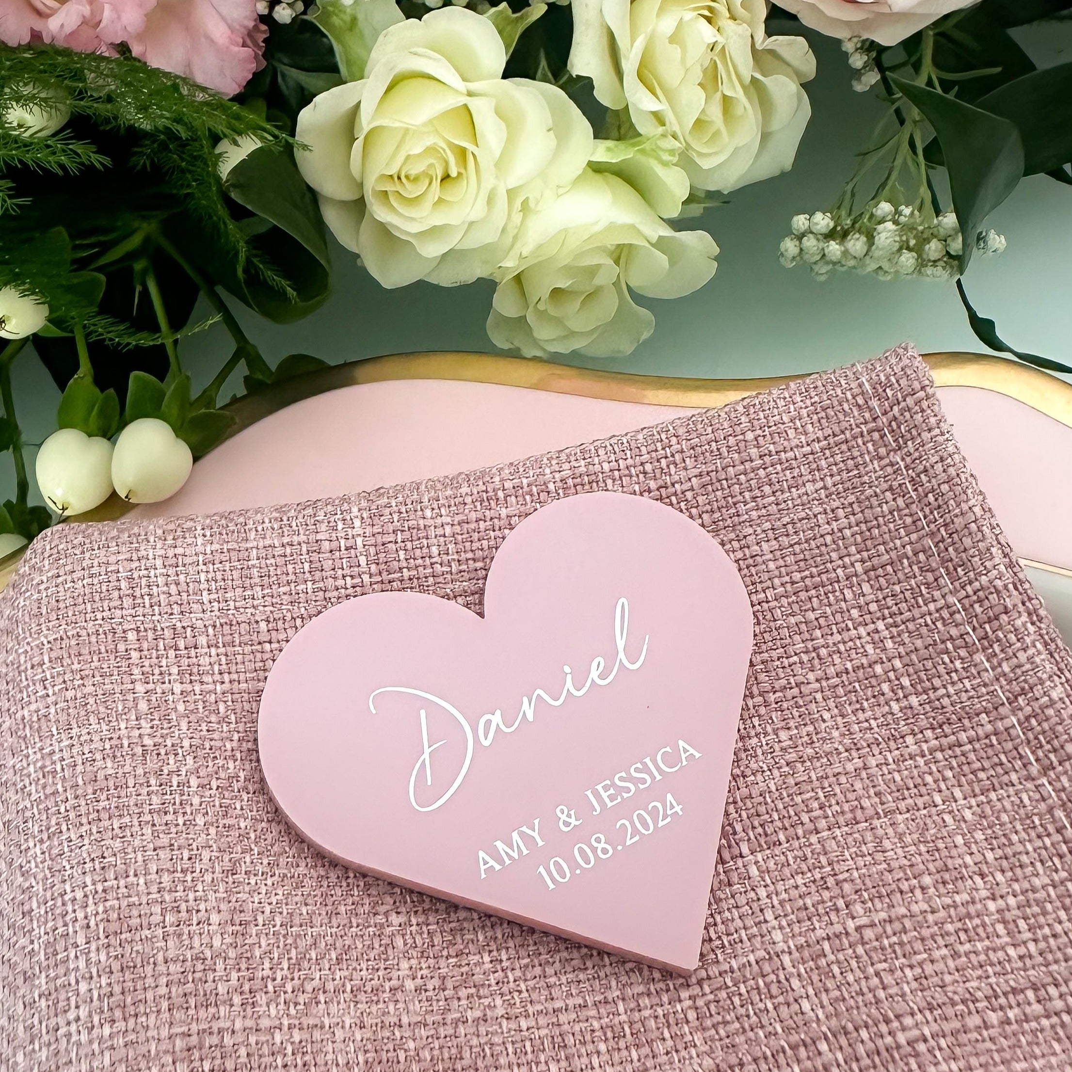 Introducing our Dusk Collection - elevate your occasion with our dusky pink heart wedding place names. These acrylic cards add a touch of opulence and can be customised to match your desired colour scheme. Complete the luxurious look with our coordinating wedding décor.