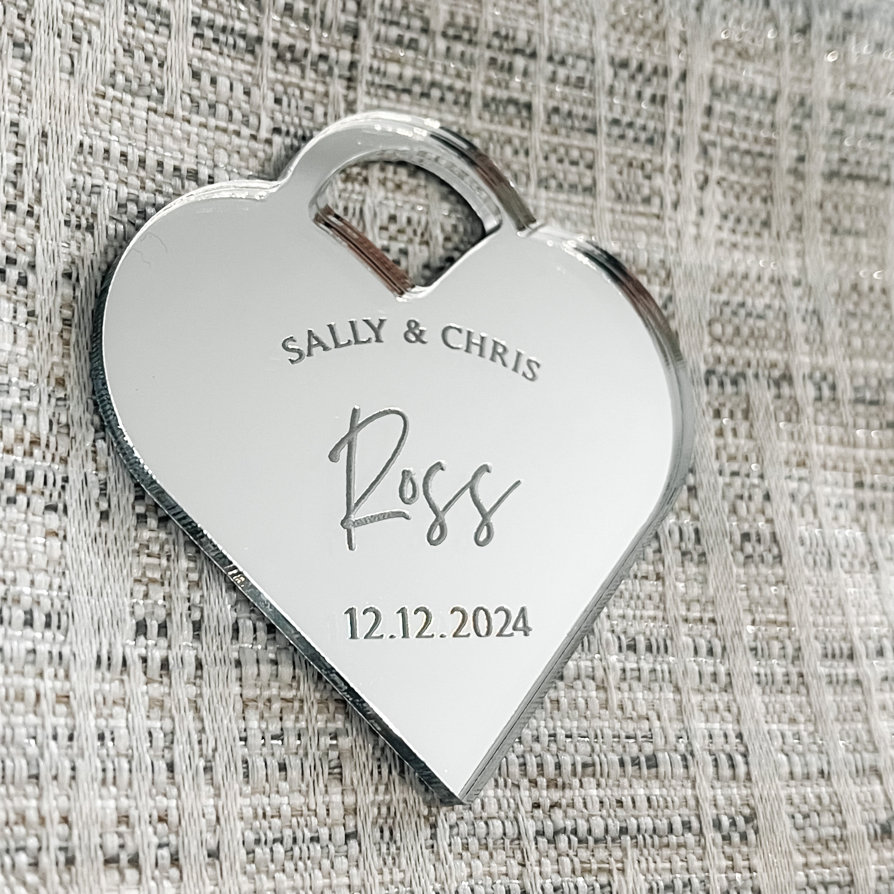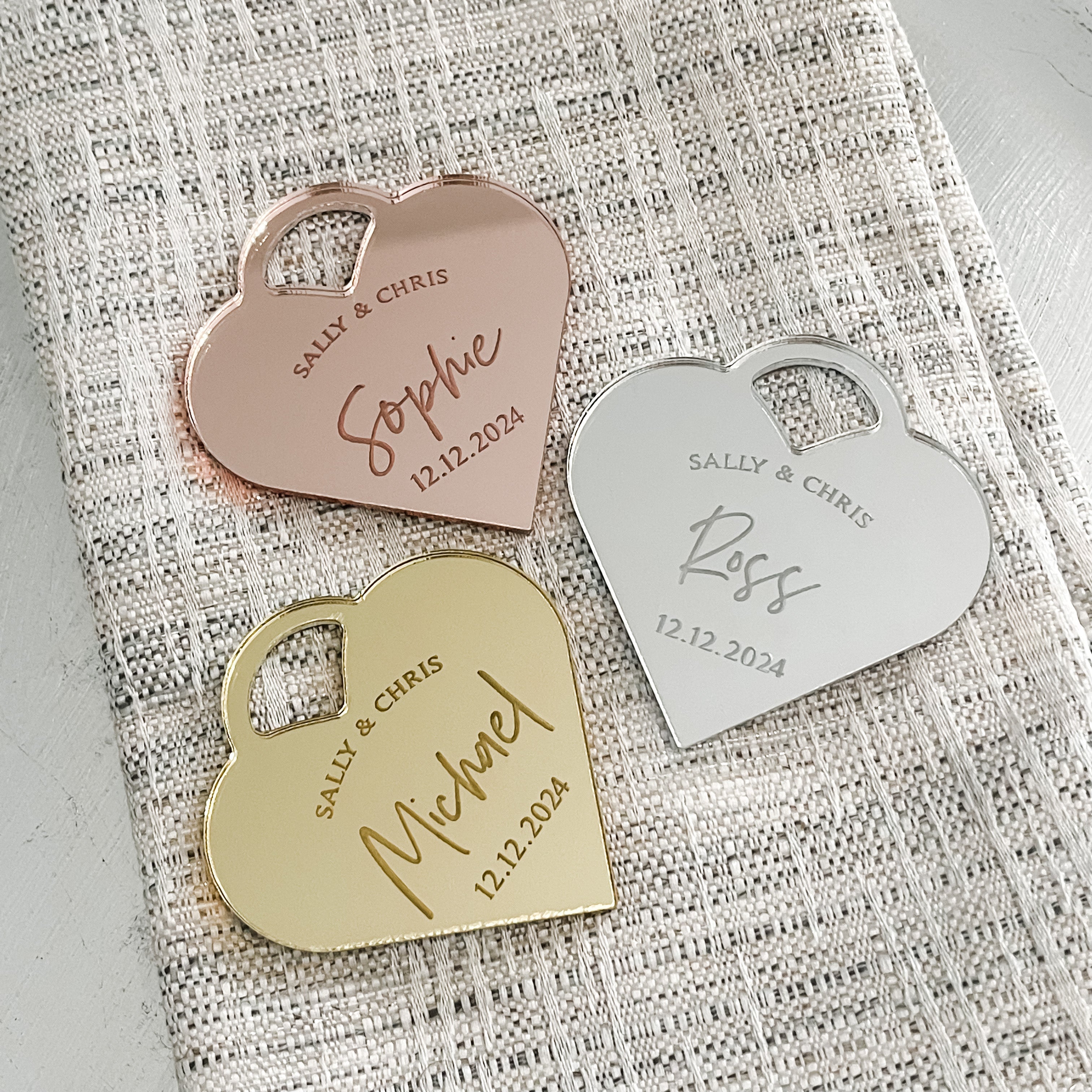 Elevate your wedding reception with our engraved heart-shaped place cards, each delicately crafted out of sleek mirror acrylic. Personalised with your special date, the names of the happy couple, and each guest's name, these exquisite cards are available in a variety of luxurious materials. Please note that while our frosted acrylic is a popular choice, the true magnificence of the engraving is best showcased against a darker backdrop.