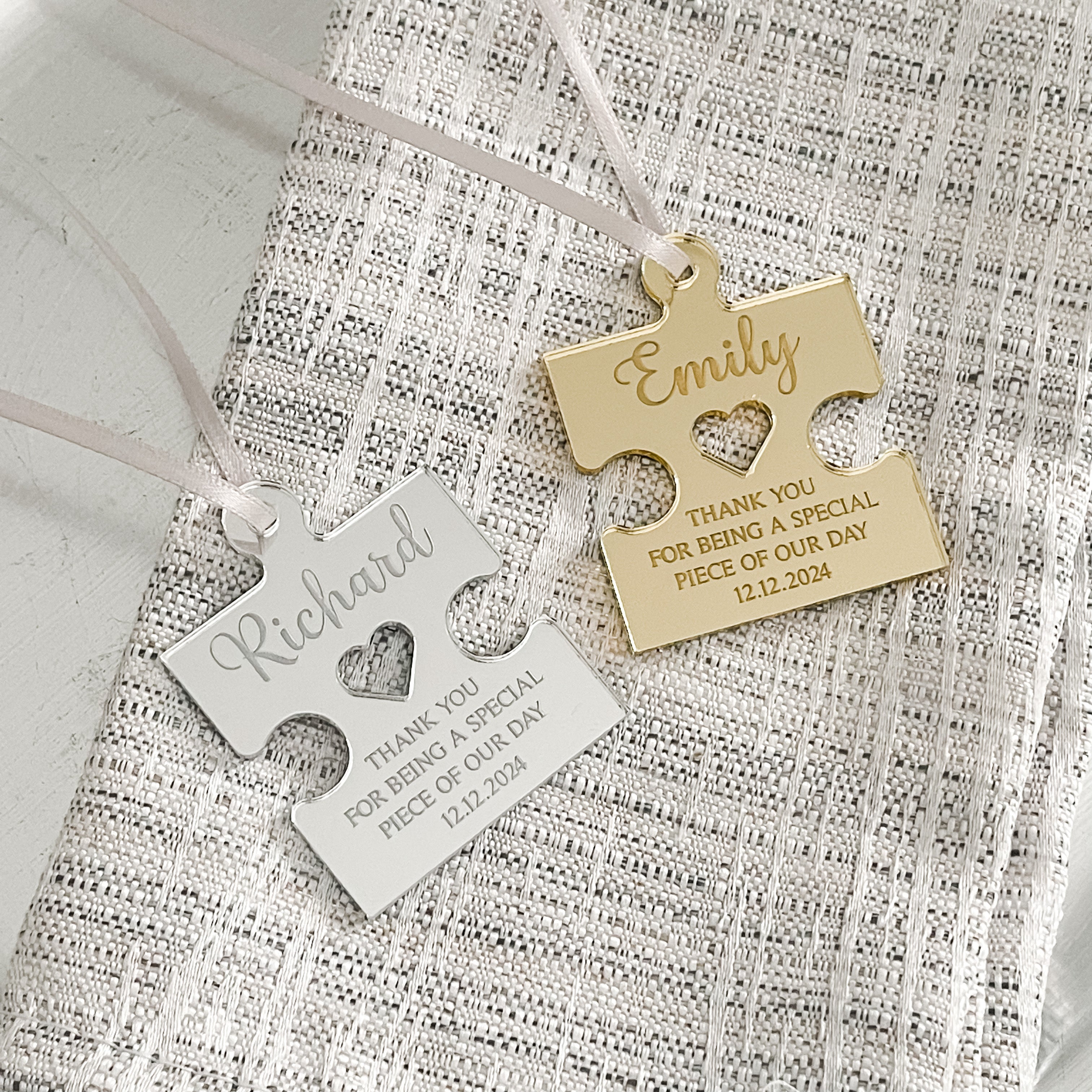 Elevate your wedding reception with our exquisite mirror acrylic engraved jigsaw piece place cards. Each personalised card comes with a basic ribbon and is available in a selection of deluxe materials. Please note that while the frosted acrylic option is a popular choice but, the true beauty of the engraving can only be appreciated when displayed against a darker background. Choose from our range of sophisticated fonts to compliment the elegant design.