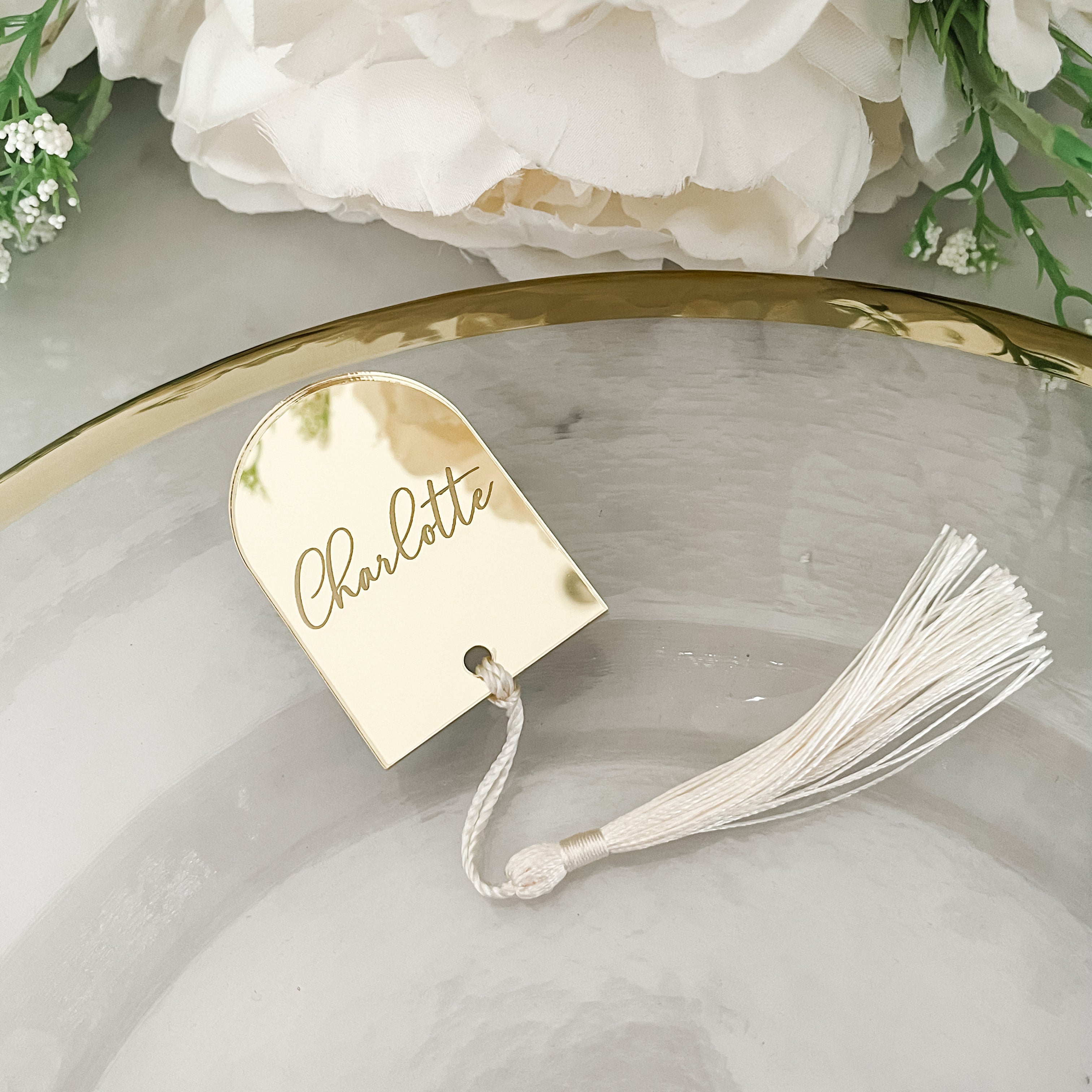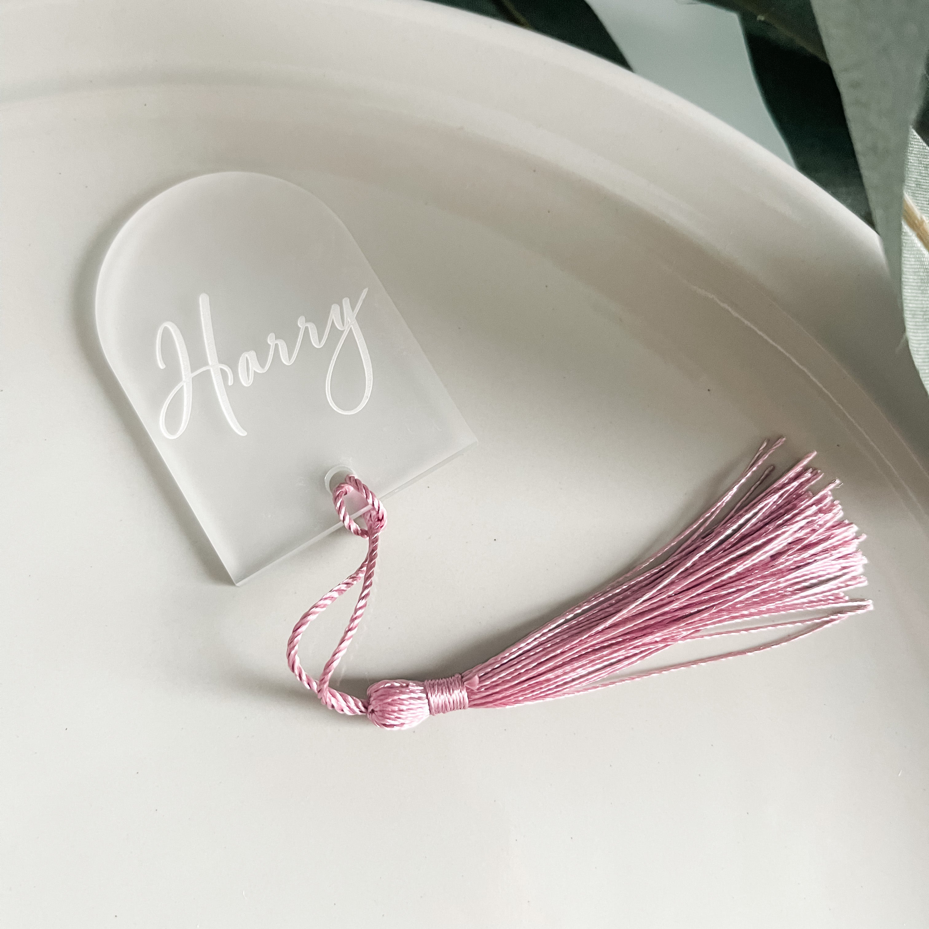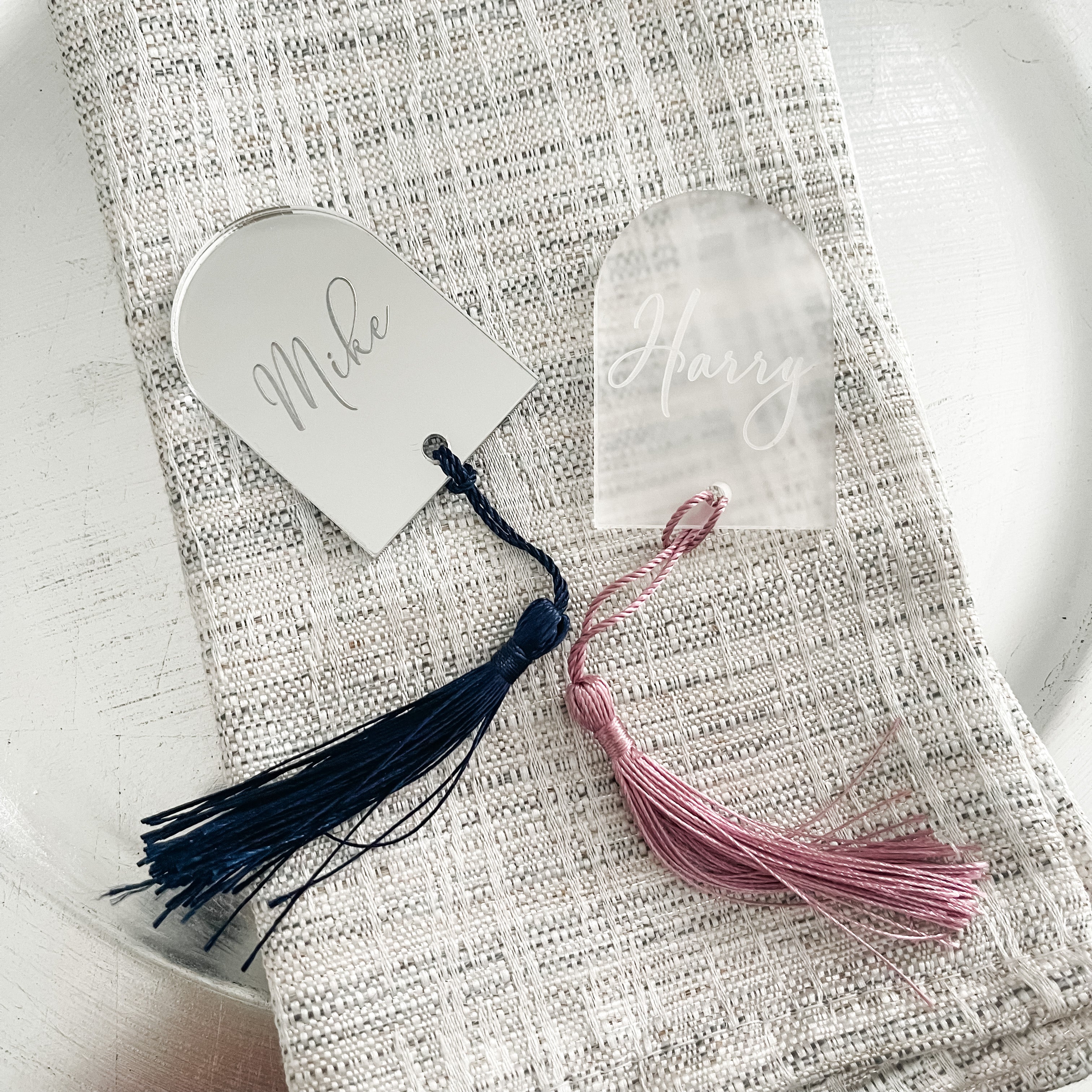 Indulge in the timeless glamour of our engraved arch top place names, adorned with a delicate tassel. Each place card bears a personalised guest name and is crafted from a selection of exquisite materials. For optimal elegance, we recommend pairing our frosted acrylic option with a rich, dark background to really see the engraving. Select from a range of sophisticated fonts to complete your luxurious table décor.