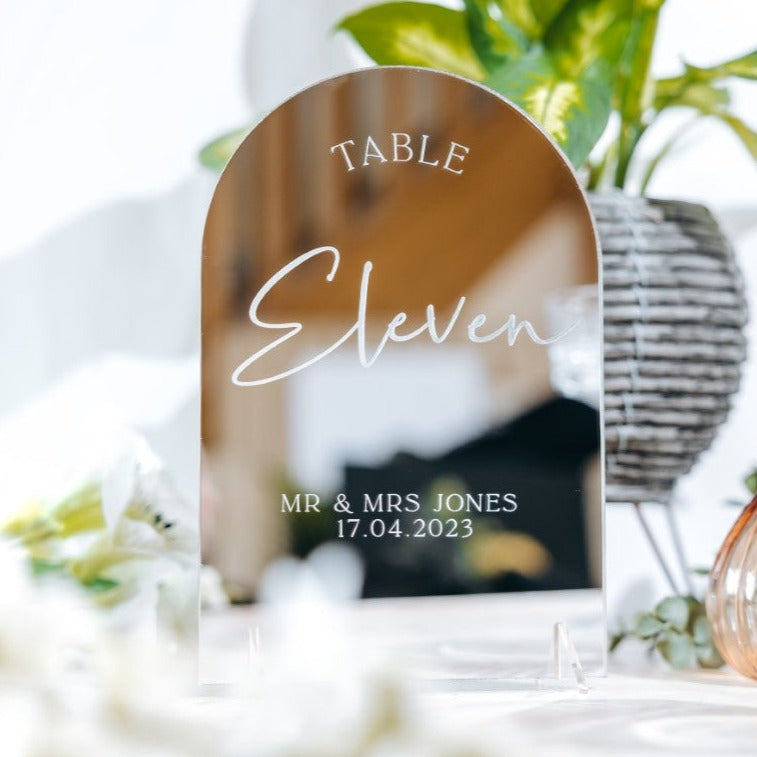Enhance your table setting with our exquisite personalised table numbers, handcrafted from 3mm acrylic with an elegant dome design. Each number comes with feet for effortless display and is available in a selection of opulent materials. While the frosted acrylic is a popular choice, its engraving truly shines when set against a darker backdrop. Choose from an array of refined fonts. Personalise with the special date and names of the happy couple. Elevate your event with our luxurious table numbers.