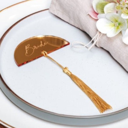 Enhance your event's elegance with our opulent mirror place card, featuring an engraved name and tassel. Available in a selection of luxurious finished, including the popular frosted acrylic but to truly appreciate the intricate engraving, showcase it against a darker backdrop. We offer a variety of sophisticated fonts to personalise each place card with your esteemed guests' names.