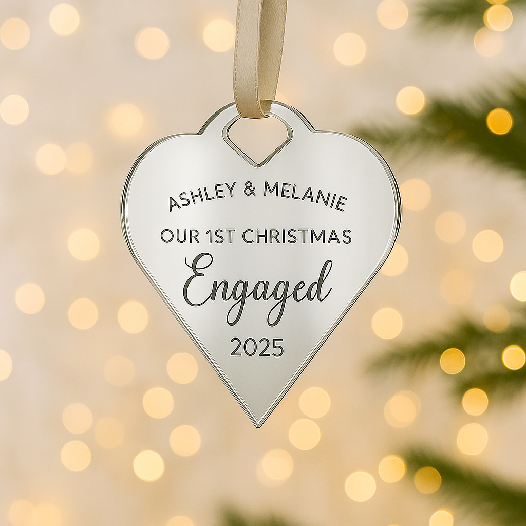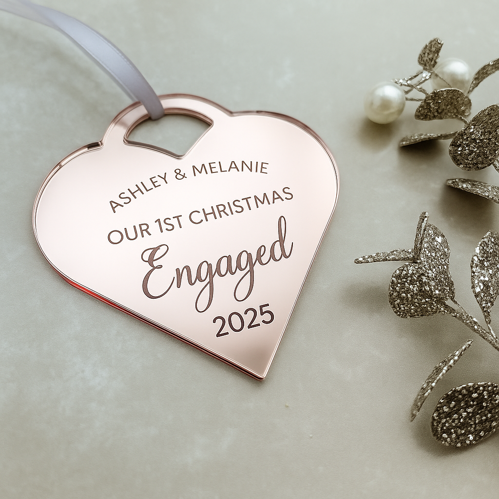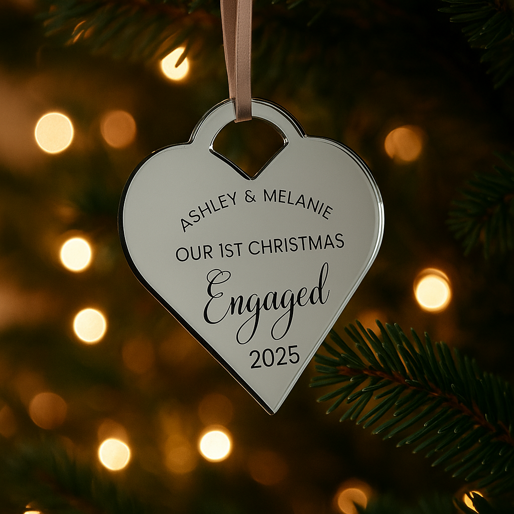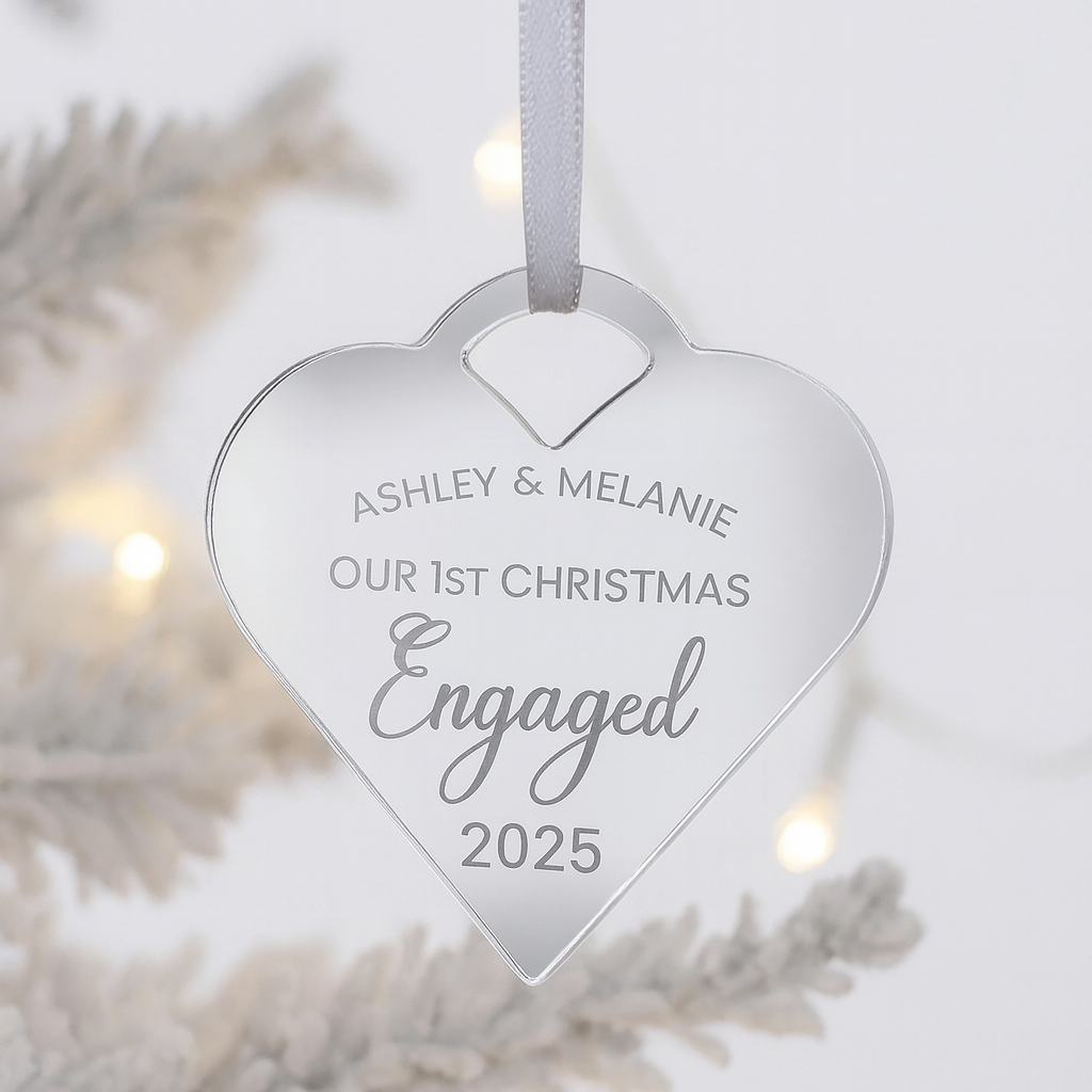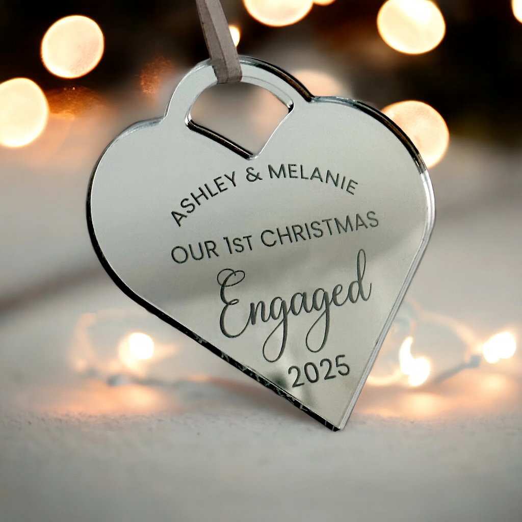 Experience the elegance of 'Our 1st Christmas Engaged' couples bauble, available in a variety of lustrous finishes and measuring approximately 8cm in diameter. Made from durable 3mm acrylic, this luxurious ornament comes with a basic grey ribbon for a tasteful finishing touch.