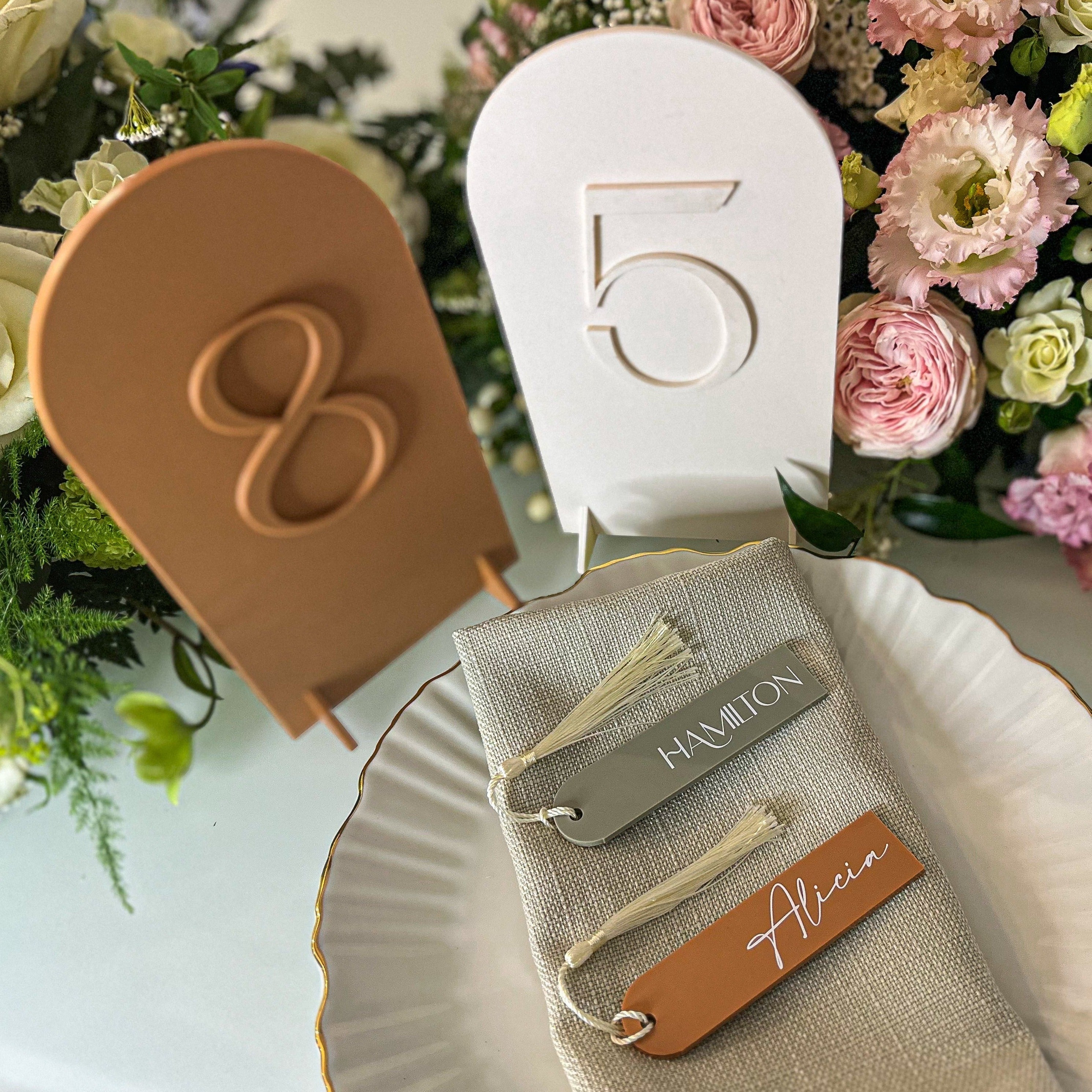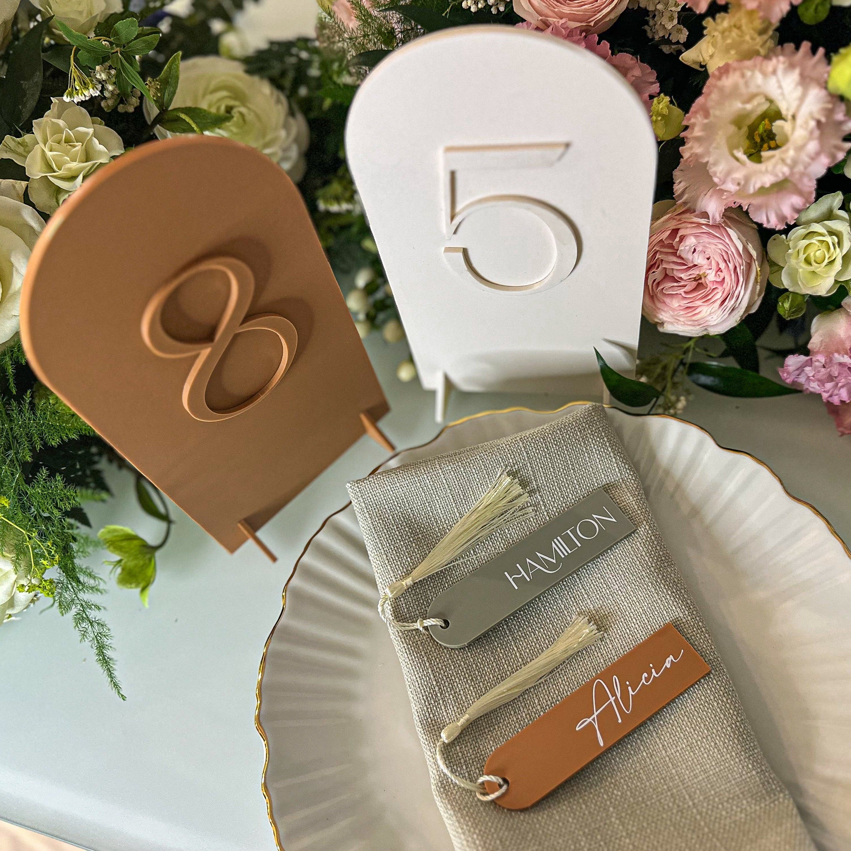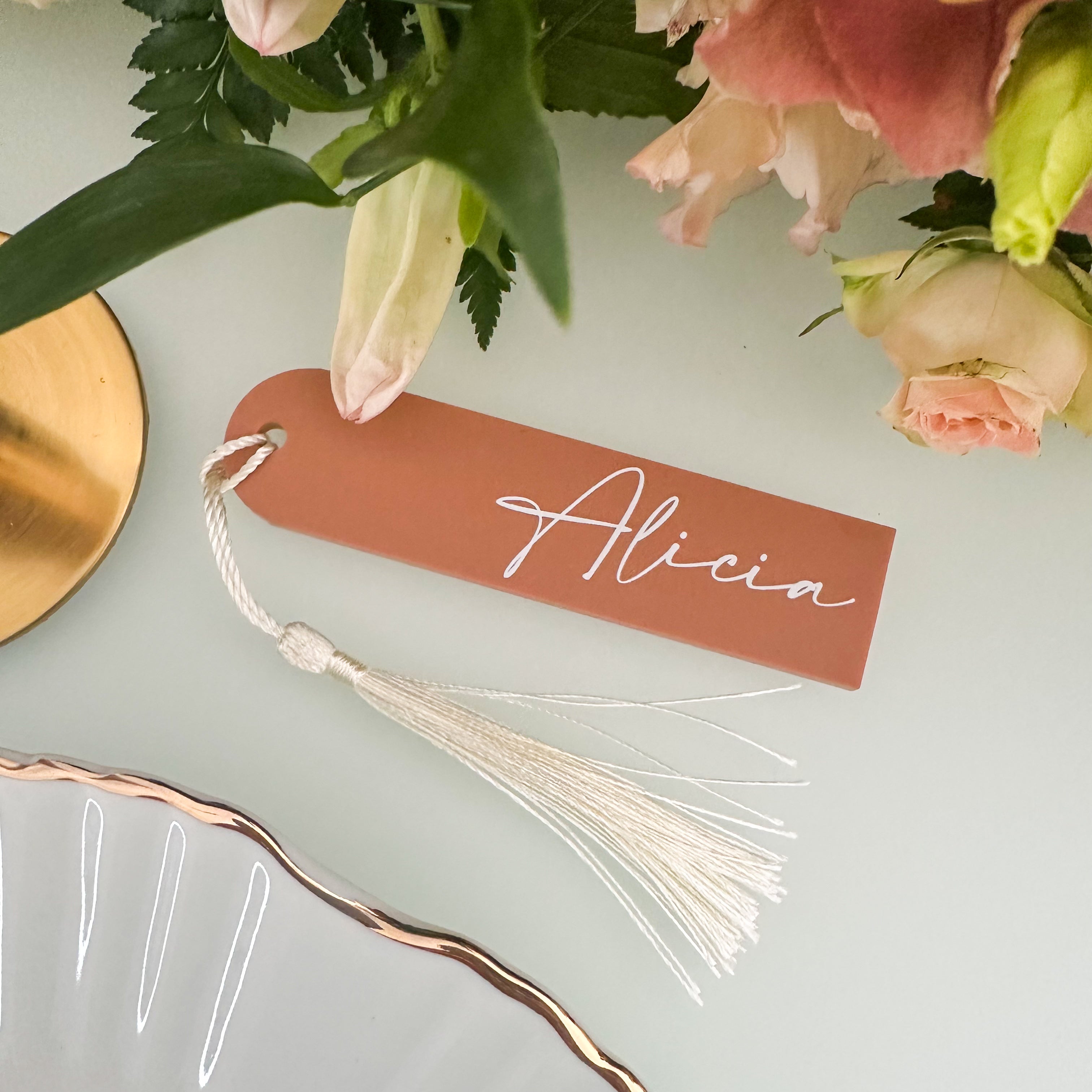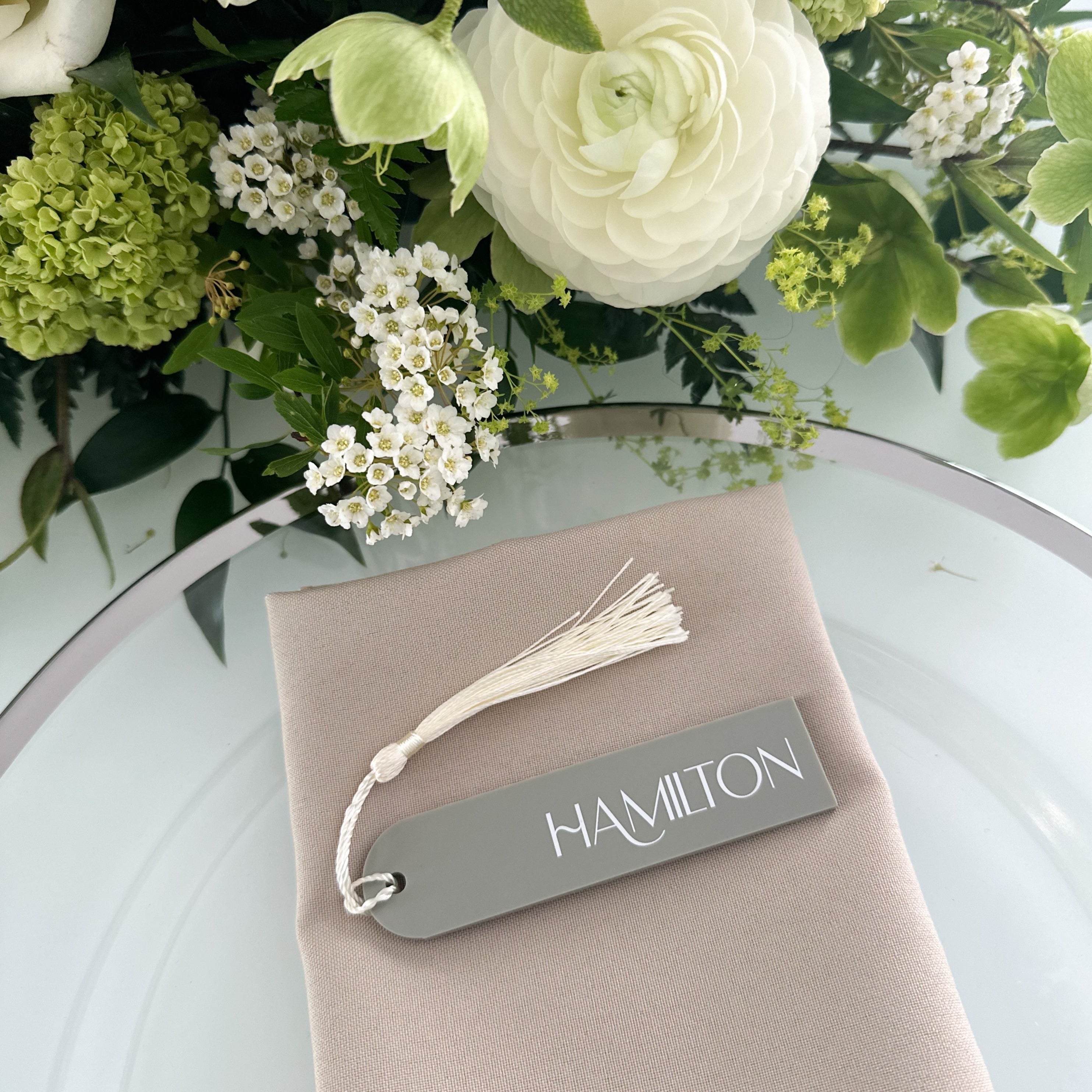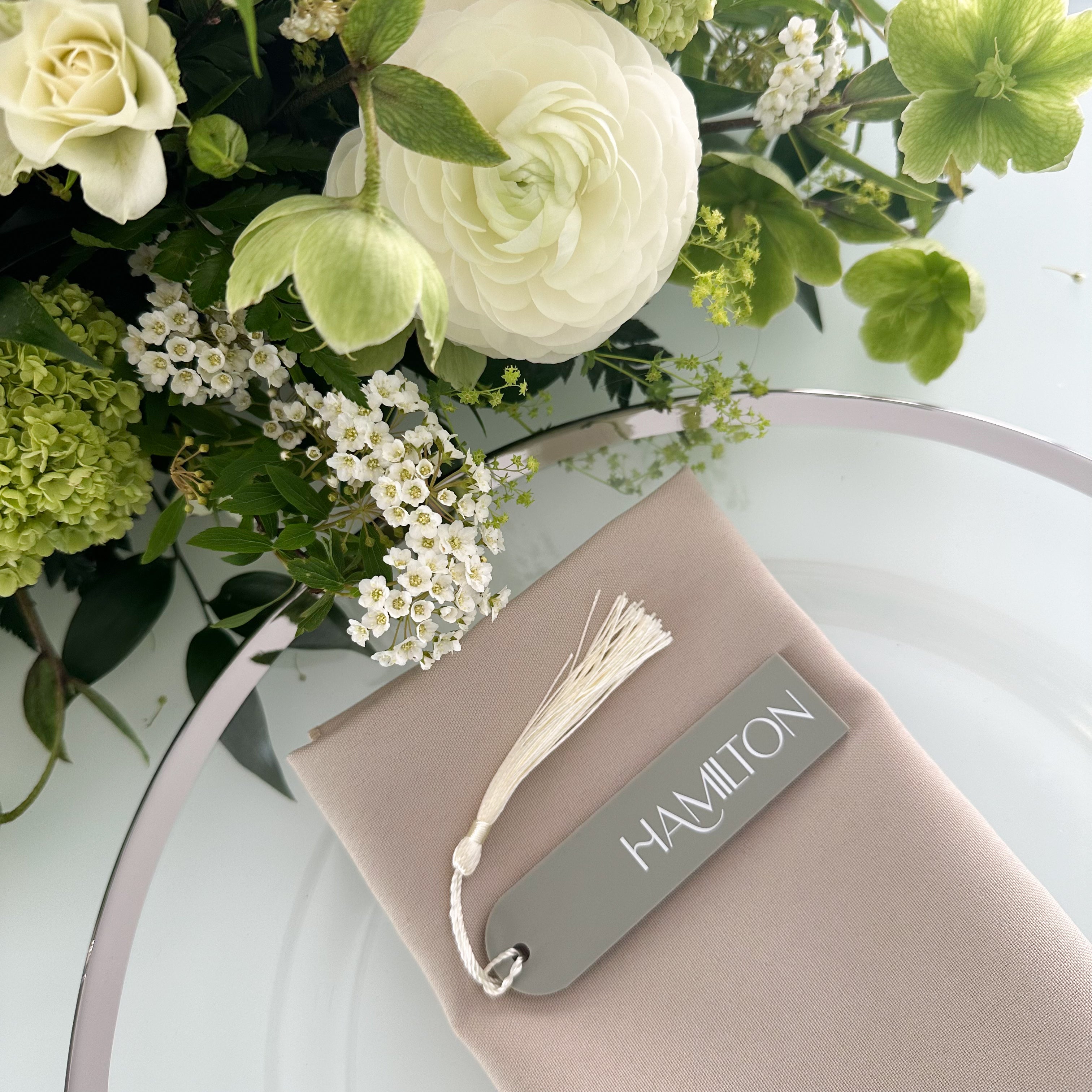 Introducing our Dusk Collection: elevate your event with our exquisite sage green wedding place cards adorned with silk tassels. These elegant acrylic cards add a touch of opulence and are available in a variety of colours to compliment your chosen colour scheme. Enhance the luxurious ambiance with our matching wedding decorations.