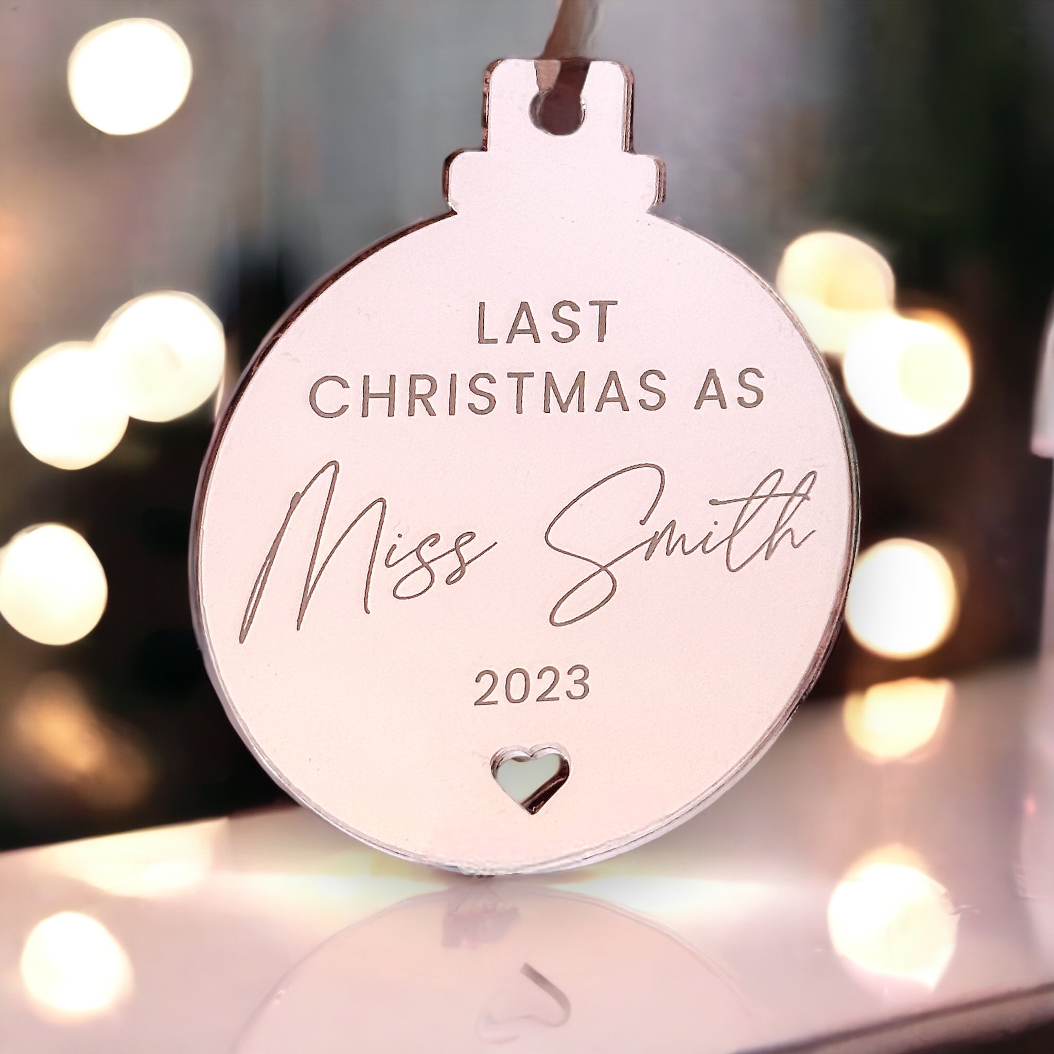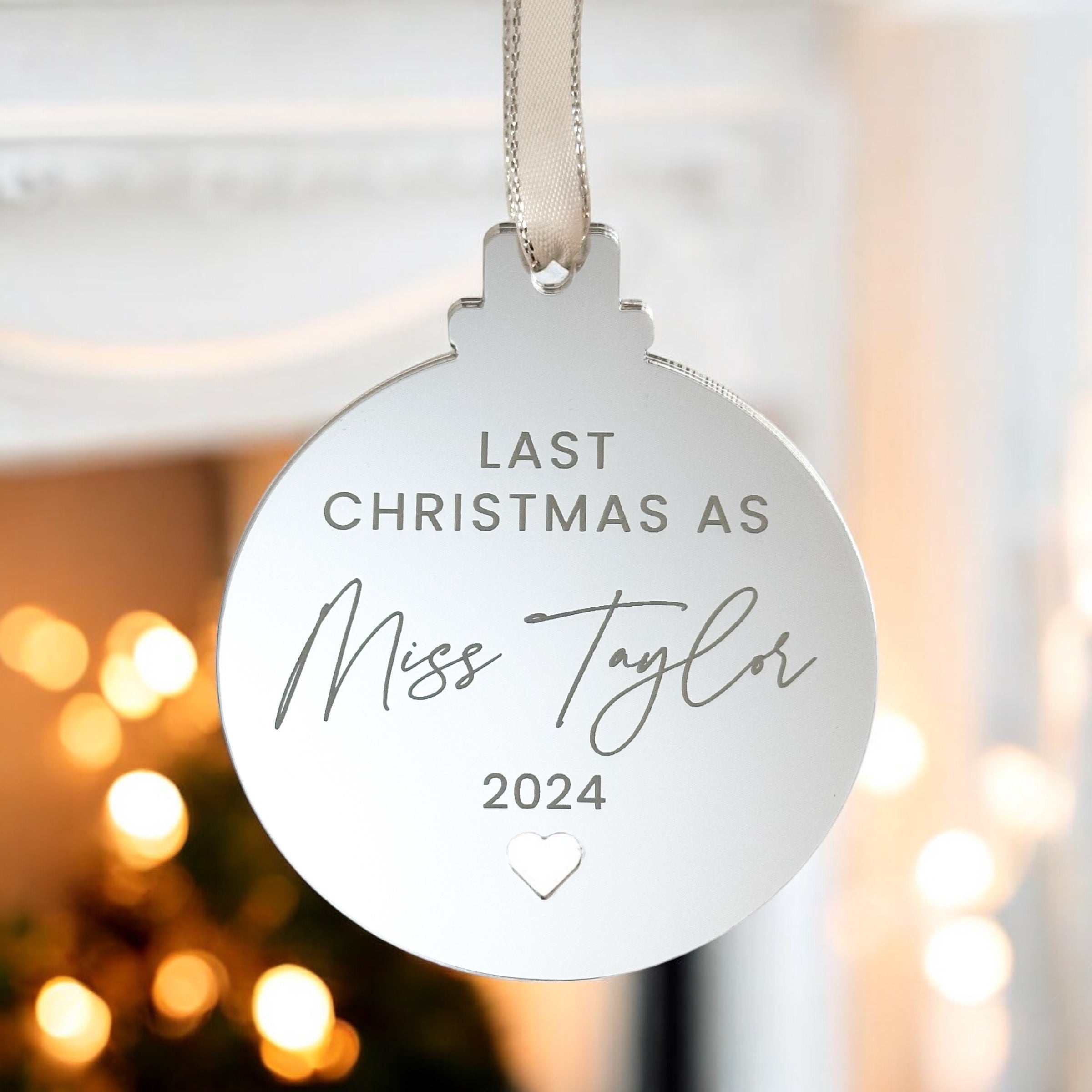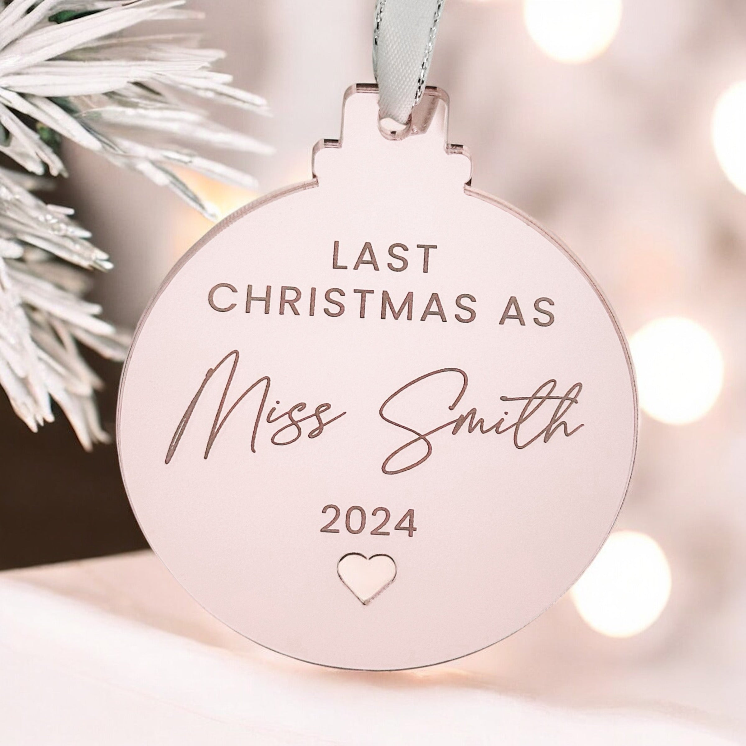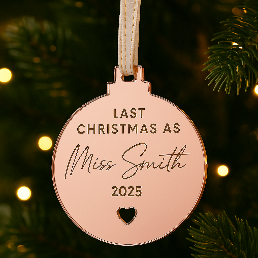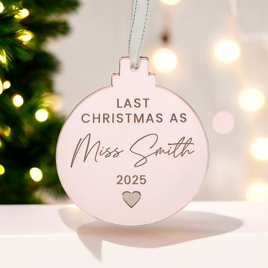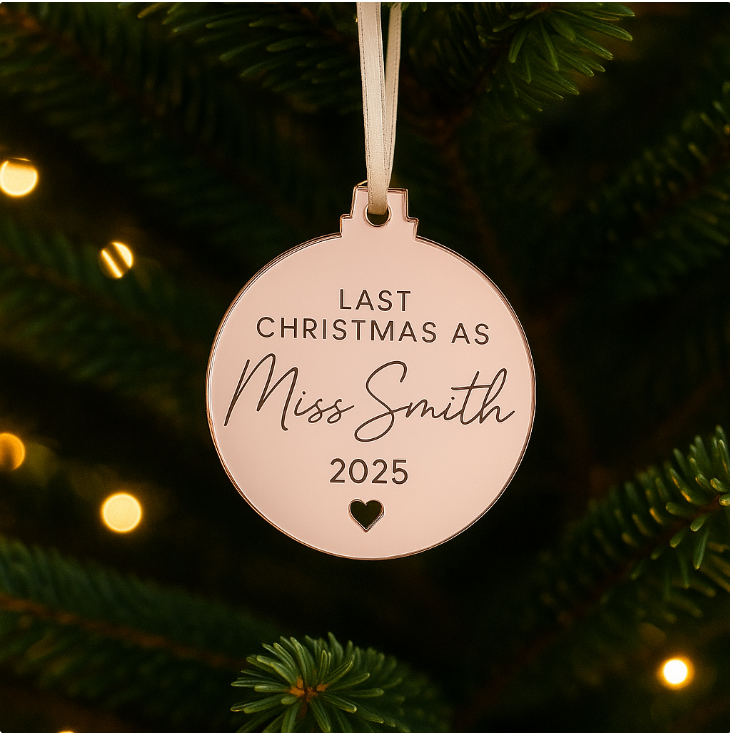 Experience your last Christmas as a Miss with our personalised engraved mirror bauble, available in 6cm, 8cm, or 10cm sizes and a variety of finishes. Crafted from 3mm acrylic and adorned with a basic grey ribbon, this exclusive ornament will add a touch of elegance and sophistication to your festive décor.