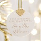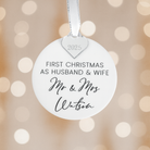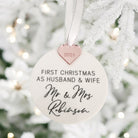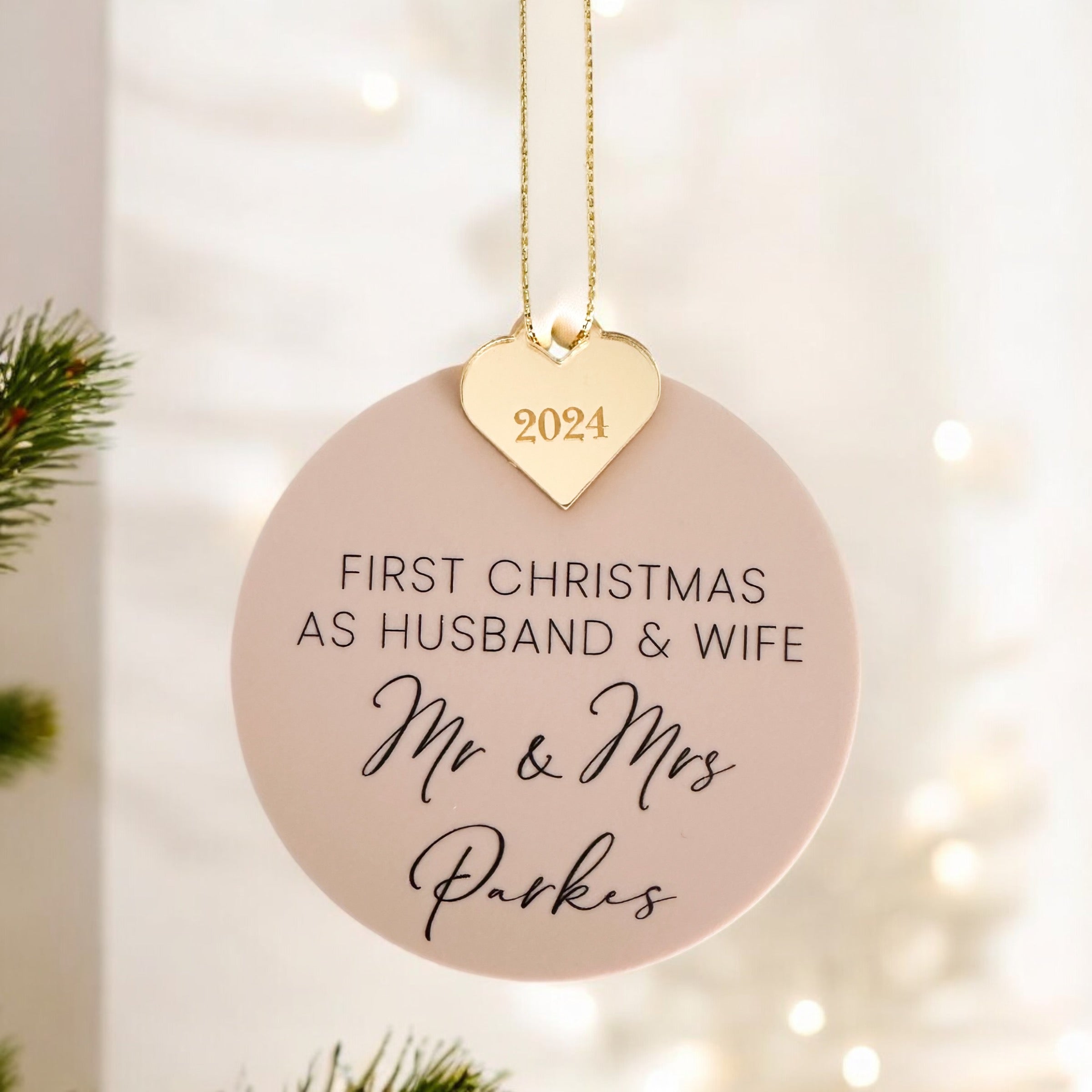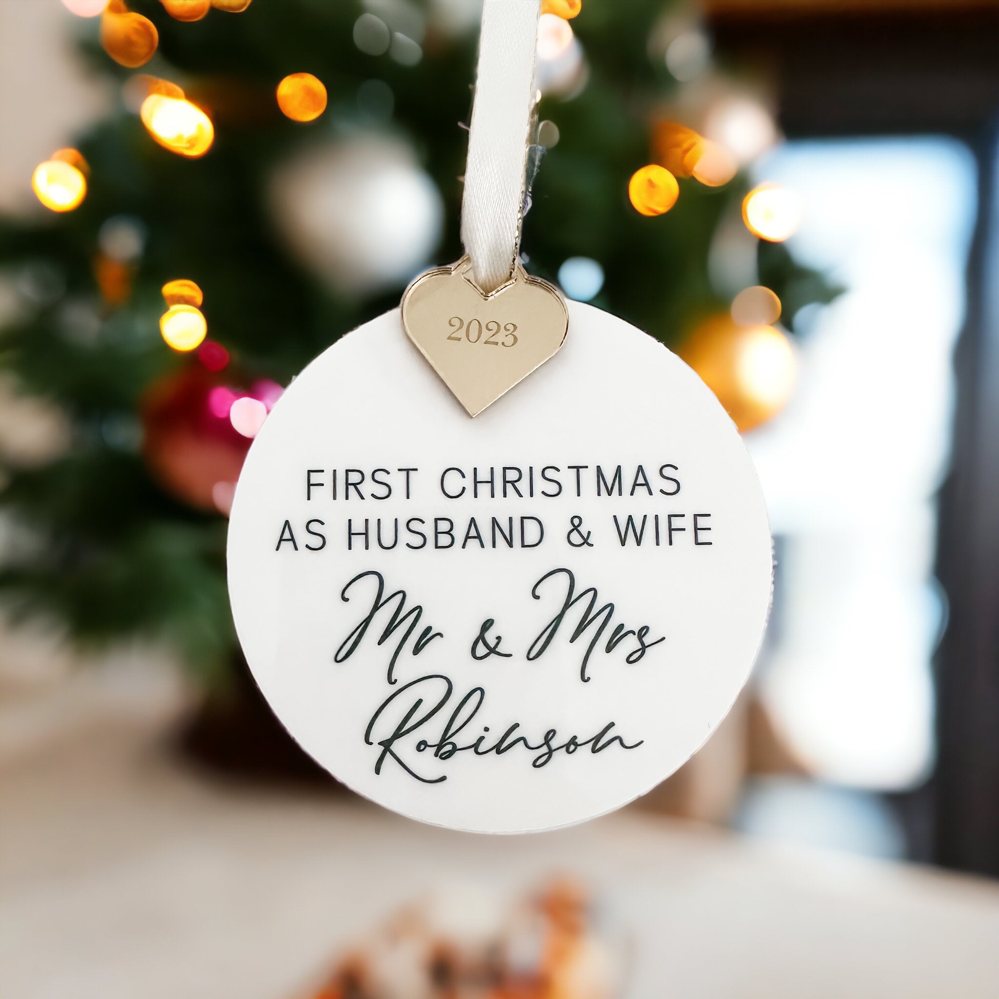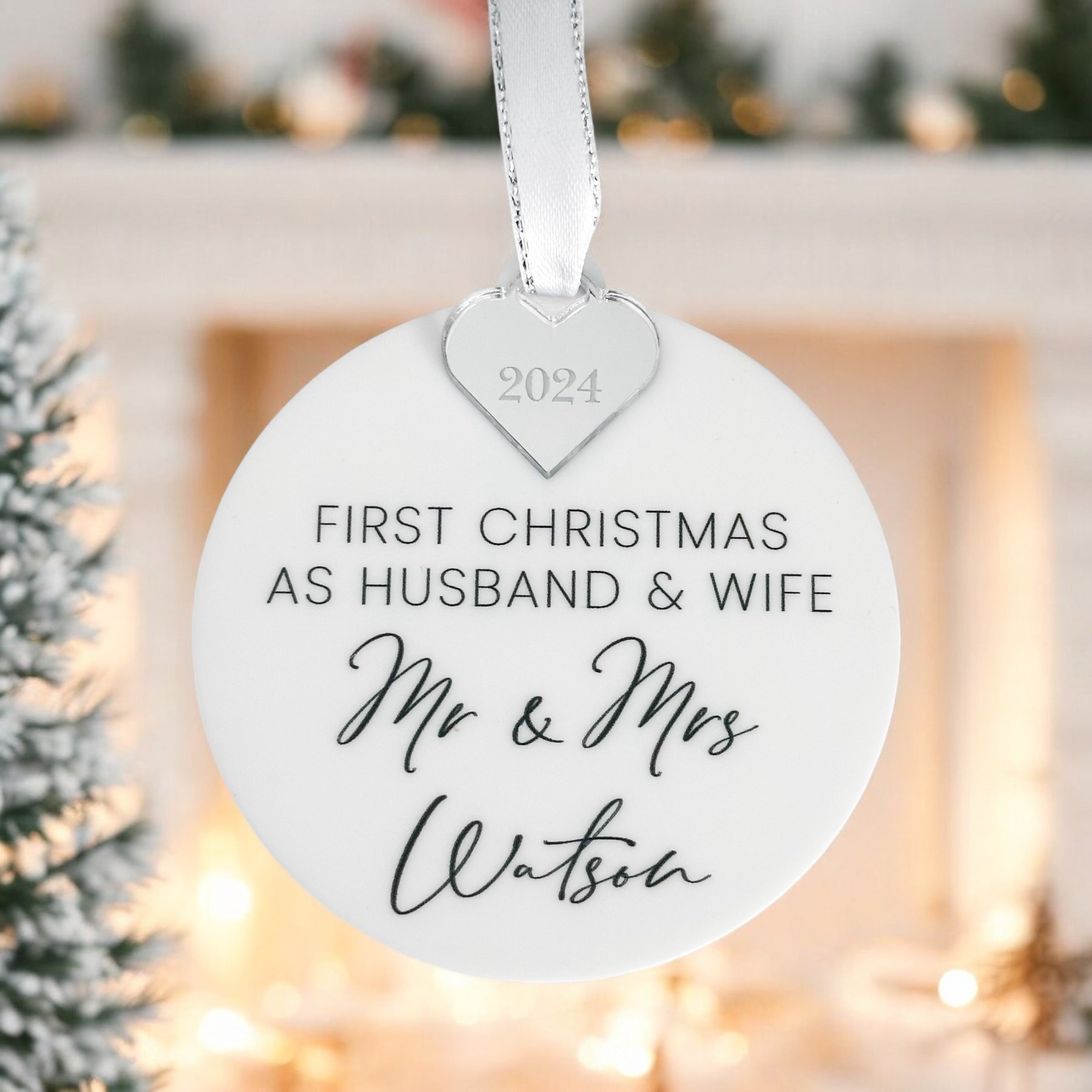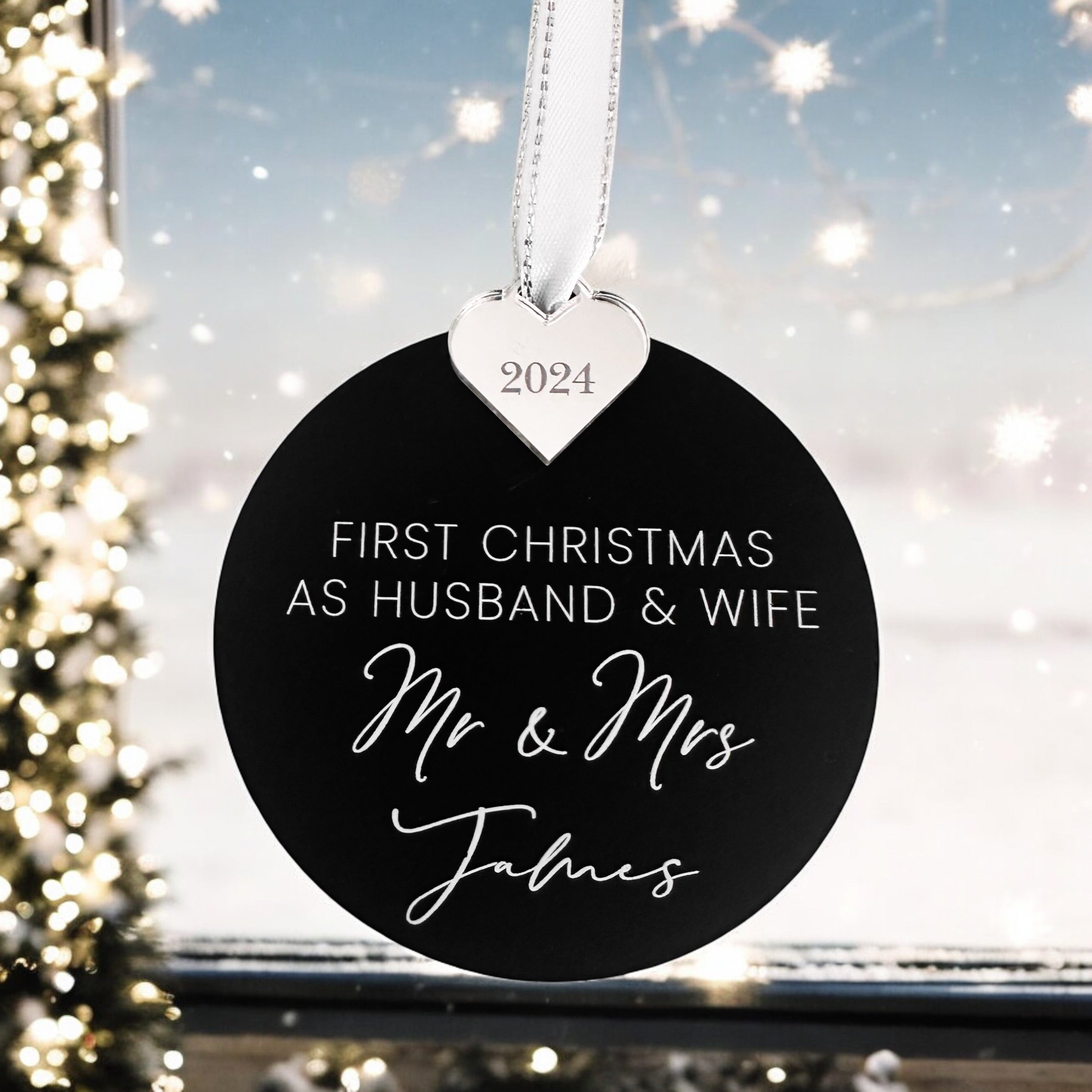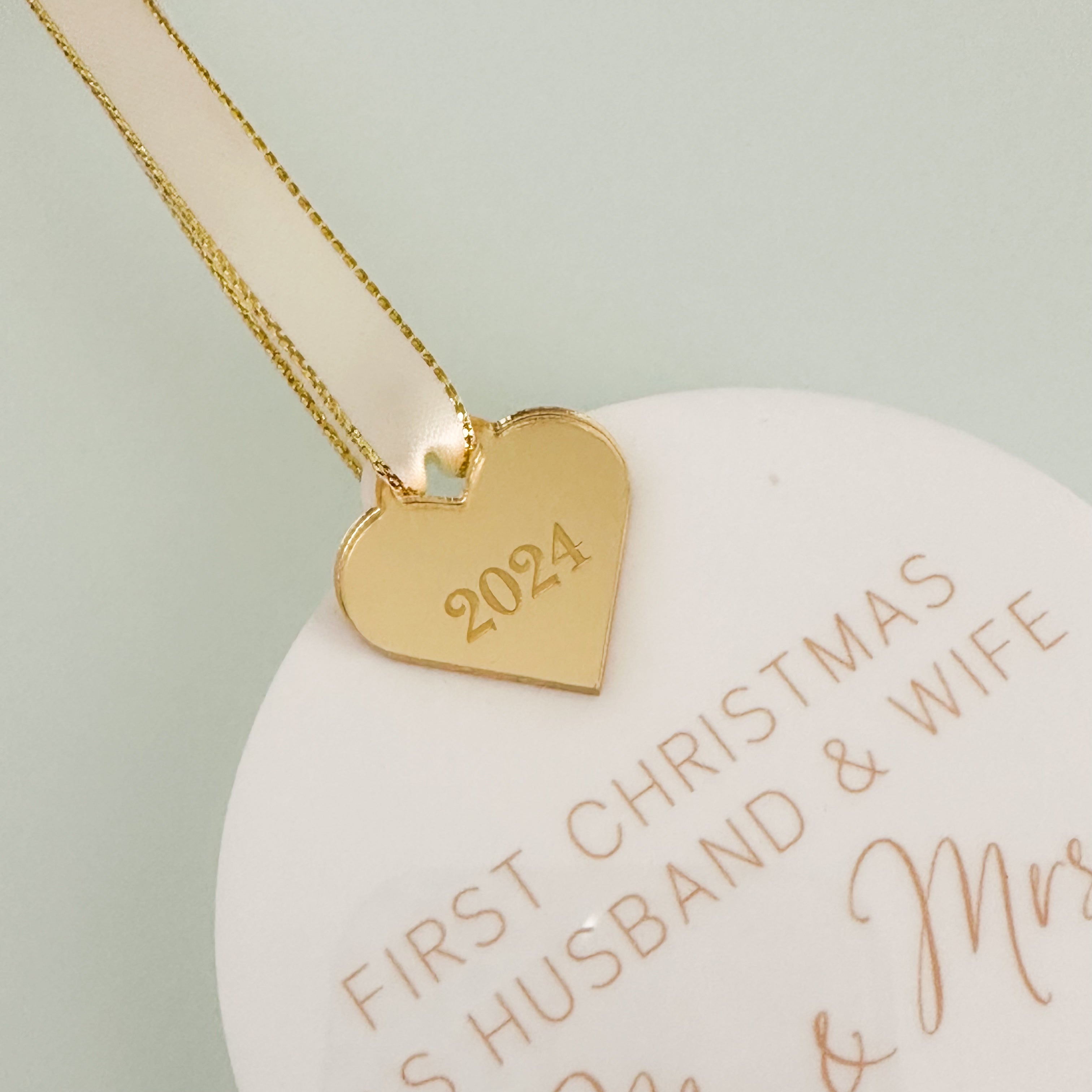 Celebrate your first Christmas as a married couple with our exquisite personalised bauble. Measuring 8cm/3.15" in diameter, this beautiful piece is crafted from 3mm acrylic and mirror acrylic, available in a range of finishes including stunning silver, lavish gold, or romantic rose gold with an engraved heart. A luxurious touch is added with a delicate grey ribbon, included separately.