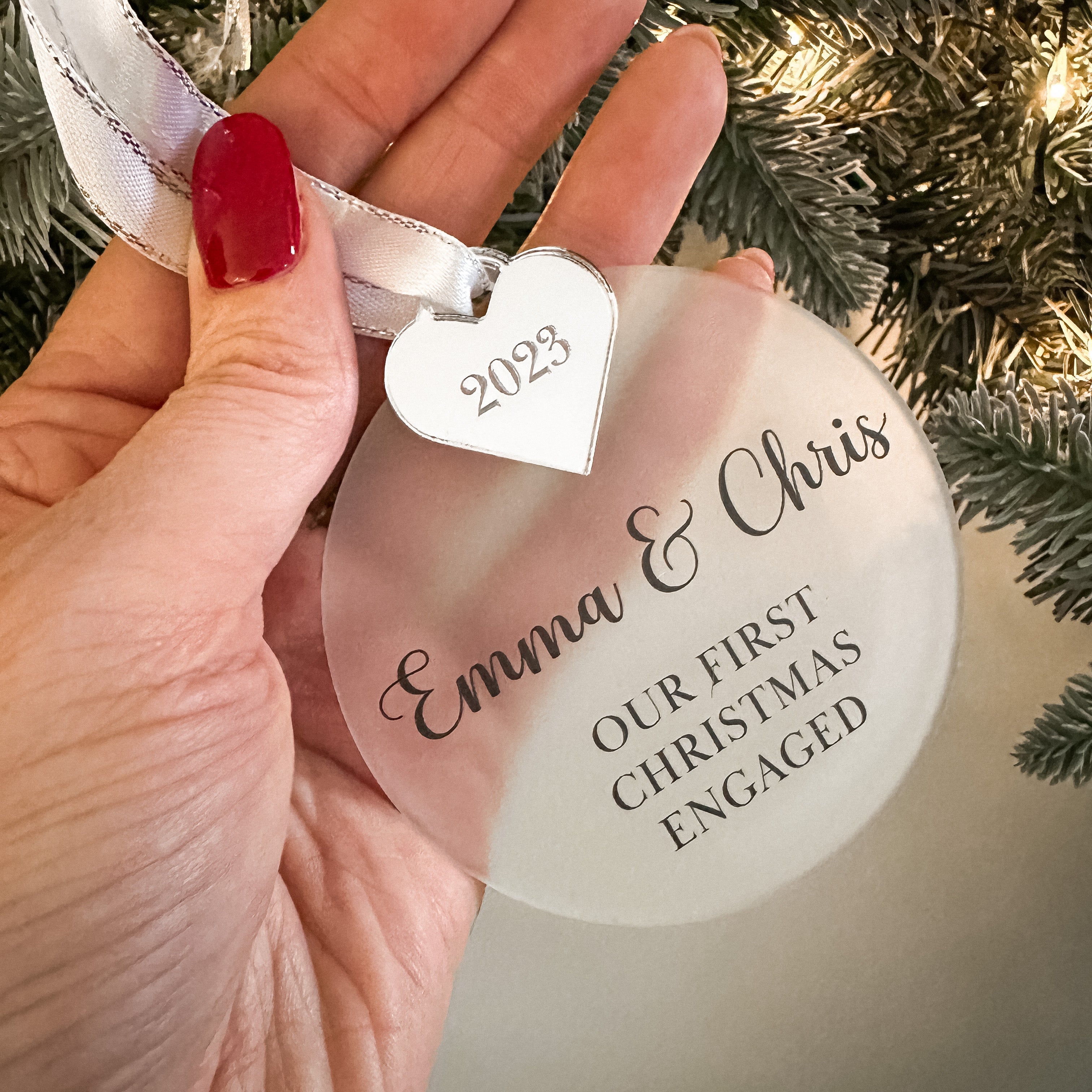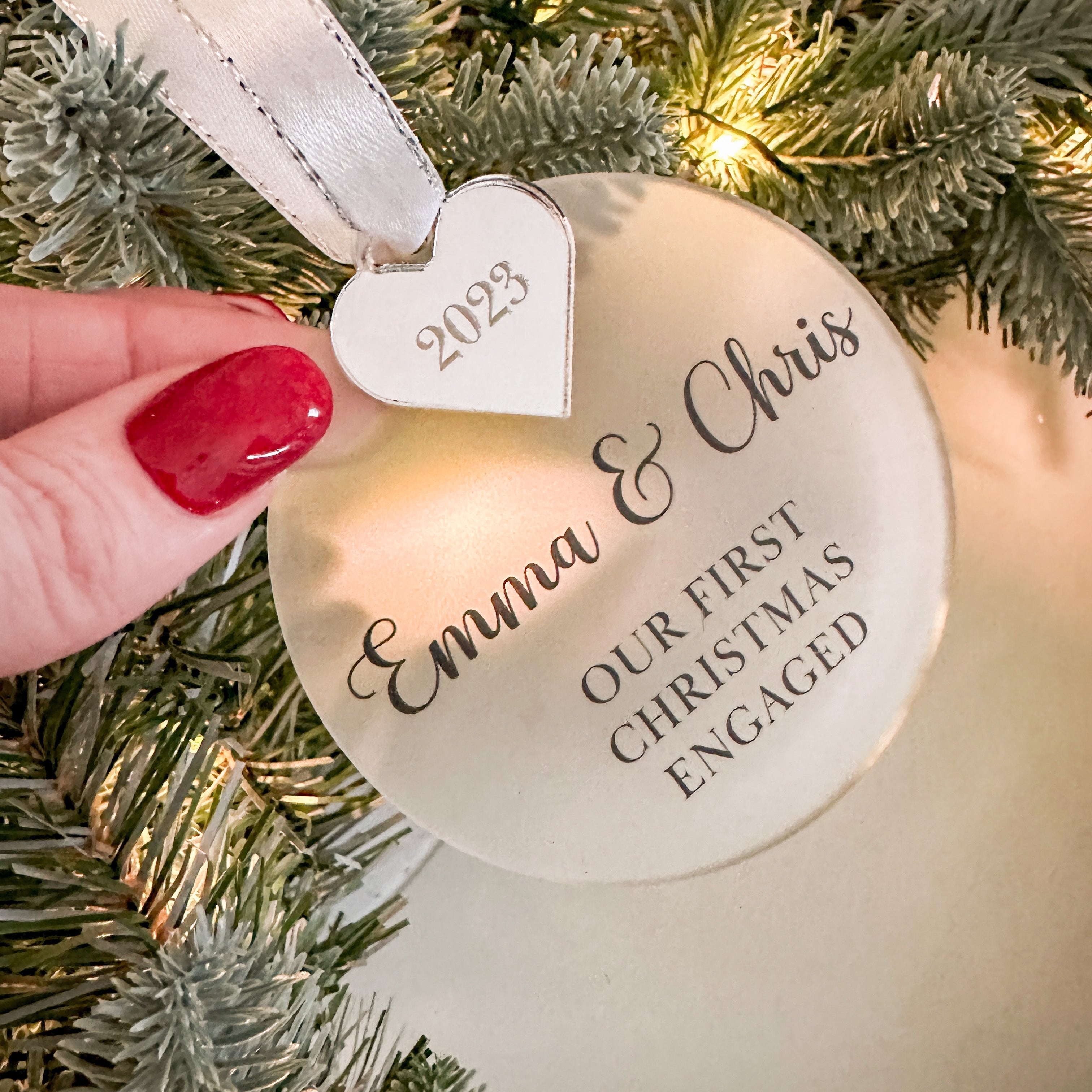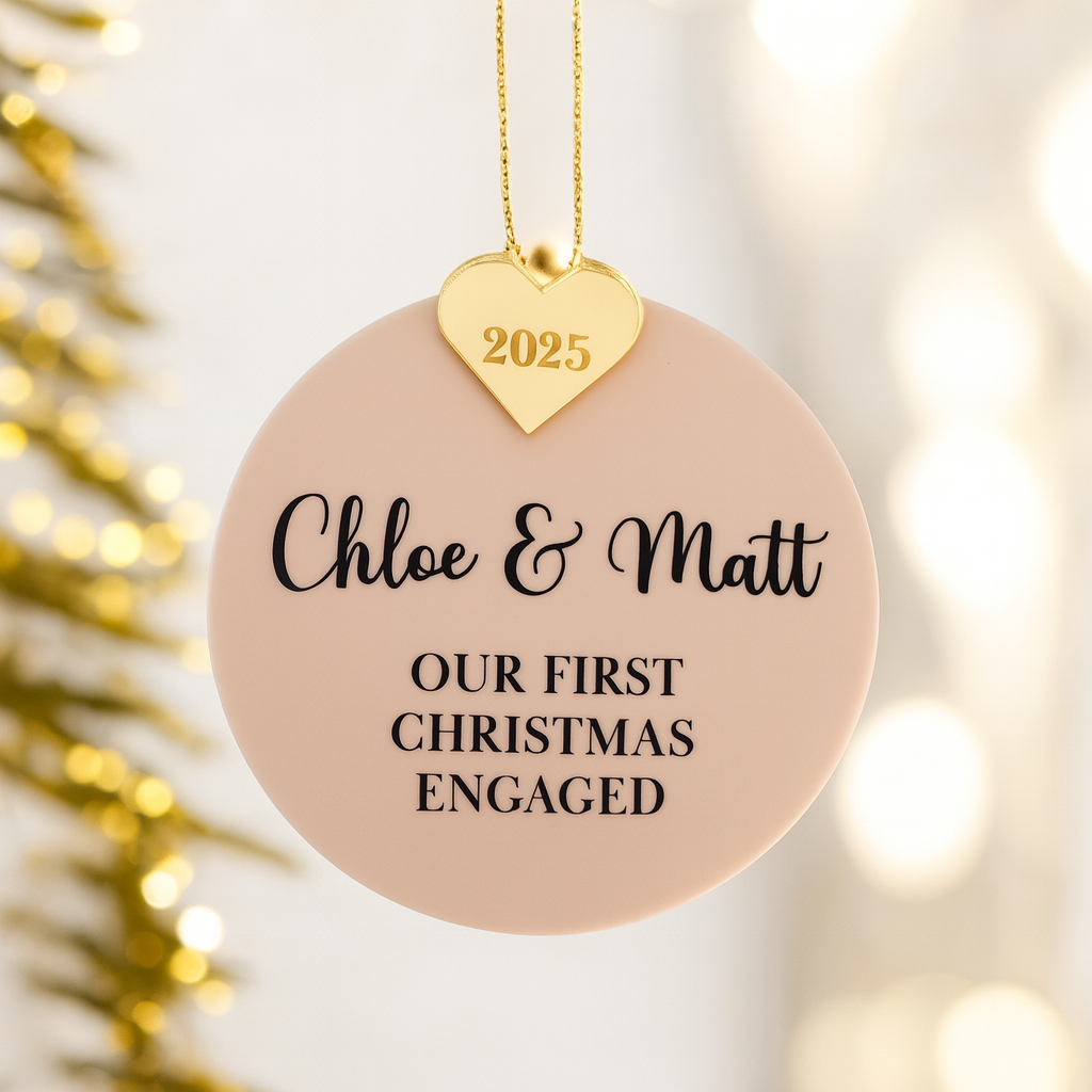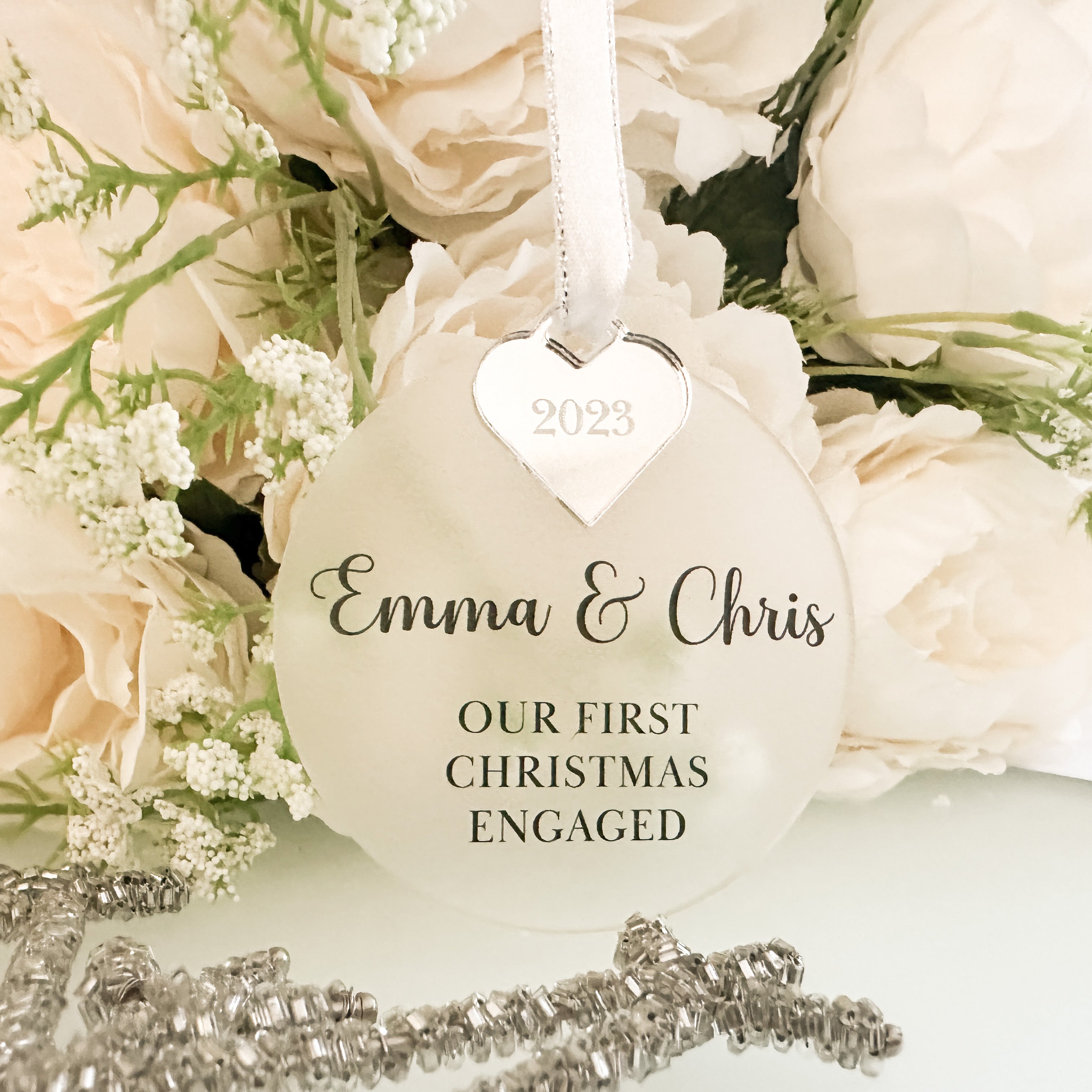 Celebrate your first Christmas engaged with our exquisite personalised bauble. Measuring 8cm/3.15" in diameter, this beautiful piece is crafted from 3mm acrylic and mirror acrylic, available in a range of finishes including stunning silver, lavish gold, or romantic rose gold with an engraved heart. A luxurious touch is added with a delicate grey ribbon, included separately.