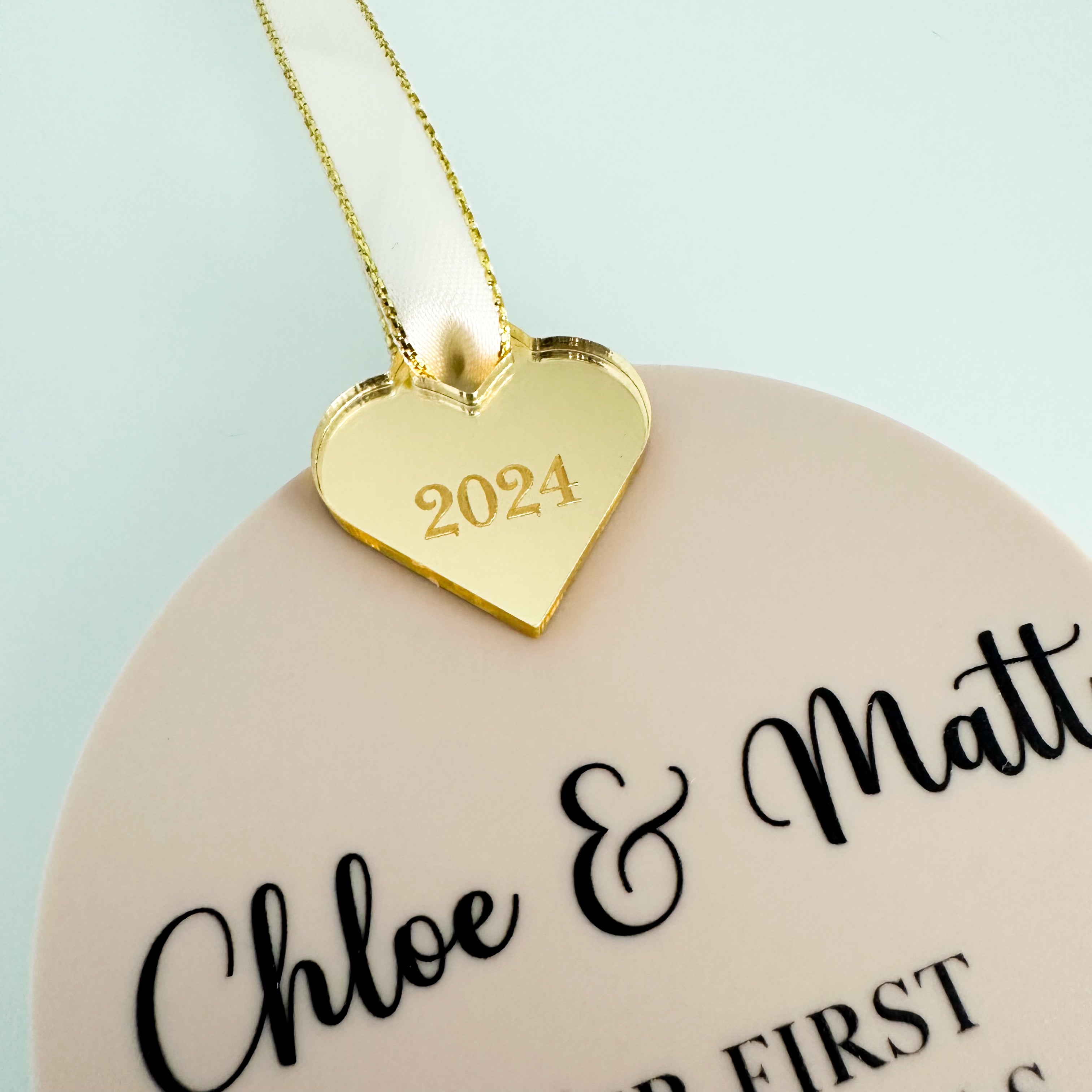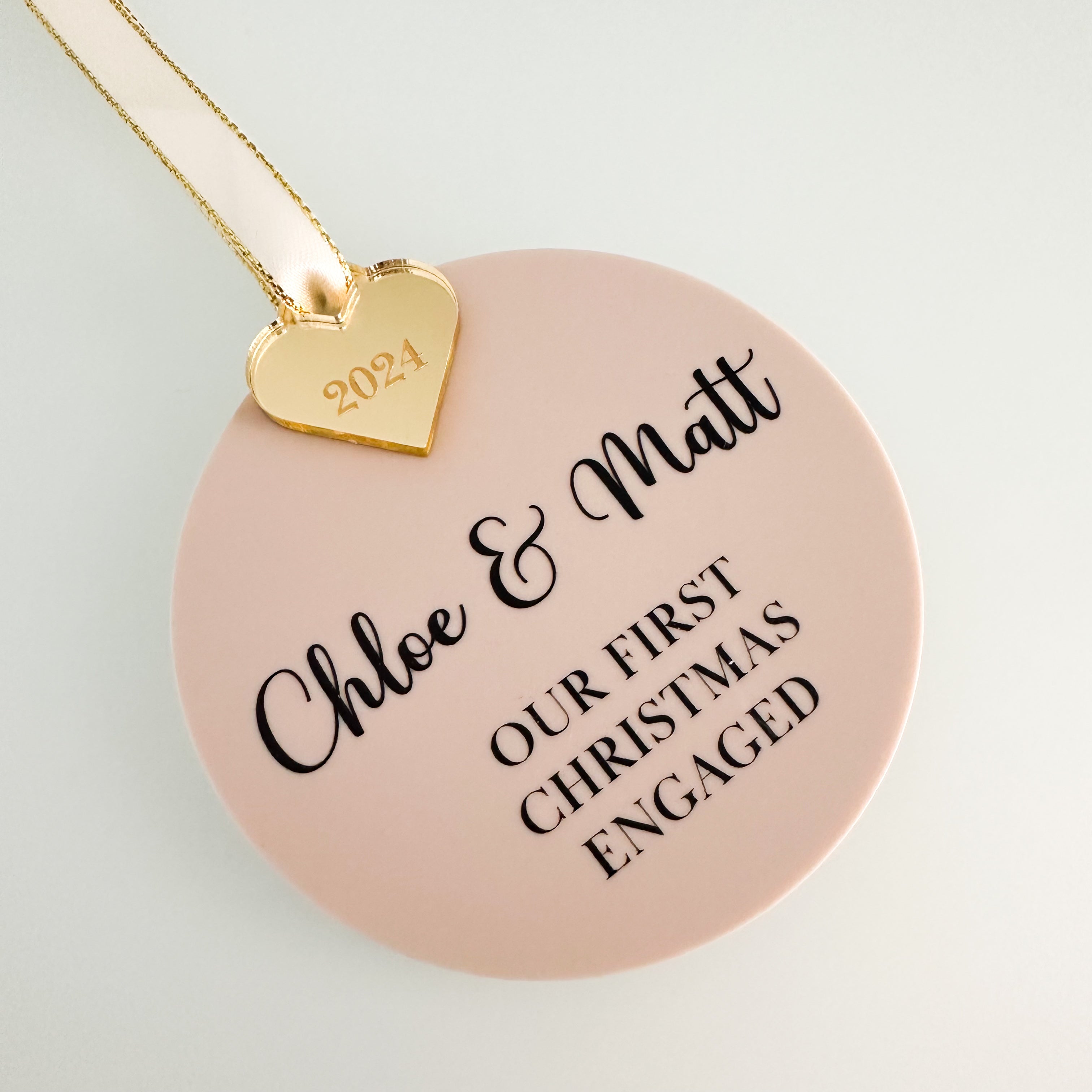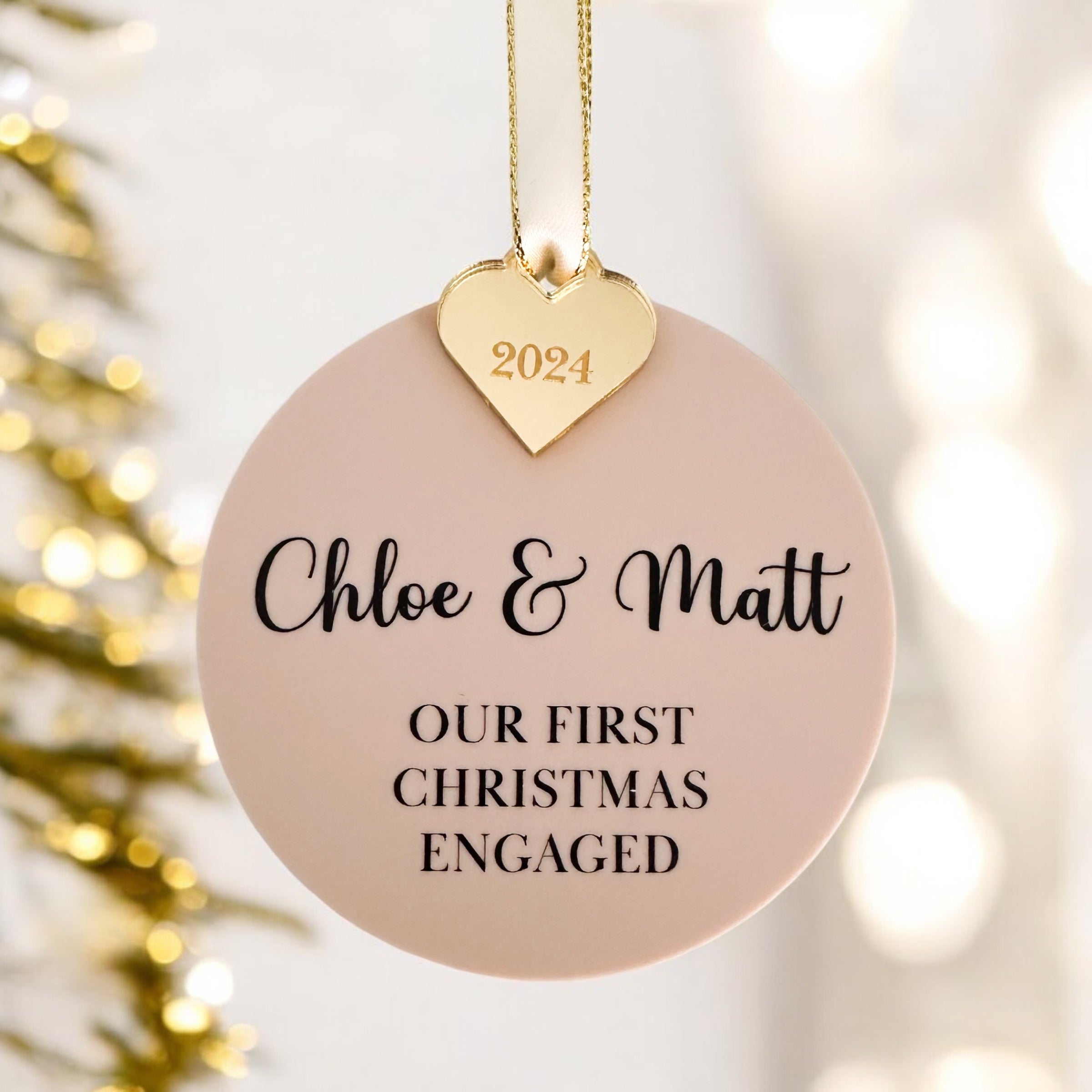 Celebrate your first Christmas engaged with our exquisite personalised bauble. Measuring 8cm/3.15" in diameter, this beautiful piece is crafted from 3mm acrylic and mirror acrylic, available in a range of finishes including stunning silver, lavish gold, or romantic rose gold with an engraved heart. A luxurious touch is added with a delicate grey ribbon, included separately.