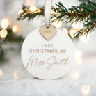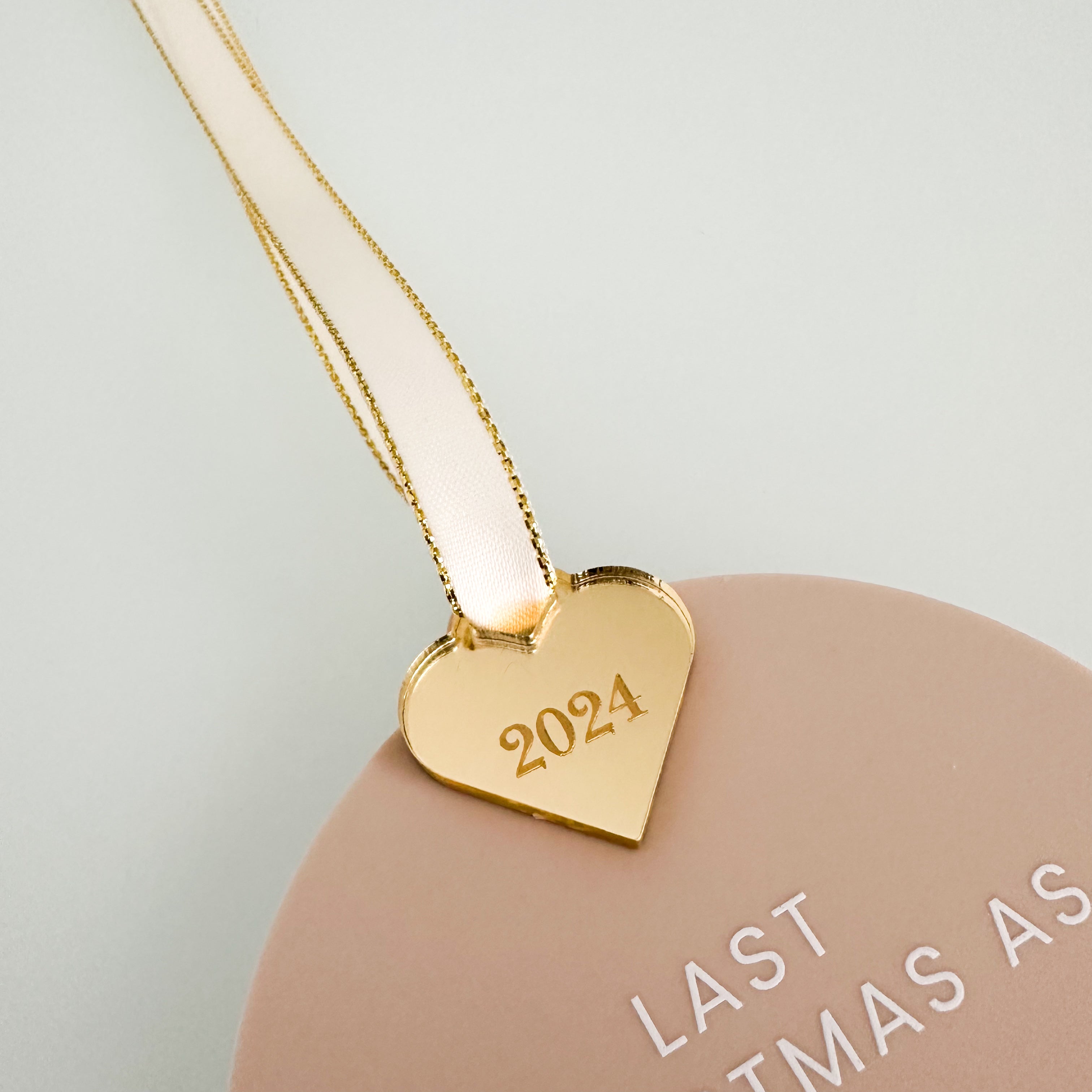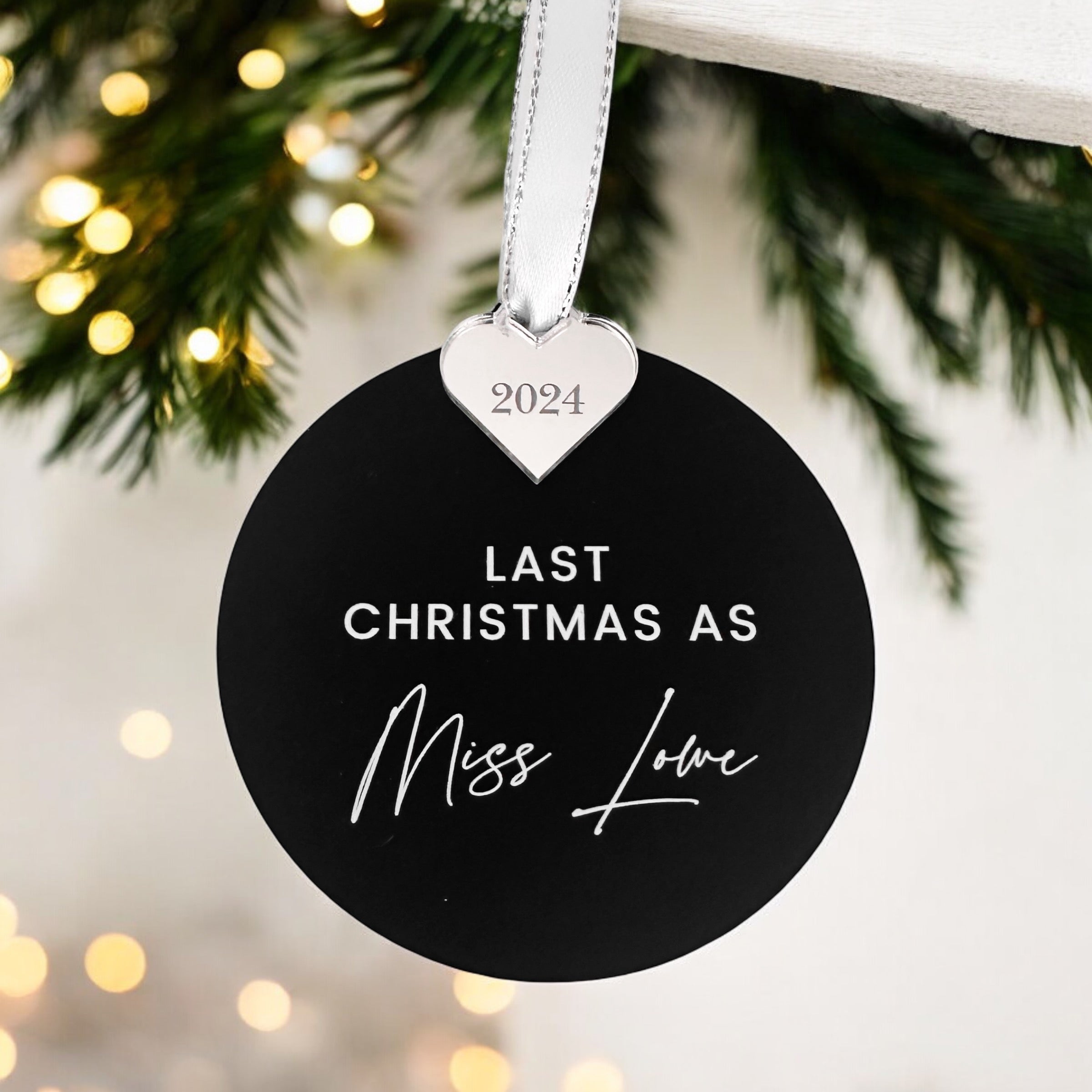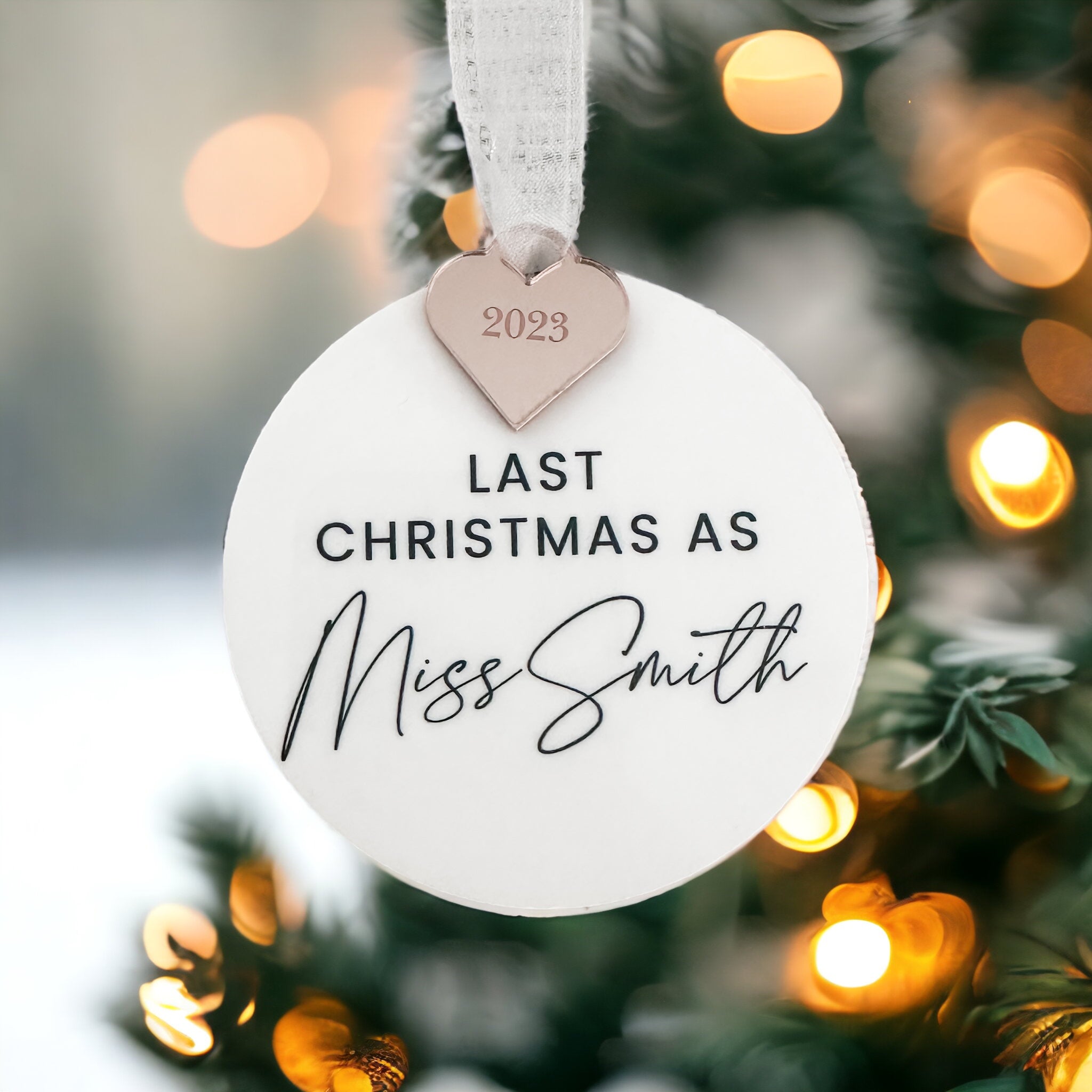 The Last Christmas as a Miss personalised bauble is a luxurious and exclusive Christmas bauble for the bride-to-be. Its approximate diameter is 8cm and it is crafted from 3mm acrylic and mirror acrylic, available in various finishes along with either a silver, gold, and rose gold engraved heart and comes with a basic ribbon for easy hanging.