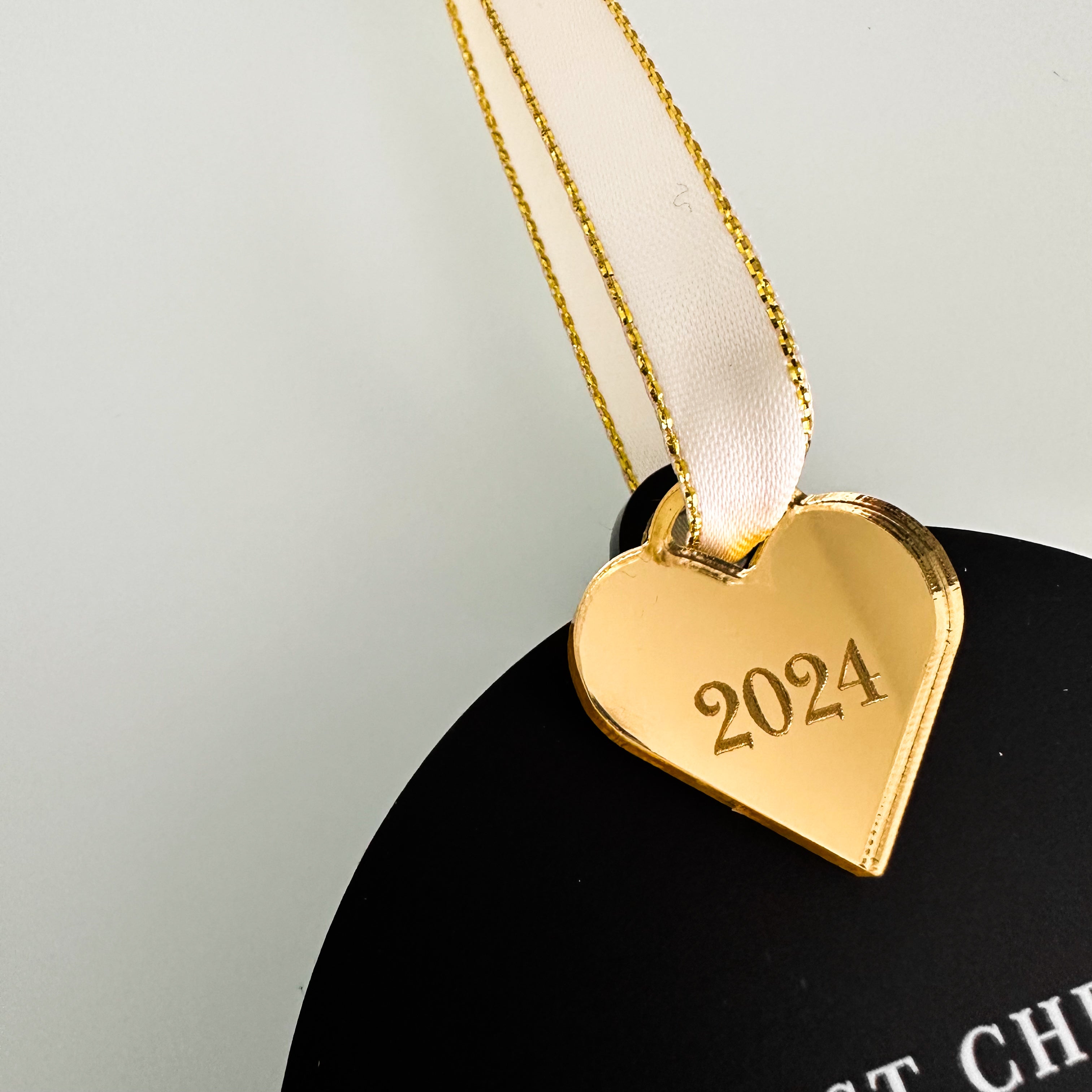 Celebrate your first Christmas as a married couple with our exquisite personalised bauble. Measuring 8cm/3.15" in diameter, this beautiful piece is crafted from 3mm acrylic and mirror acrylic, available in a range of finishes including stunning silver, lavish gold, or romantic rose gold with an engraved heart. A luxurious touch is added with a delicate grey ribbon, included separately.