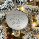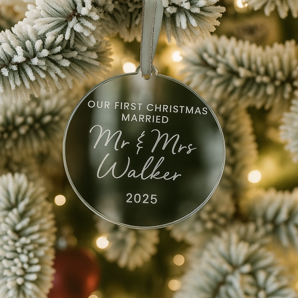 Elevate your festive décor with our exquisite 'Our First Christmas Married' bauble, available in multiple finishes. Select from 6cm, 8cm, or 10cm sizes of luxurious 3mm acrylic. A basic grey ribbon is included separately for easy display.