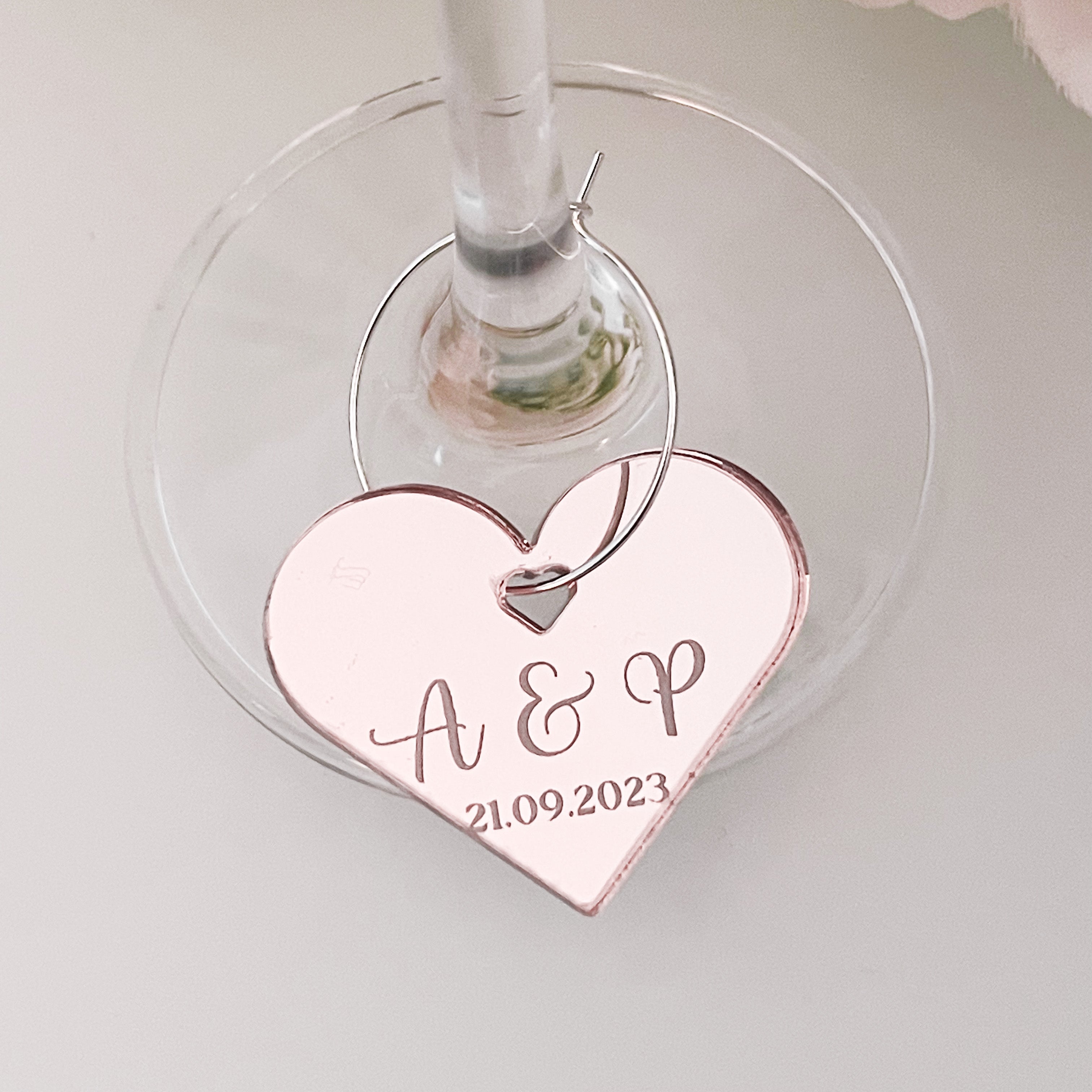 Indulge in exquisite elegance with our heart drinks charms, measuring approximately 36mm x 30mm and crafted from 3mm acrylic. Simply adorn your glass stem with these charms to elevate your drinking experience. Choose from a variety of luxurious materials, including the popular frosted acrylic. For optimal visual impact, we recommend pairing this option with a darker background. Each charm is engraved with the couples' initials and event date.