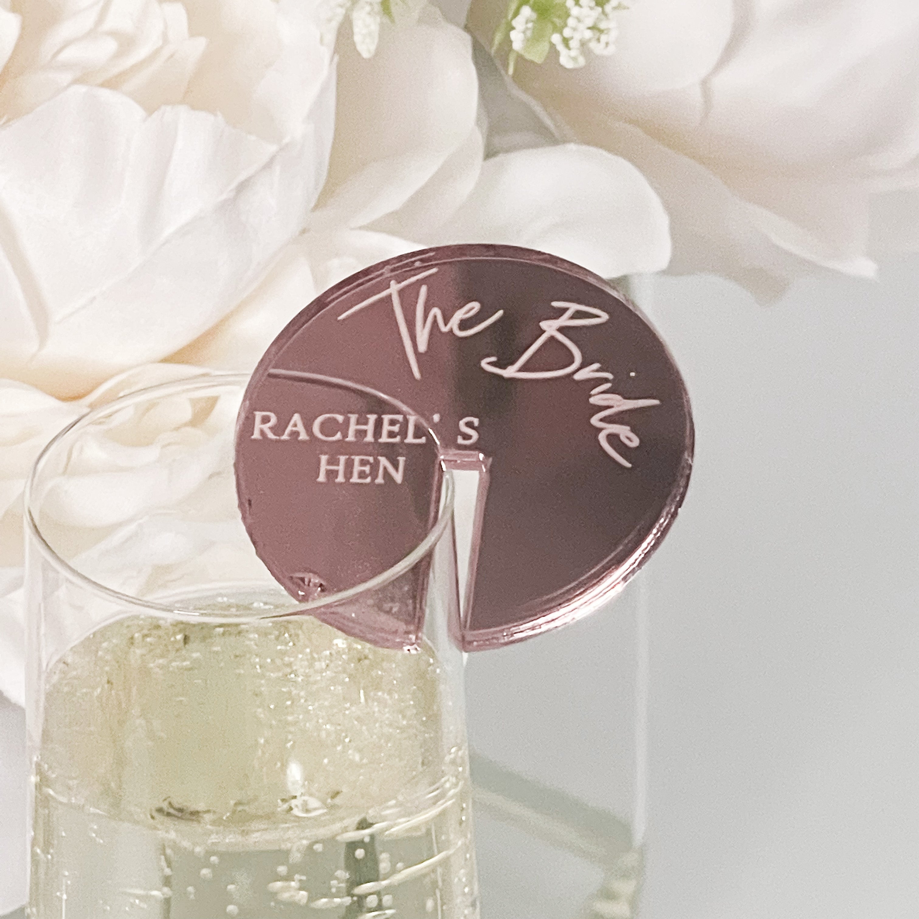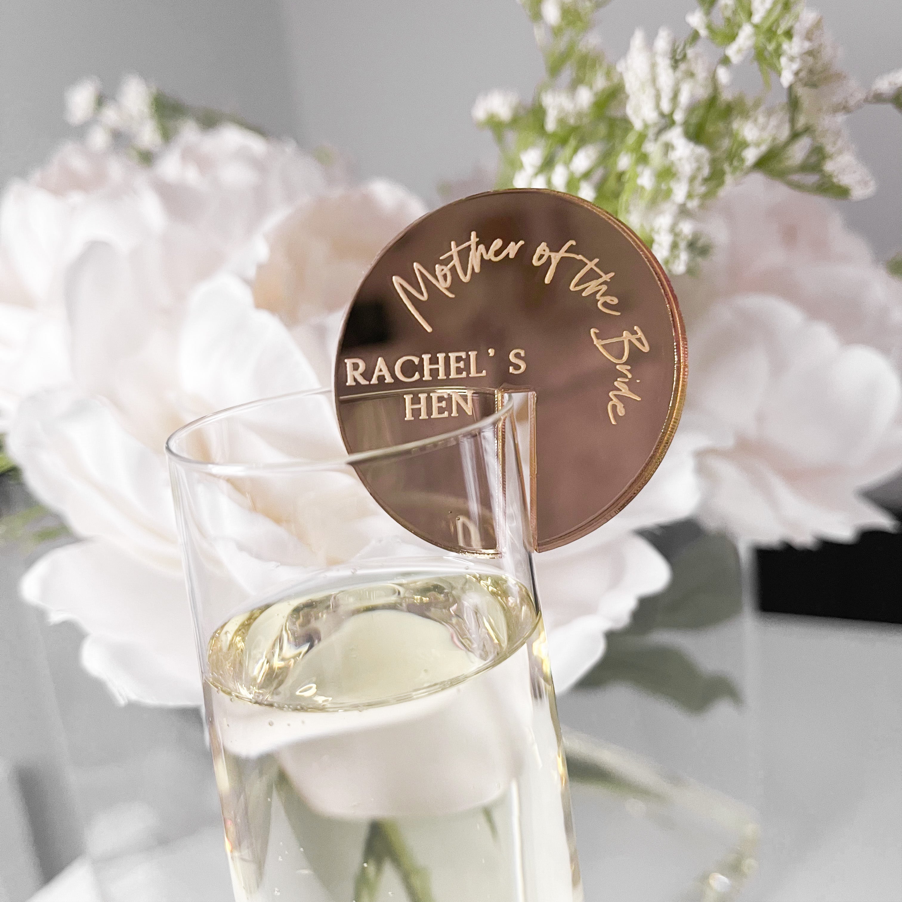 Elevate your hen party with our custom-made drinks charms made from 3mm acrylic. Choose from a range of high-quality materials to create a sophisticated experience. While the frosted acrylic option is a popular choice, we recommend using a darker background to fully appreciate the intricate engraving. Each charm is personalised with the names of your guests, adding a touch of sophistication to your event.