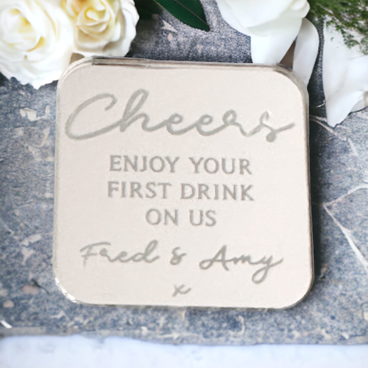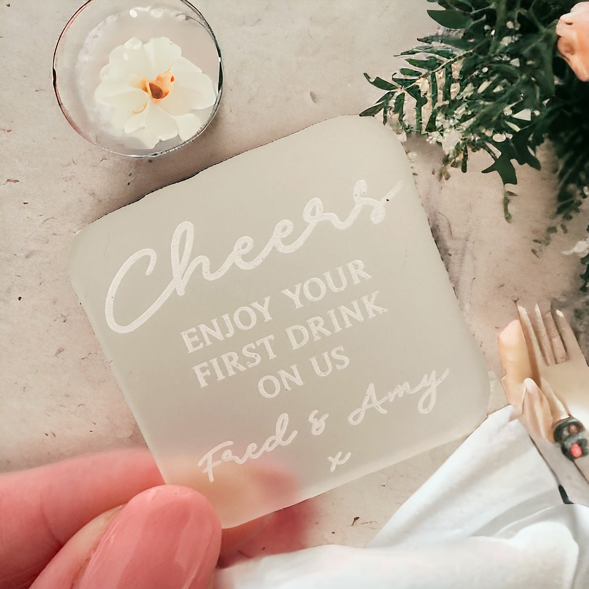 Elevate your wedding with our acrylic engraved drinks tokens. Measuring 40mm/1.57 inches in size, these elegant square tokens are crafted from 3mm thick acrylic and are available in a variety of materials. Please keep in mind that the frosted acrylic is highly sought after, but to truly appreciate the intricate engraving, it is recommended to display it against a darker backdrop. Make these tokens truly yours by personalising them with the names of the newlyweds.