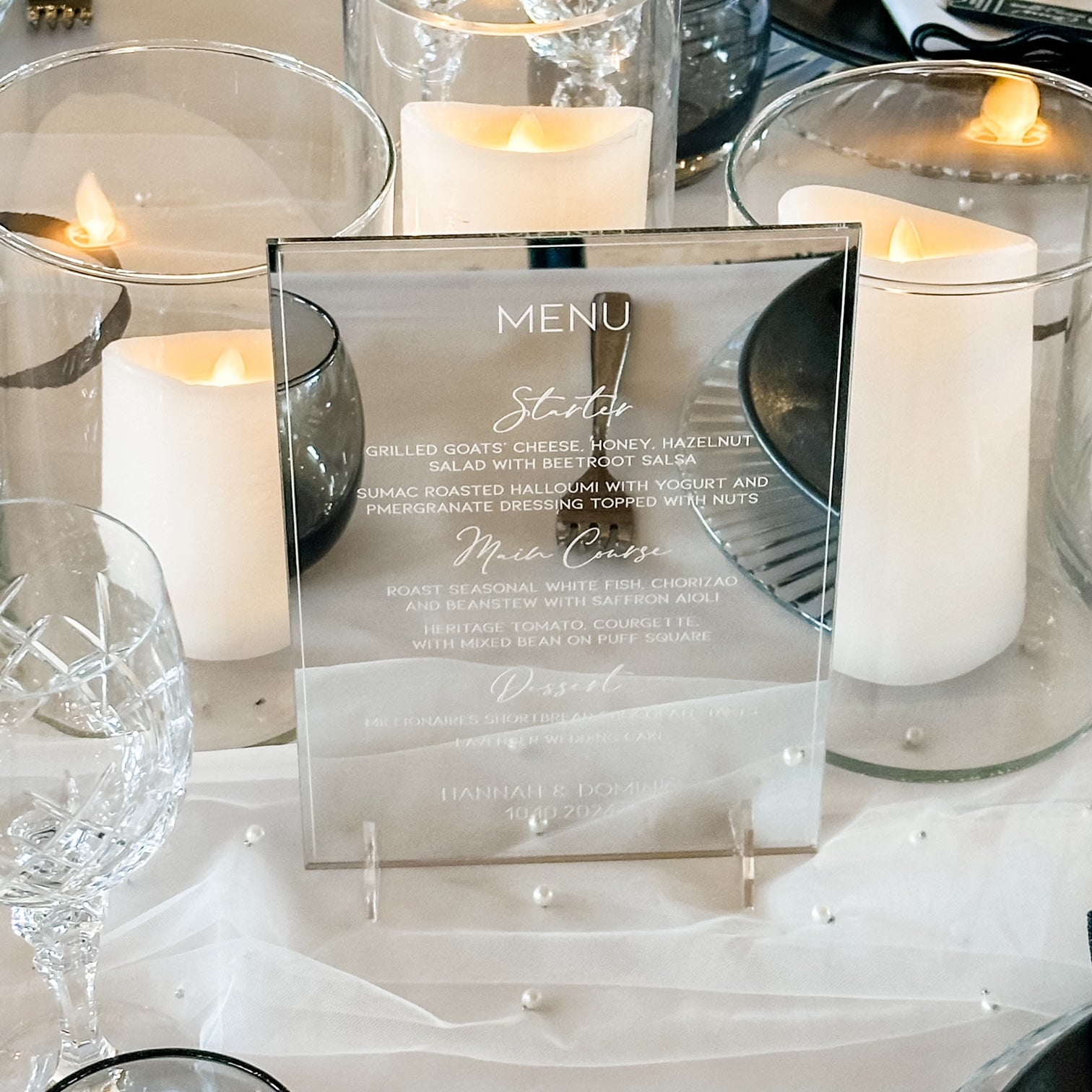 The A5 wedding menu boasts an exquisite engraved design, measuring approx. 148mm x 210mm/5.83 x 8.27 inches, in your choice of luxurious materials. Please note, the frosted acrylic is a popular choice but to fully appreciate the delicate engraving, it's recommended to pair it with a darker background. Personalise your menu with a selection of elegant fonts. Each menu is customisable to your specific needs and includes stylish feet for easy display.