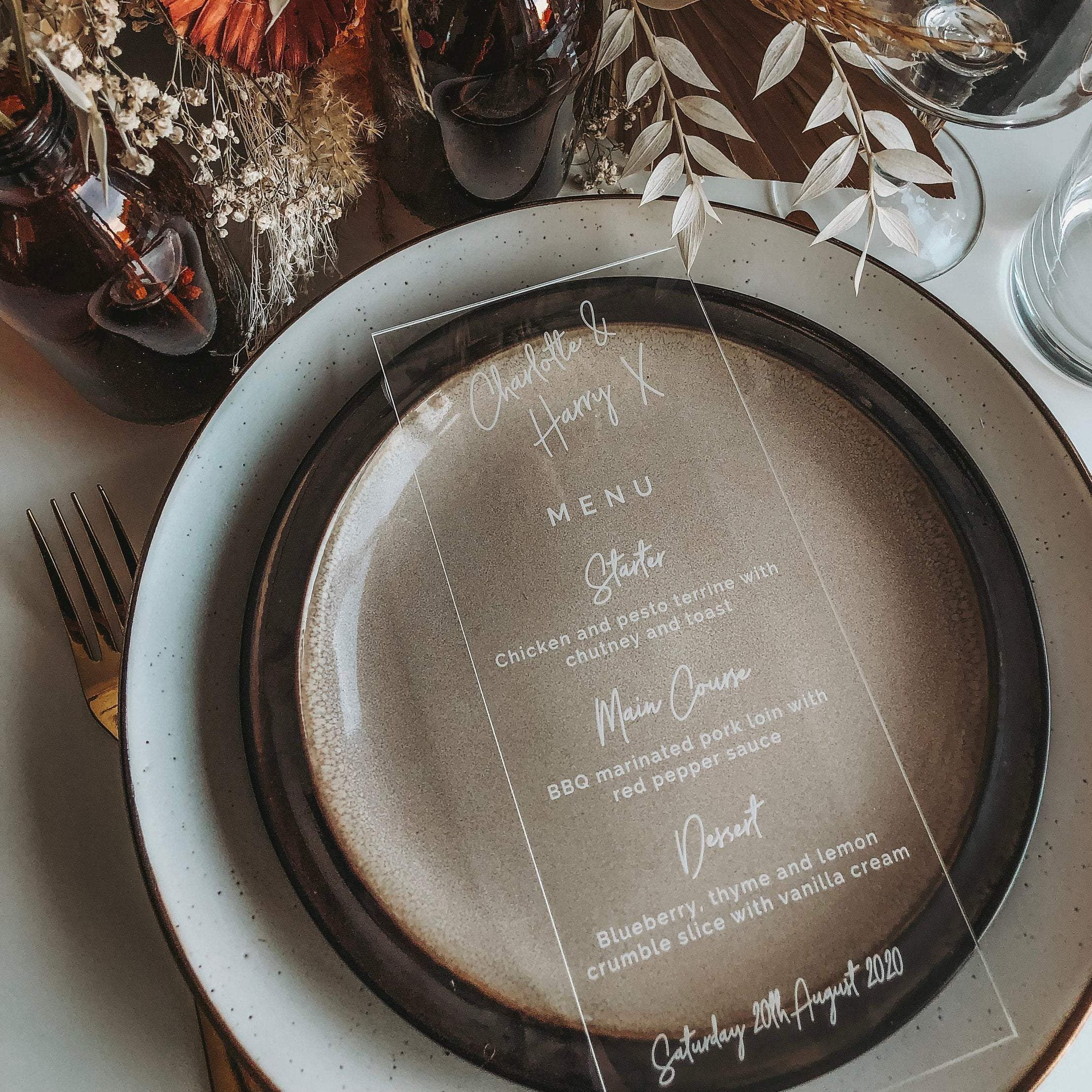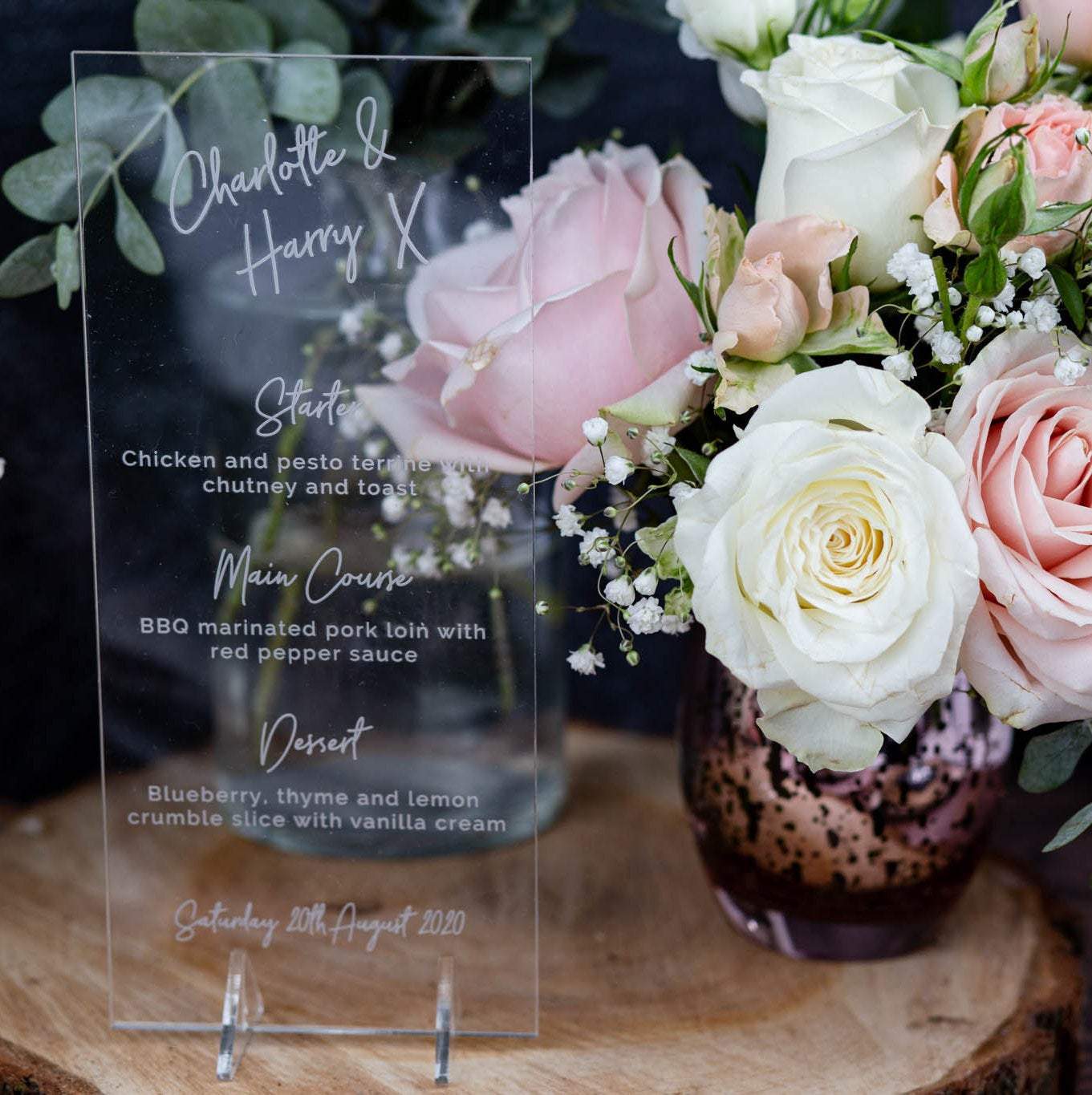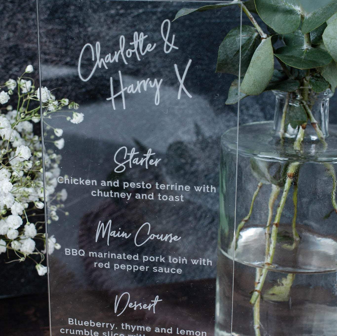 Elegantly crafted and personalised to your specifications, our Acrylic DL menu is a luxurious addition to your wedding breakfast. Measuring approximately 95mm x 220mm/ 3.74 x 8.66 inches, this menu is available in a selection of premium materials (see photo for reference). Our frosted acrylic option is especially popular, but for the true beauty of the engraving to be revealed, it should be displayed against a darker backdrop. Choose from a variety of sophisticated fonts to add a touch of elegance. Each menu is delicately crafted from 3mm acrylic and comes with feet included.