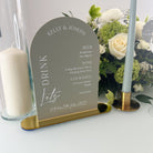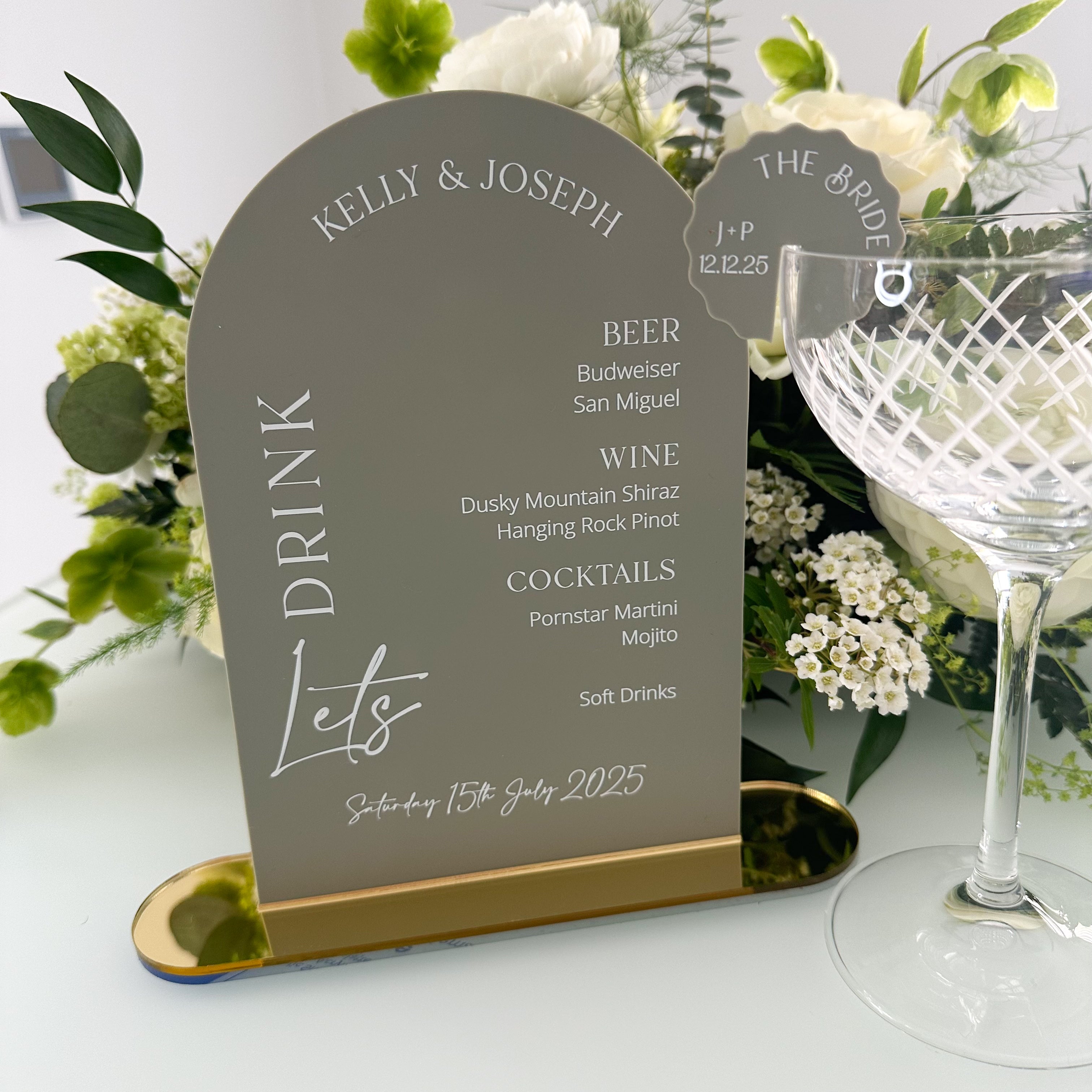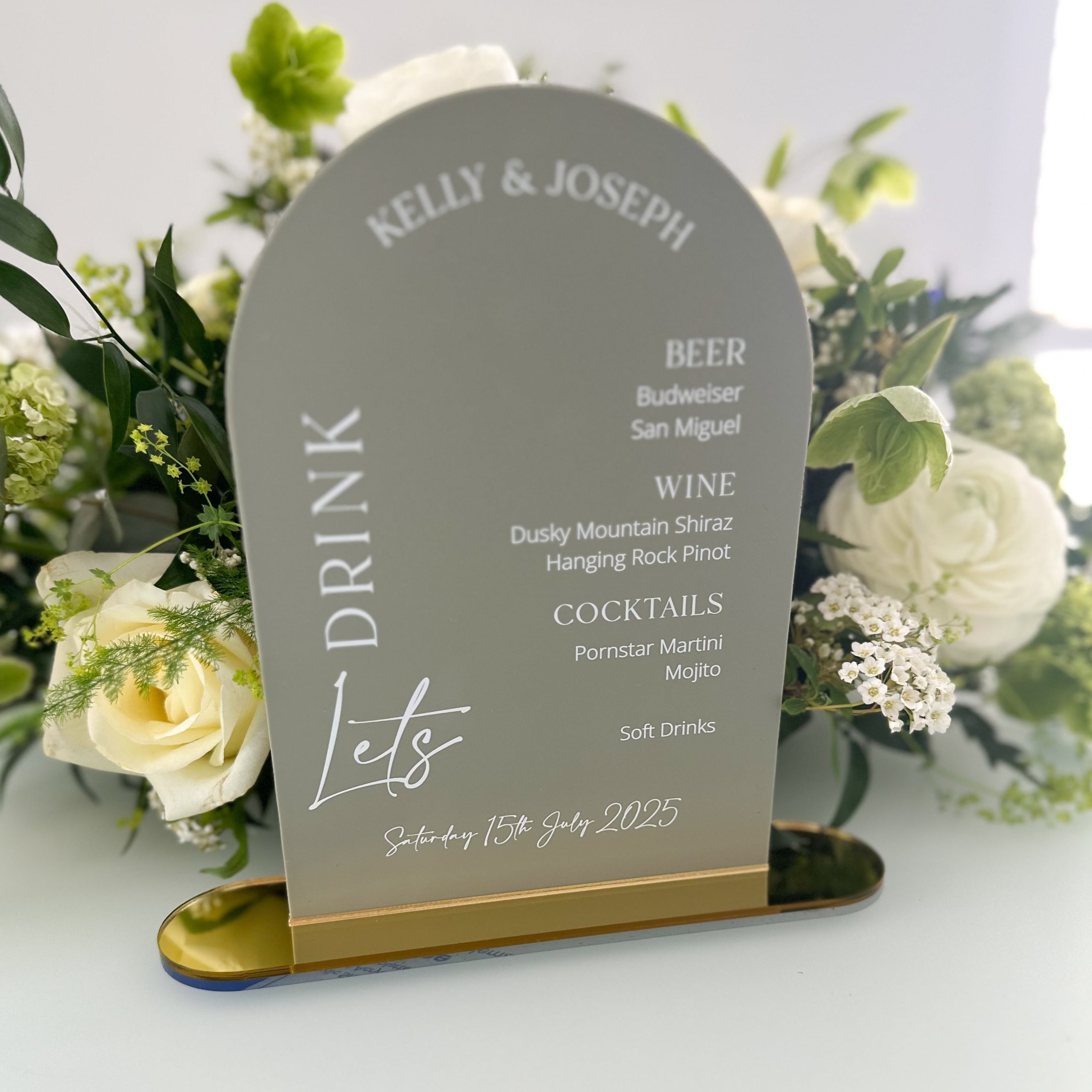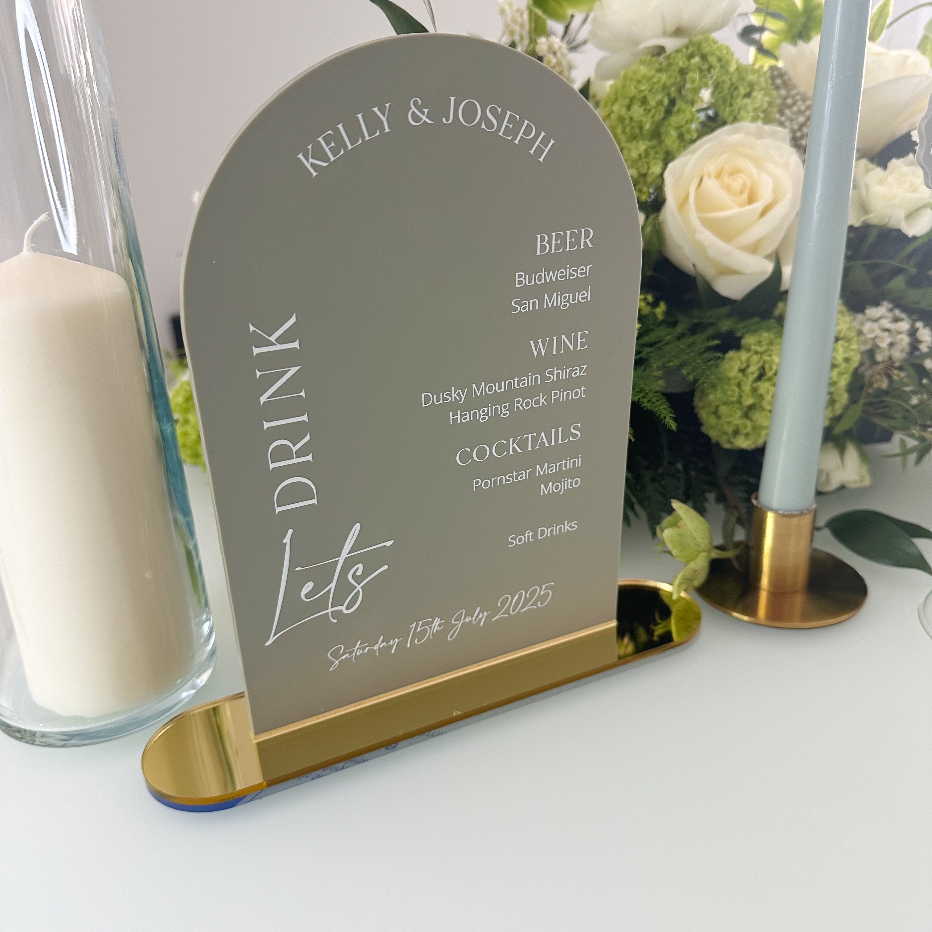 Elevate your wedding experience with our exquisite sage green acrylic wedding drinks menu sign. Available in a variety of colours and shapes to perfectly compliment your décor, this lavish piece comes complete with a stunning mirror stand, elevating any event with a touch of refinement.