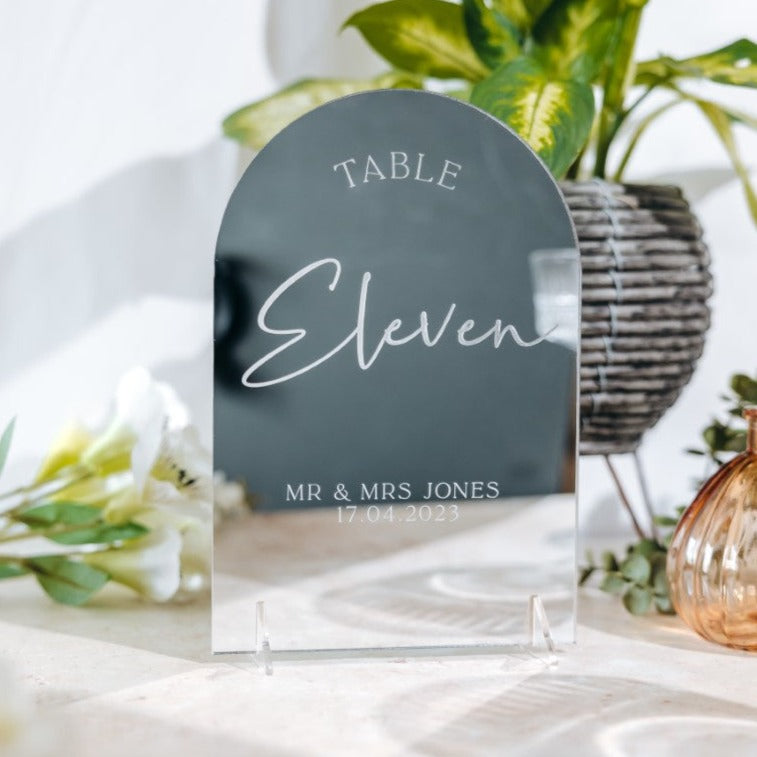 Personalised Table Numbers – Frosted Acrylic Dome Signs with Engraved Name Plates
