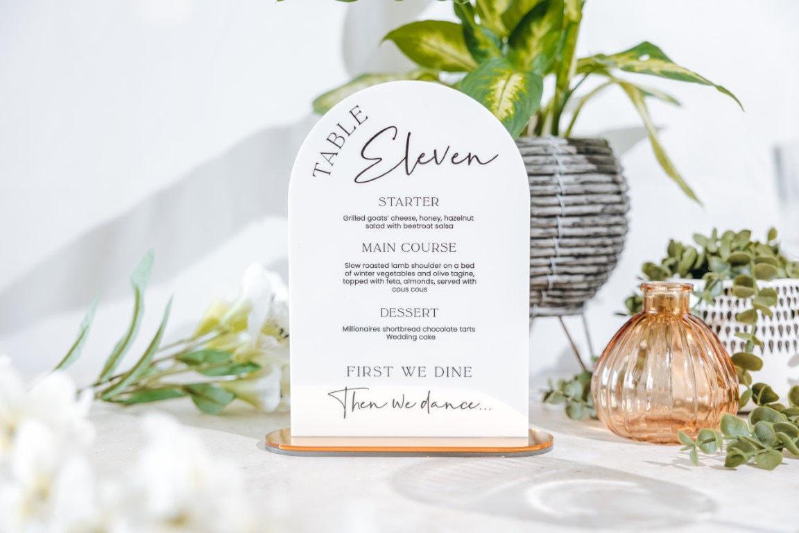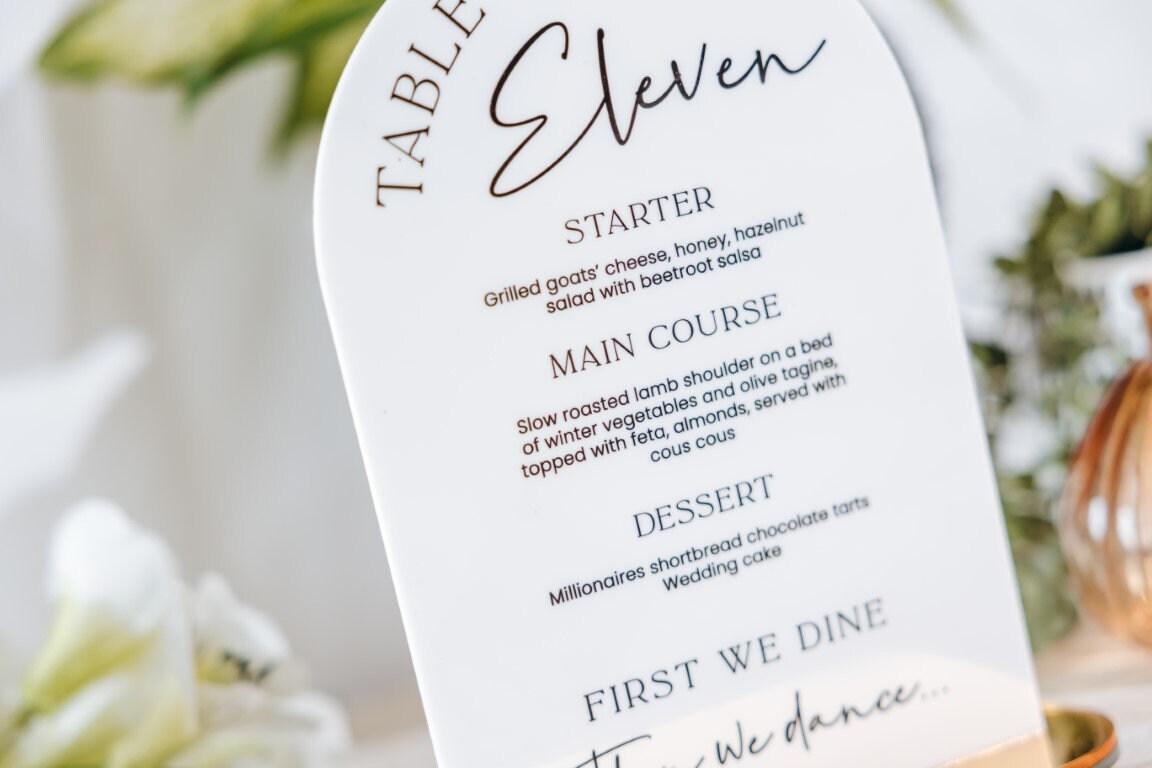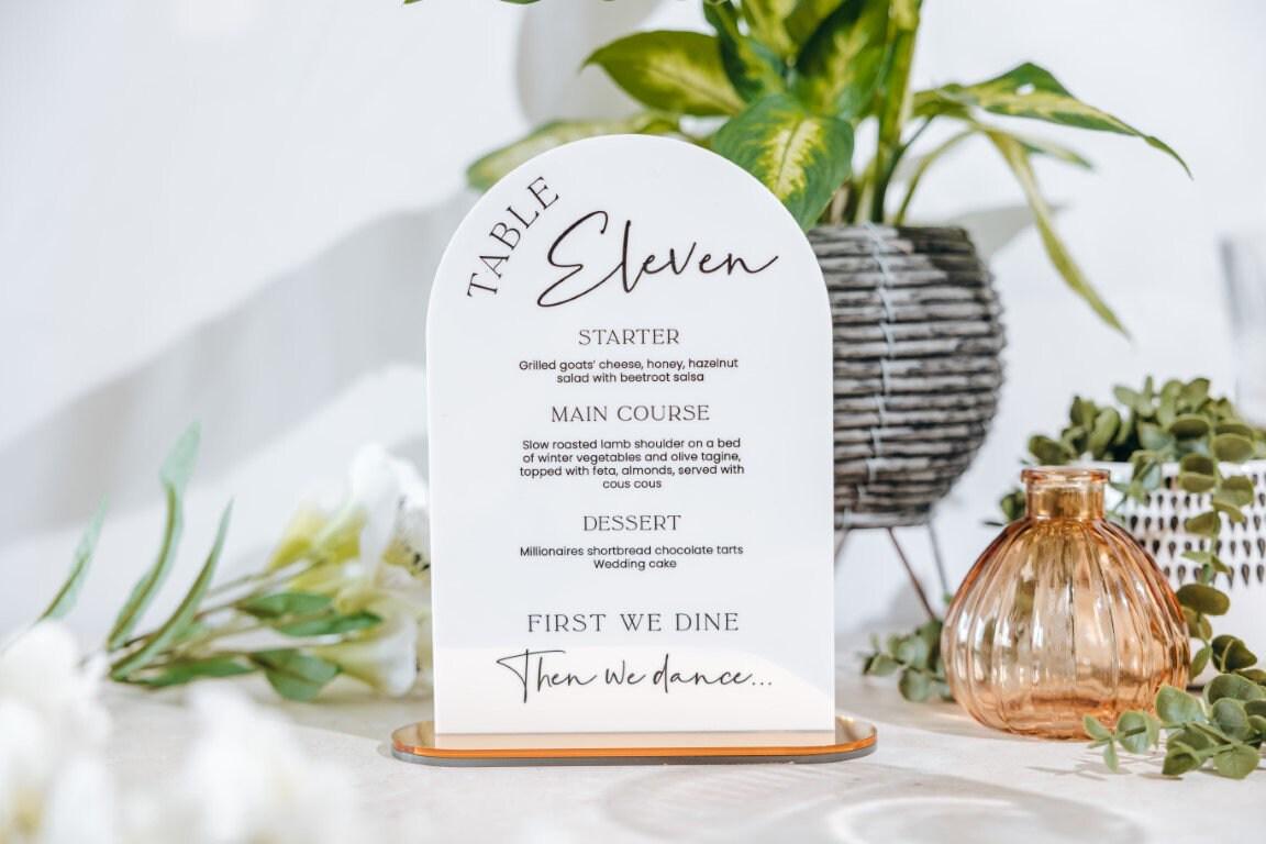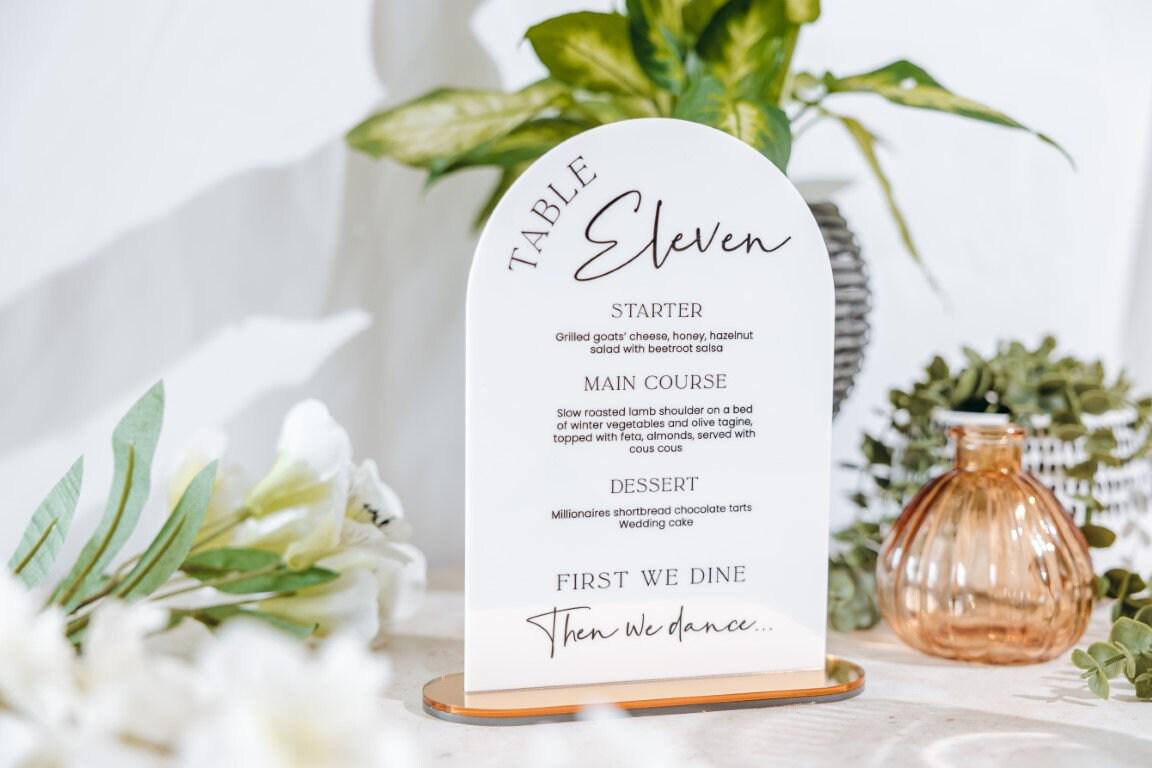 Personalised Wedding Menu & Table Number: Acrylic with Mirror Stand