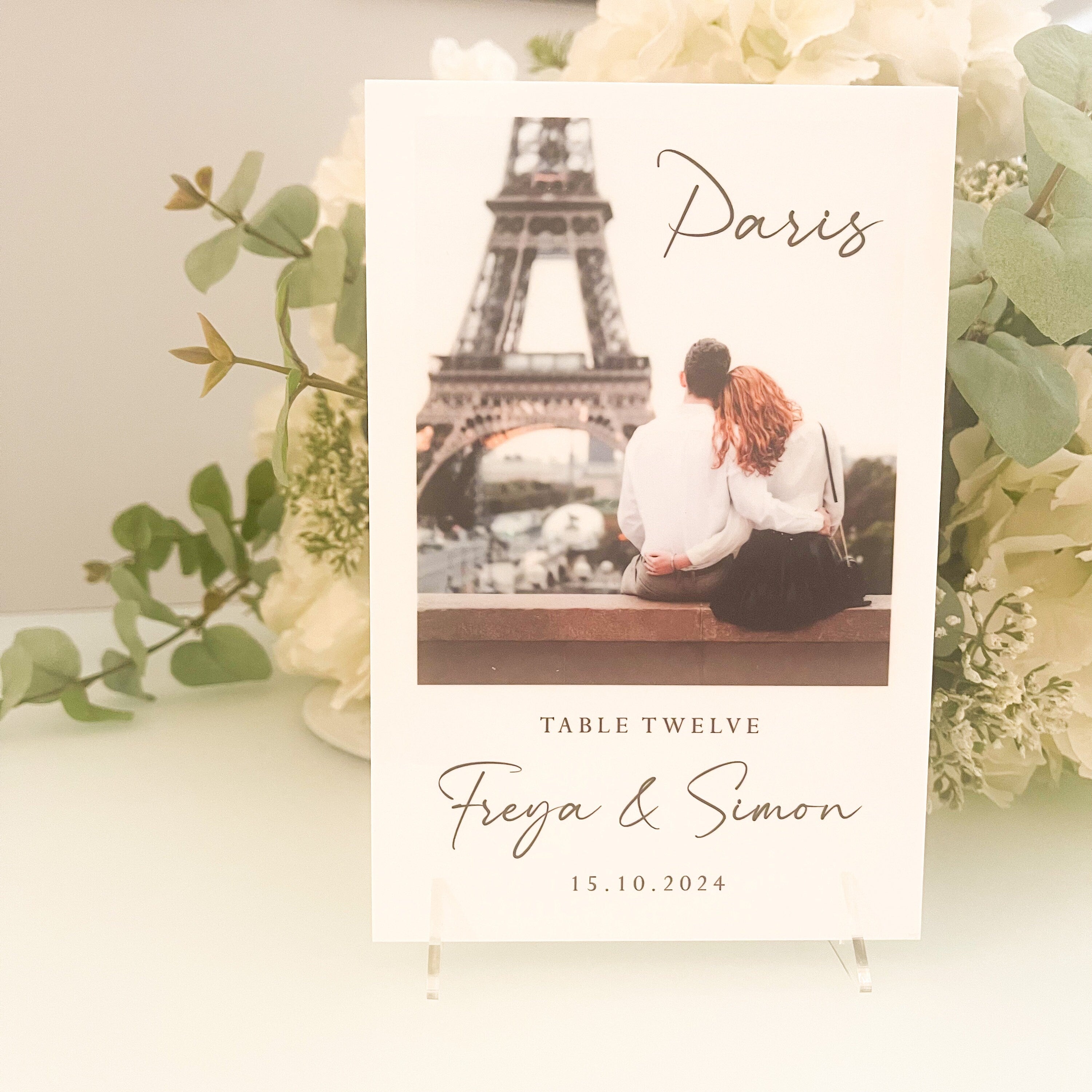 - UV printed photo table numbers on 3mm acrylic (clear gloss, frosted, or white) or lightweight foamex foam board