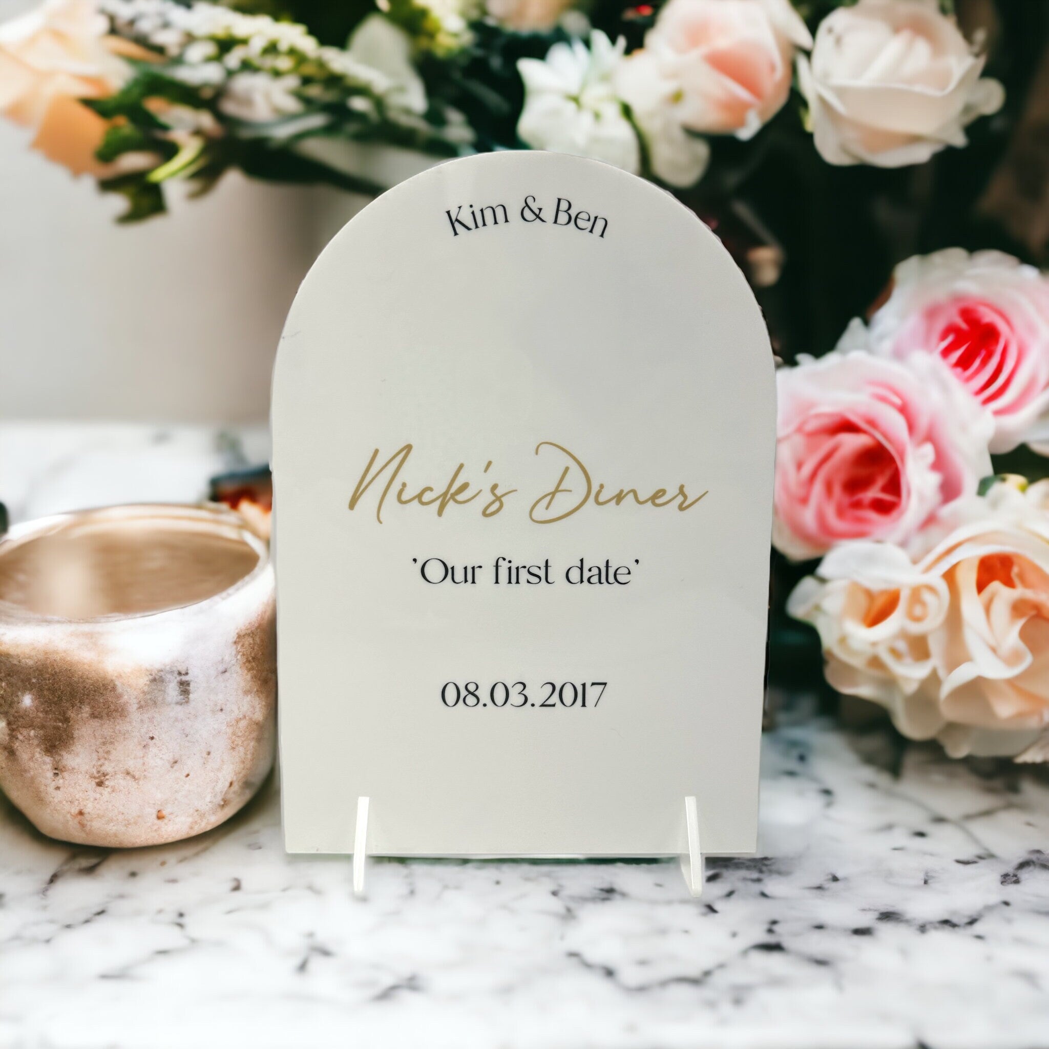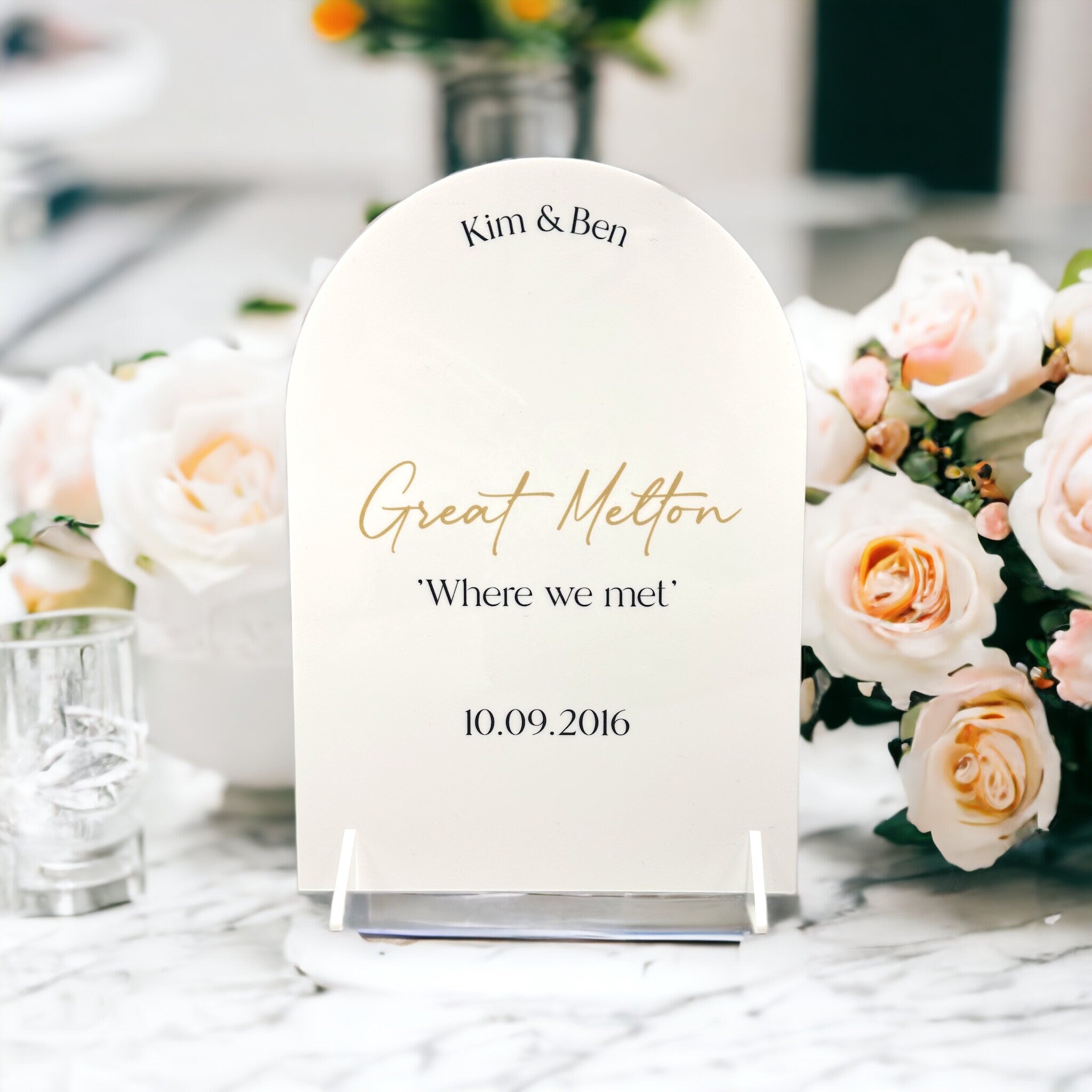 ************Celebrate your special day with our modern wedding table numbers, thoughtfully designed to add a personal touch to your reception. These elegant signs, featuring UV printed acrylic and crafted in the UK, can be customized with meaningful phrases like "Where we met" or "Our first date," making them a unique keepsake for your wedding. With a choice of custom fonts and a striking white and gold color palette, these dome-shaped signs blend seamlessly into any wedding decor.