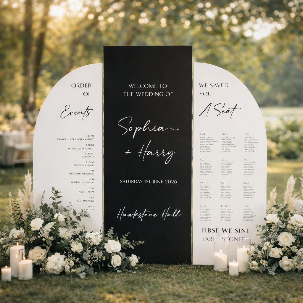 Our wedding trio signage set offers the perfect wedding trio signage solution to enhance your wedding event display with style and clear guest guidance. This extra large wedding signs bundle includes personalised wedding signage featuring a wedding table plan, welcome wedding sign, and order of events sign designed to keep your guests informed while seamlessly complementing your elegant wedding decor.