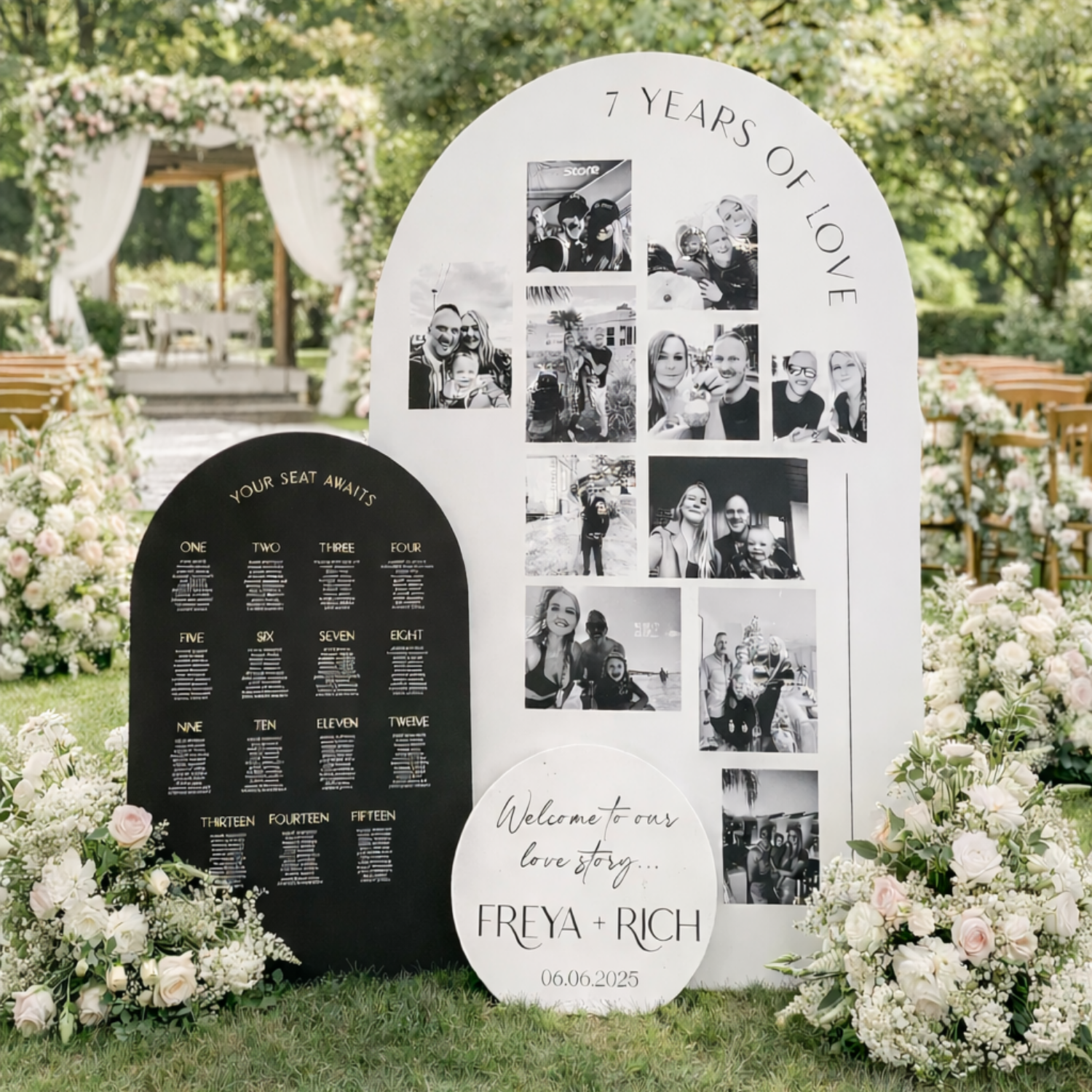 The wedding photo installation from Wedding Lux is a premium acrylic and foam board wedding display designed to streamline your wedding seating arrangement while welcoming guests with style. This extra large wedding sign features a detailed wedding guest seating chart and photo welcome sign, helping guests navigate your event easily and ensuring a smooth flow throughout your celebration.