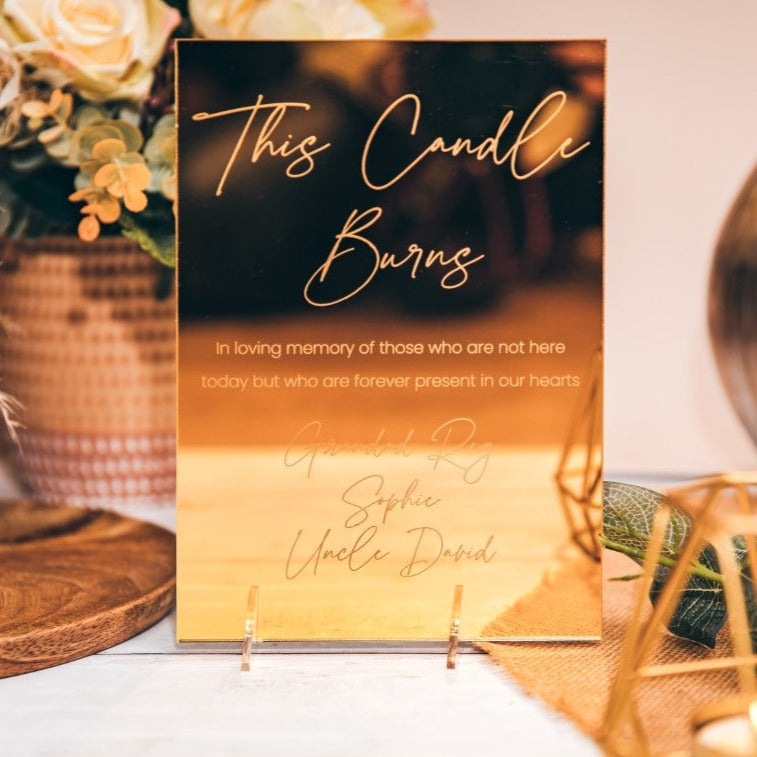 Honour the memory of loved ones on your special day with our exquisite mirror engraved remembrance sign. Choose from A5, A4, or A3 size options and a variety of elegant materials (see photos for examples). Please note that frosted acrylic is a favoured choice, though for optimal appreciation of the engraving, it's recommended to display against a darker background. Each sign is uniquely personalised to your specifications and includes feet for easy display.