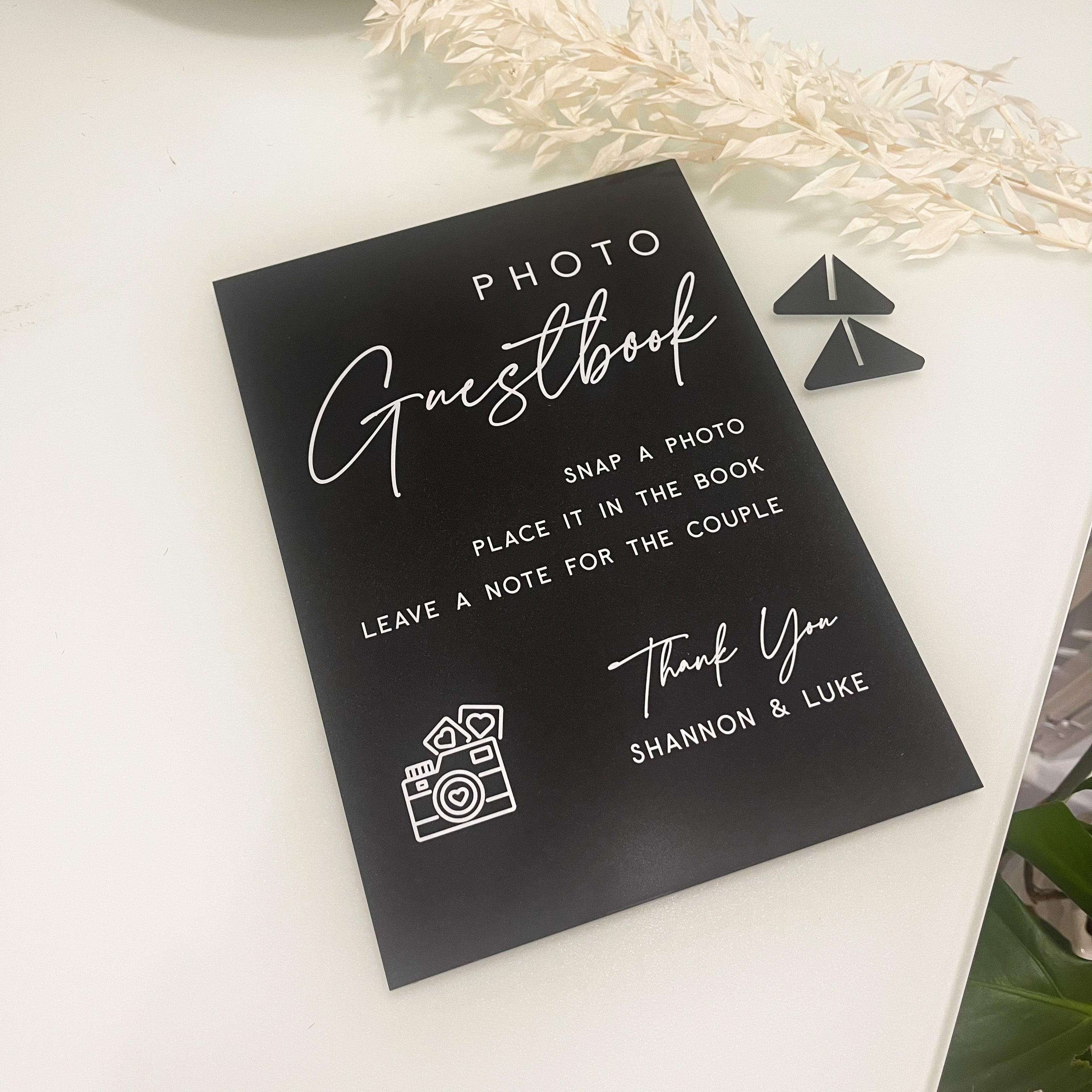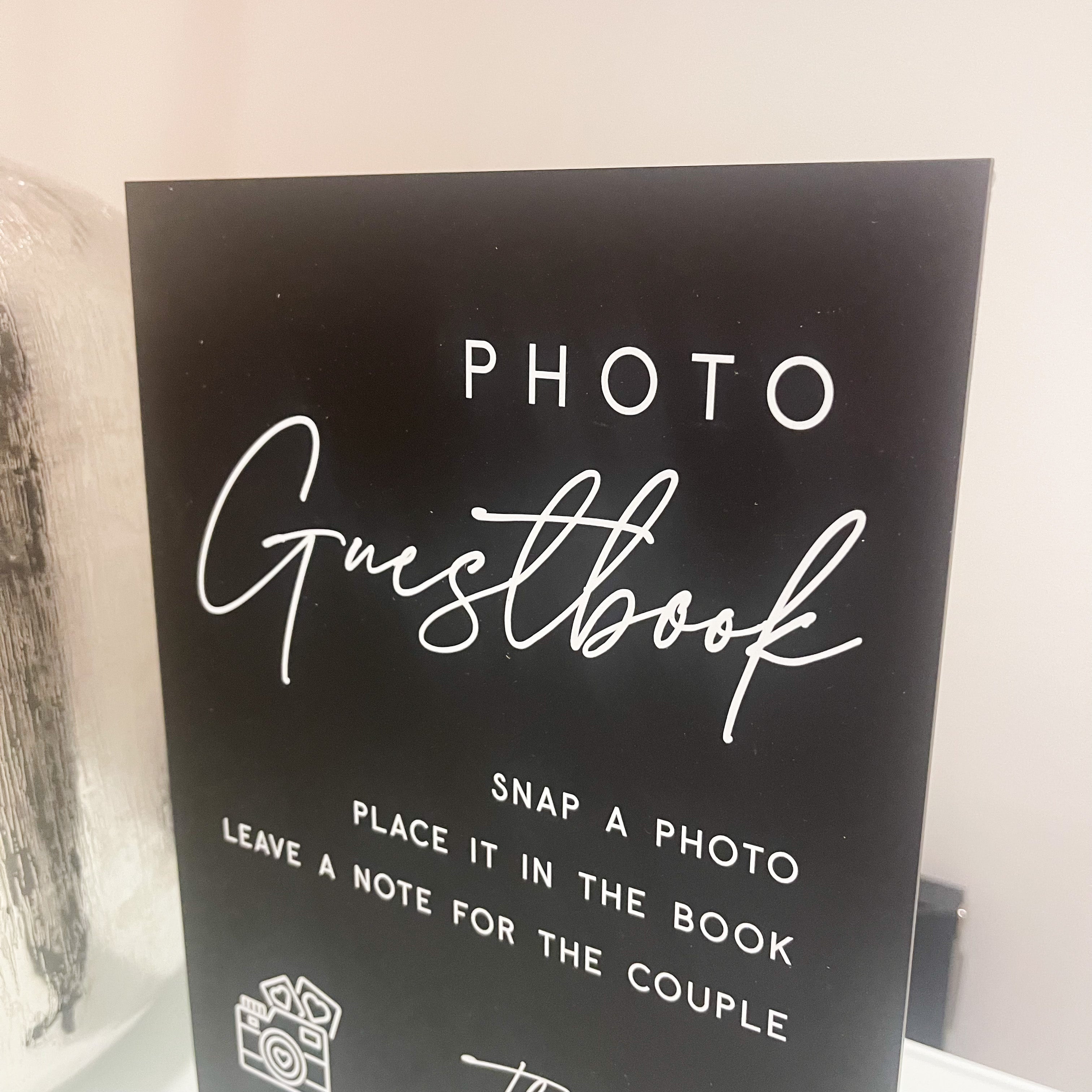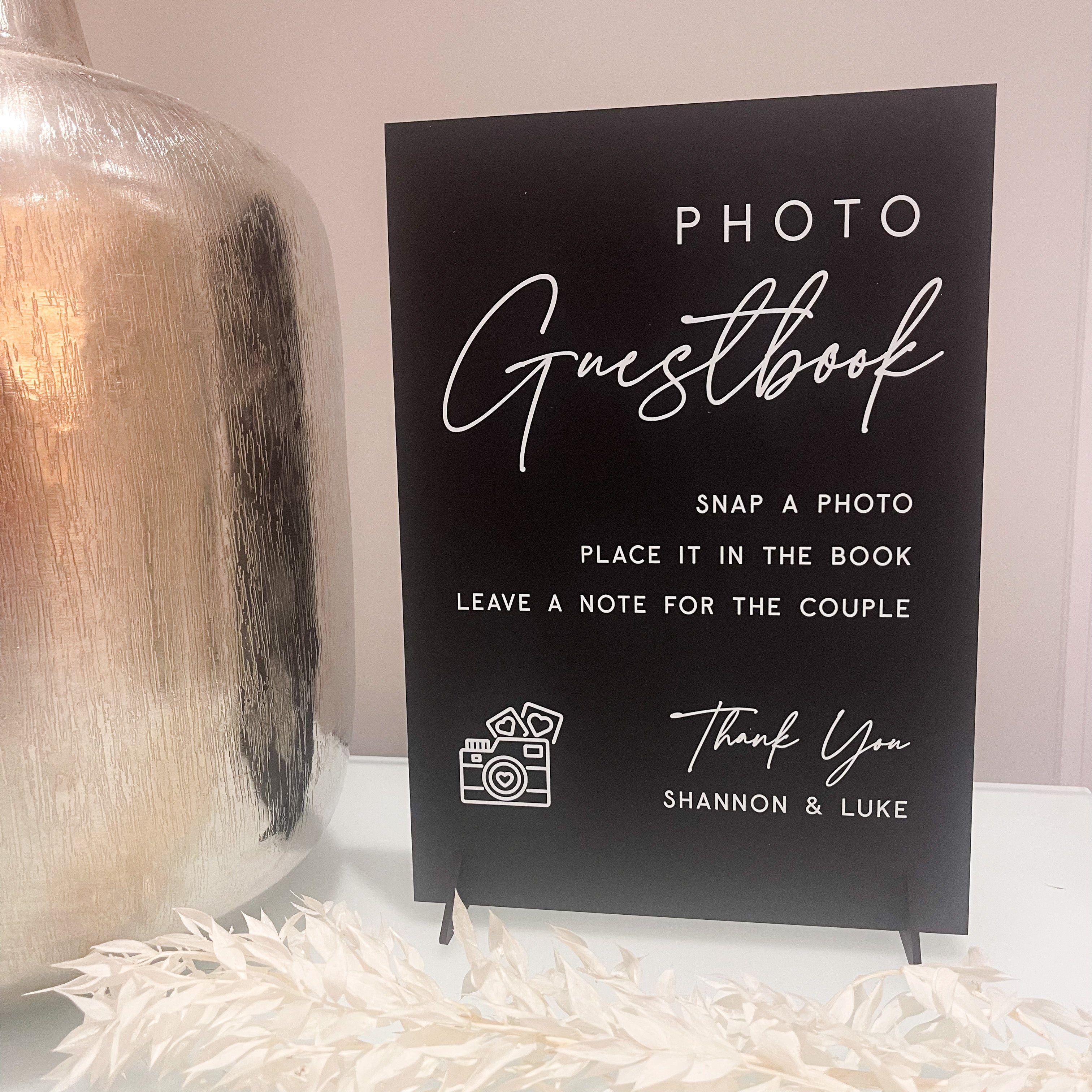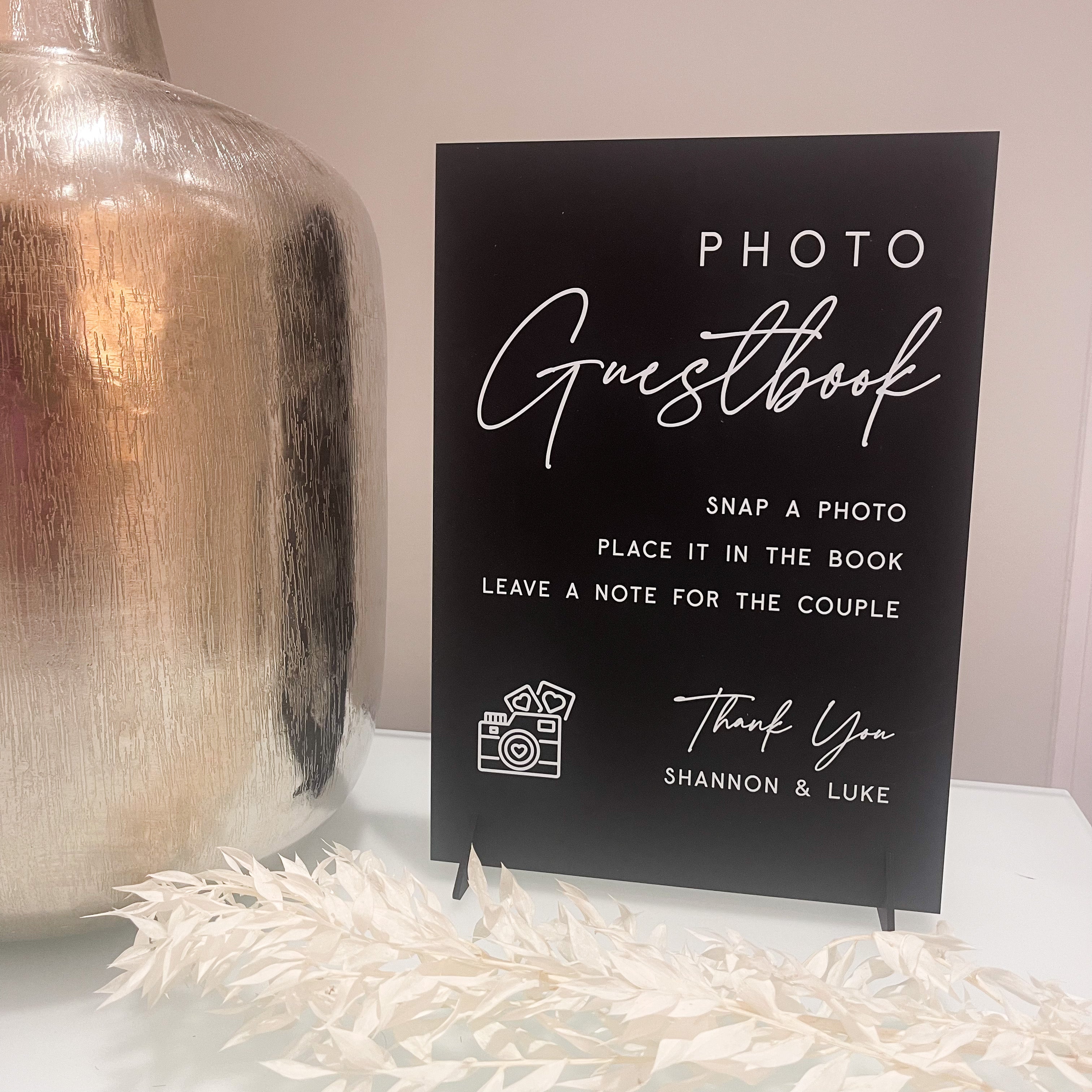 Choose from two sizes - A5 or A4 - of our personalised photo wedding guest book sign, crafted from high-quality 3mm acrylic and available in a variety of elegant finishes. Enhance your special day with this tasteful, exclusive addition, complete with feet for easy display.