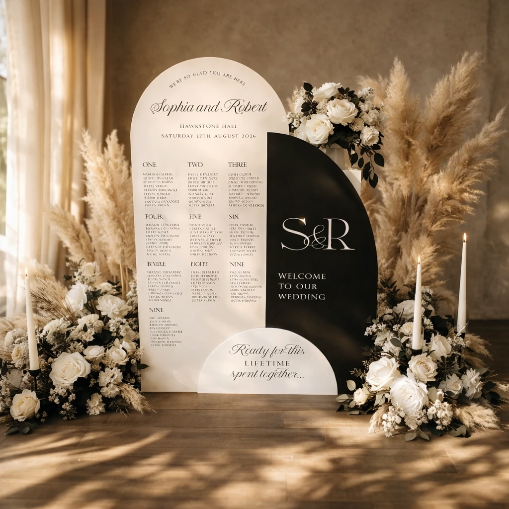 The wedding signage trio from Wedding Lux offers an elegant and functional solution to elevate your venue’s style while guiding guests effortlessly. This wedding signage trio includes a large wedding table plan, a welcome sign for wedding guests, and a smaller dome sign, all designed to enhance guest experience with clear communication and sophisticated wedding decor.