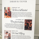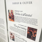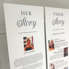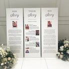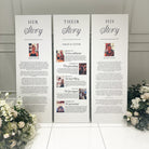 Experience the luxurious opulence of our extra large wedding trio signs - Impress your guests with the unique stories of the bride and groom's love story. Create a truly exceptional reading experience for your guests, thoughtfully crafted from premium foam board with exquisite attention to detail and a choice of fonts. Each piece is individually shipped for effortless display and is available with or without stands. The sizes displayed are the overall size of the trio.