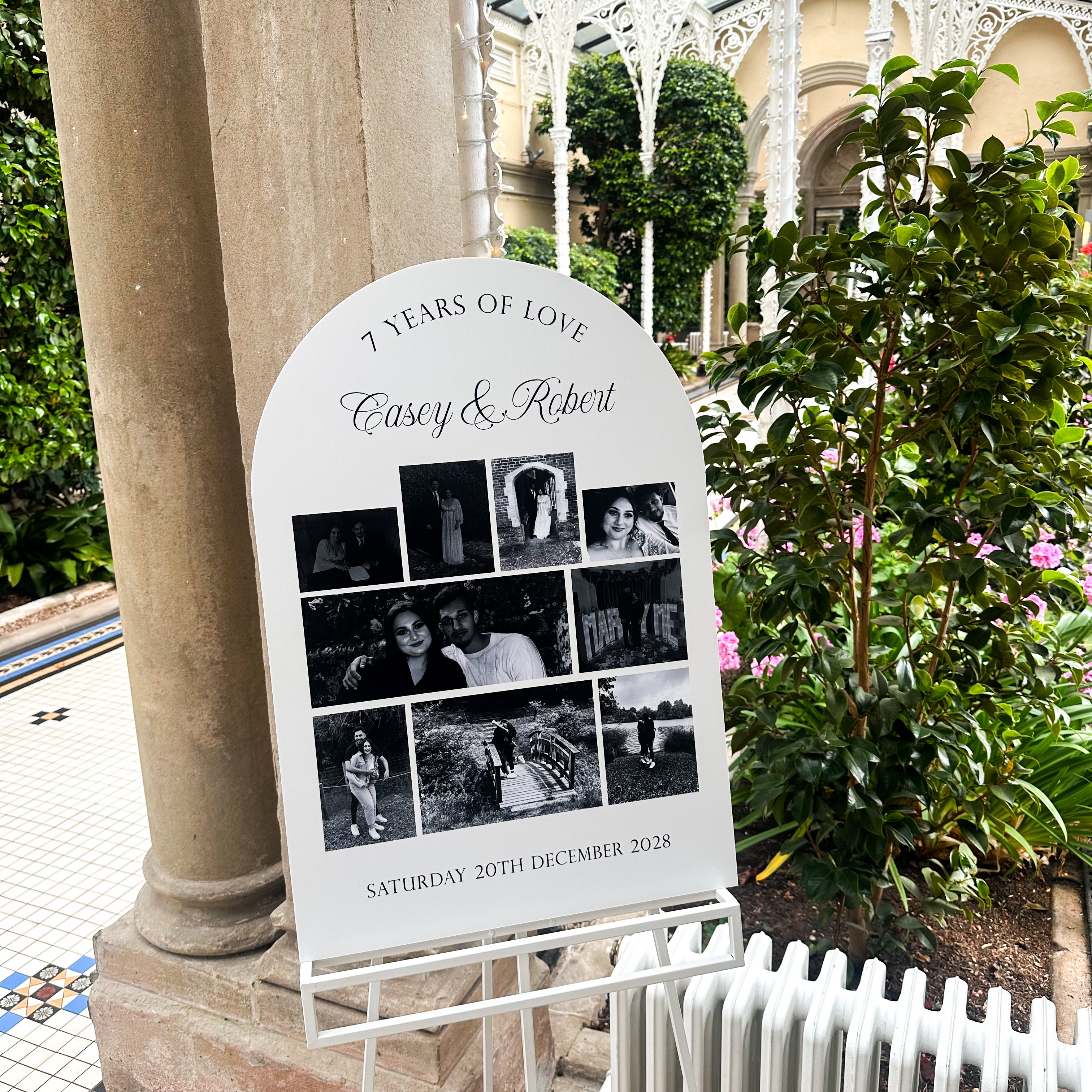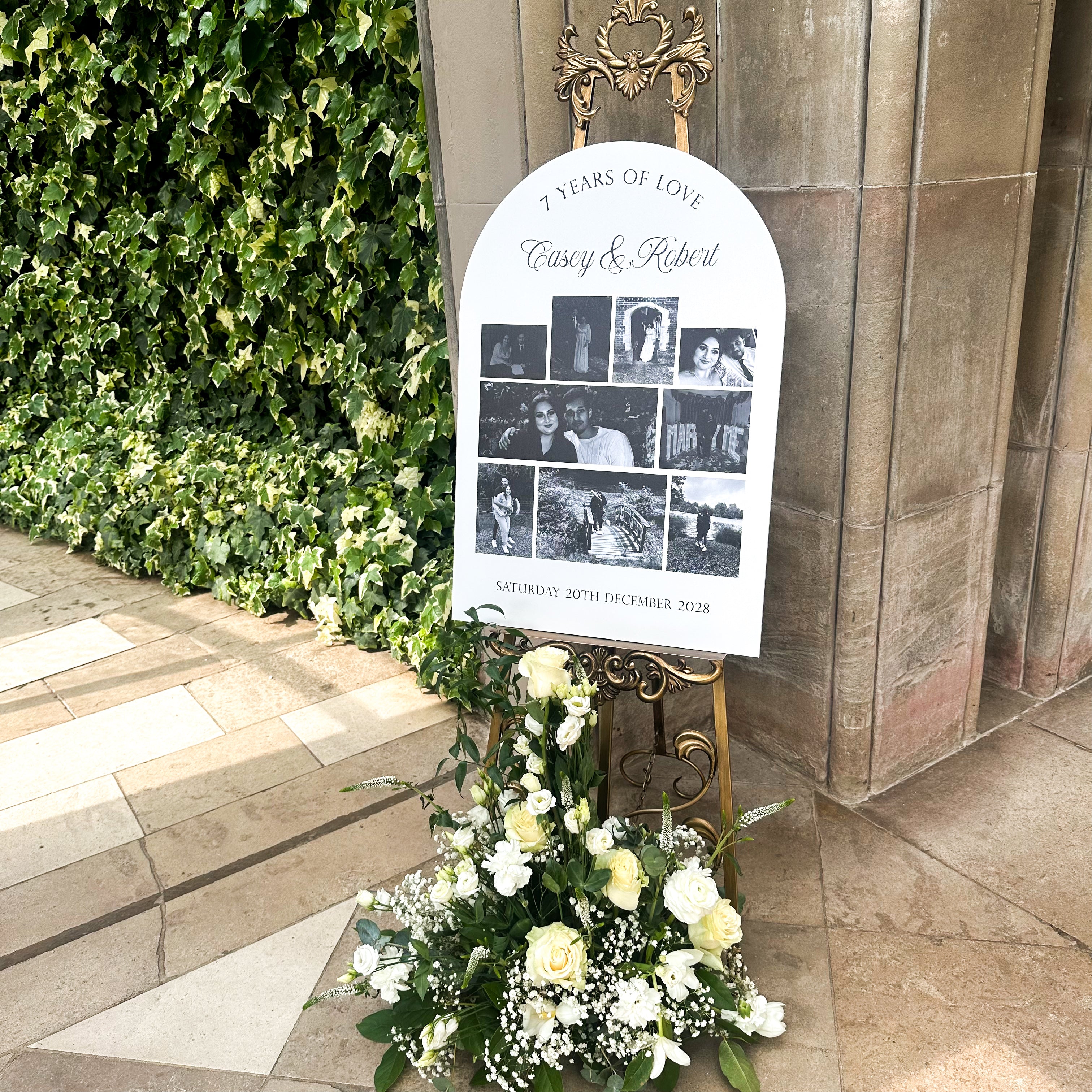 Celebrate your journey together with our elegant ‘Years of Love’ Dome Top Wedding Welcome Sign – a beautiful way to greet guests and showcase your love story. Featuring a curved dome top and a collage of your favourite photos, this design highlights key milestones such as how many years, months, and days you’ve spent together. Available in A1 or A0 sizes, and your choice of 3mm eco board or 5mm foam board, it offers a stunning, freestanding display that suits any wedding style. Whether placed at your venue entrance or as part of a feature wall, this sign adds warmth, personality and romance to your big day.