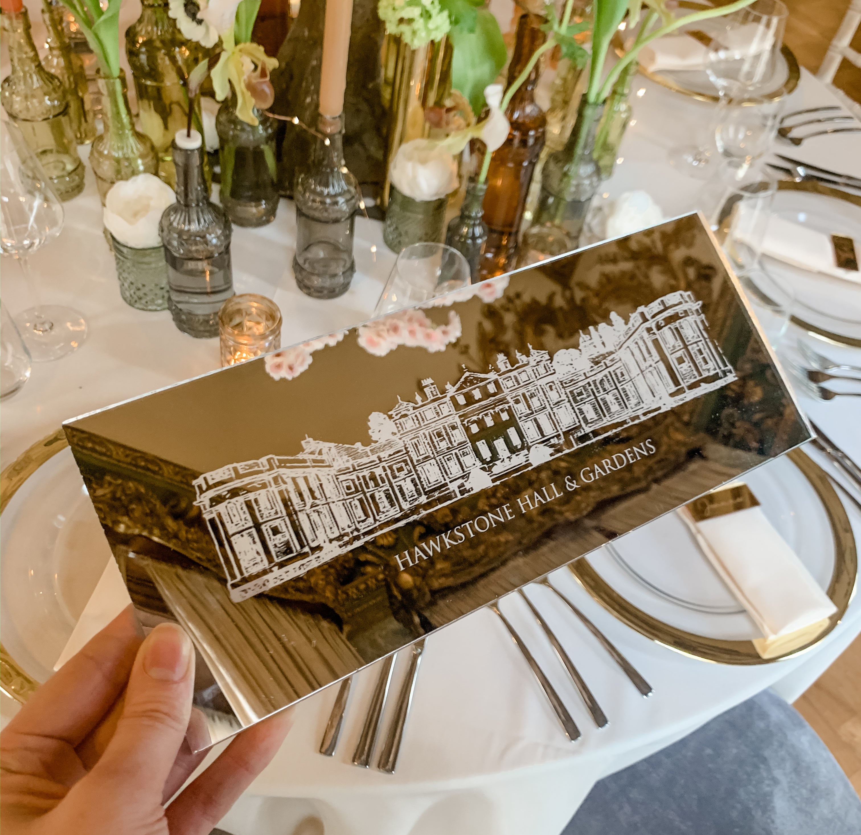 Our engraving process offers a unique and elegant alternative to printing. Using advanced techniques, we engrave your design directly into mirrored material, creating a stunning, reflective finish. This process adds depth and sophistication, giving your wedding signage and accessories a beautifully timeless and personalised touch.