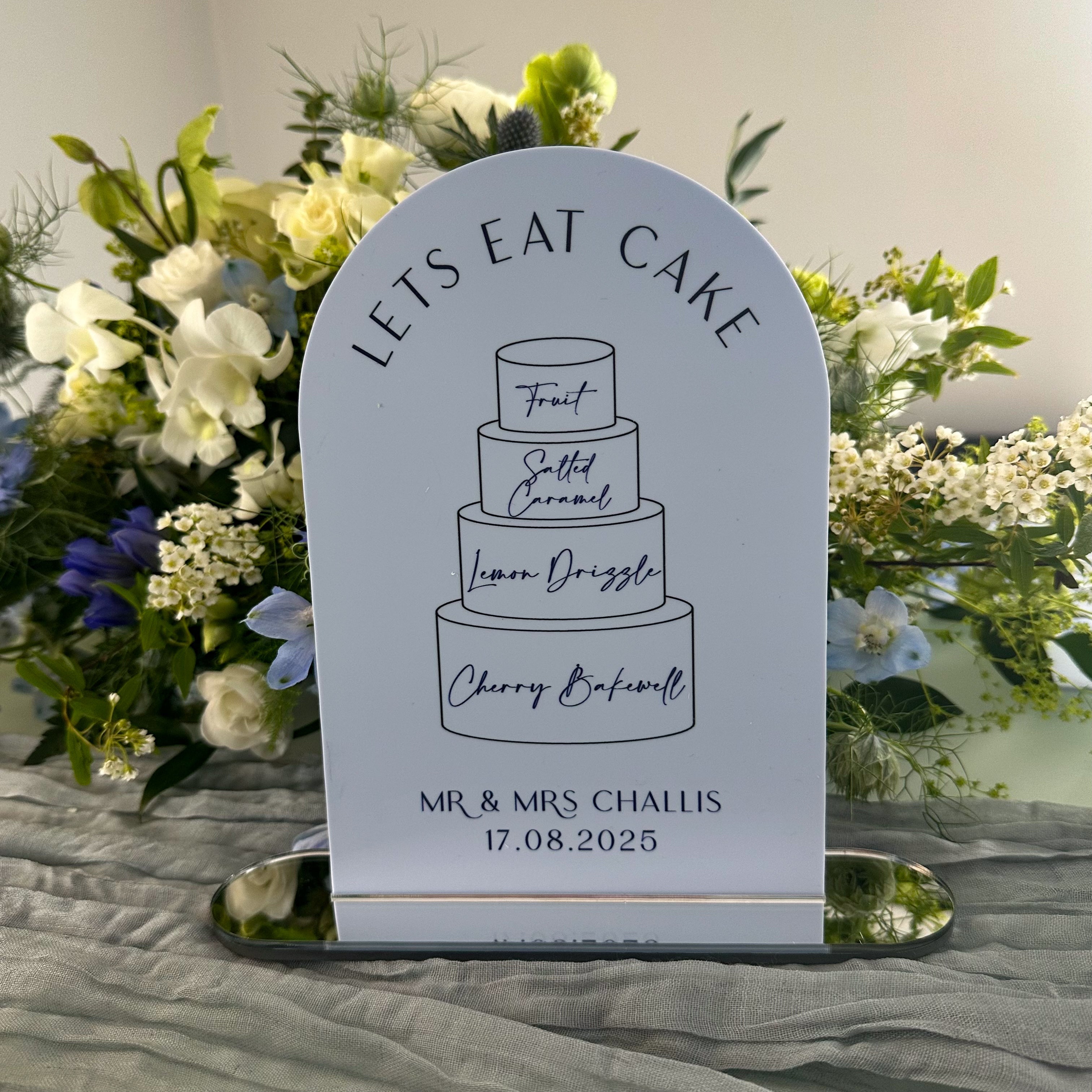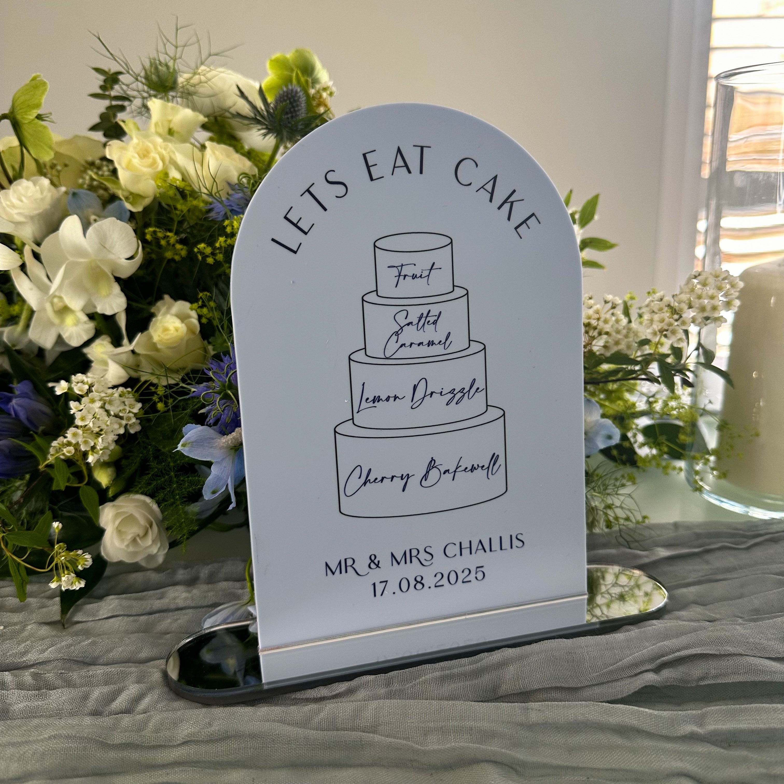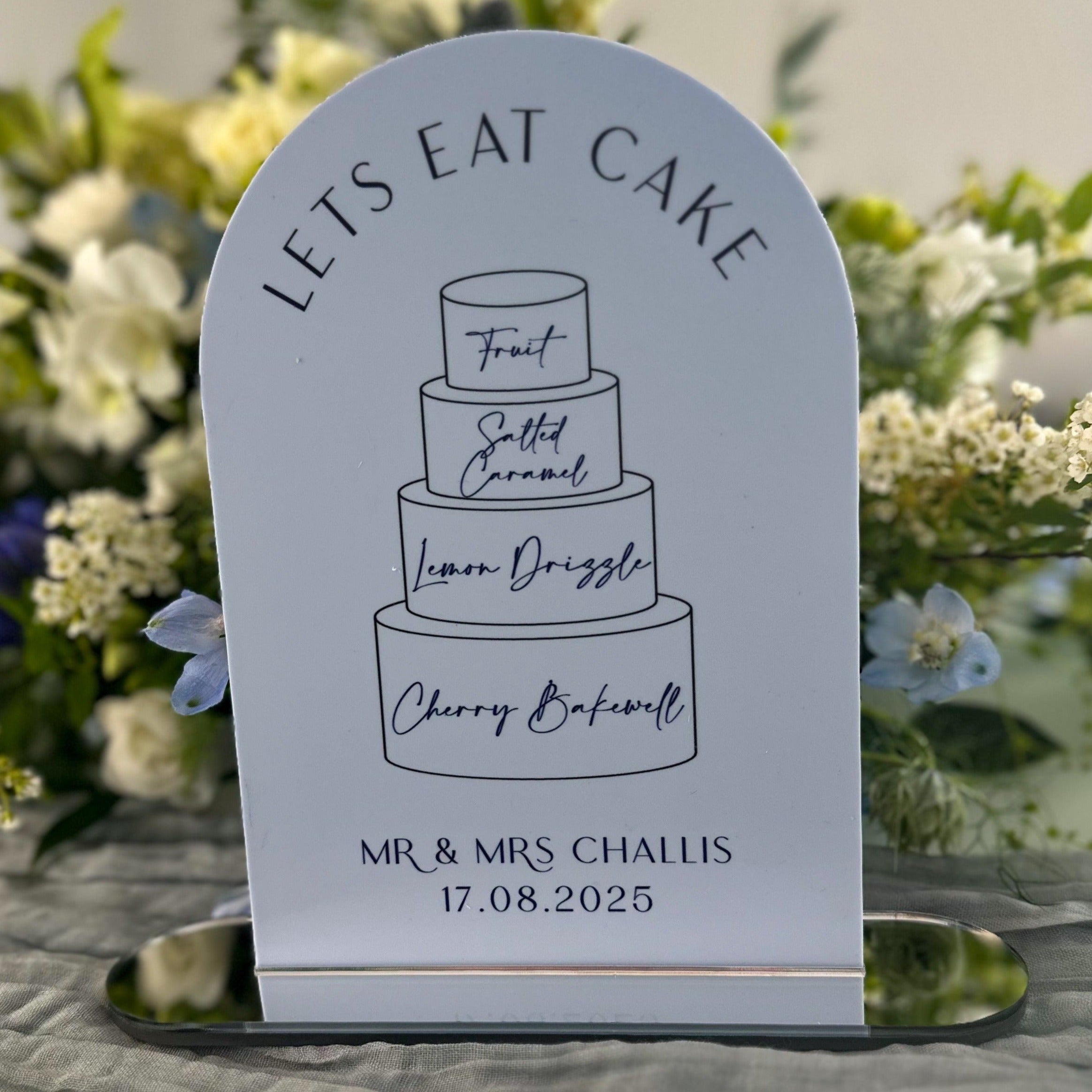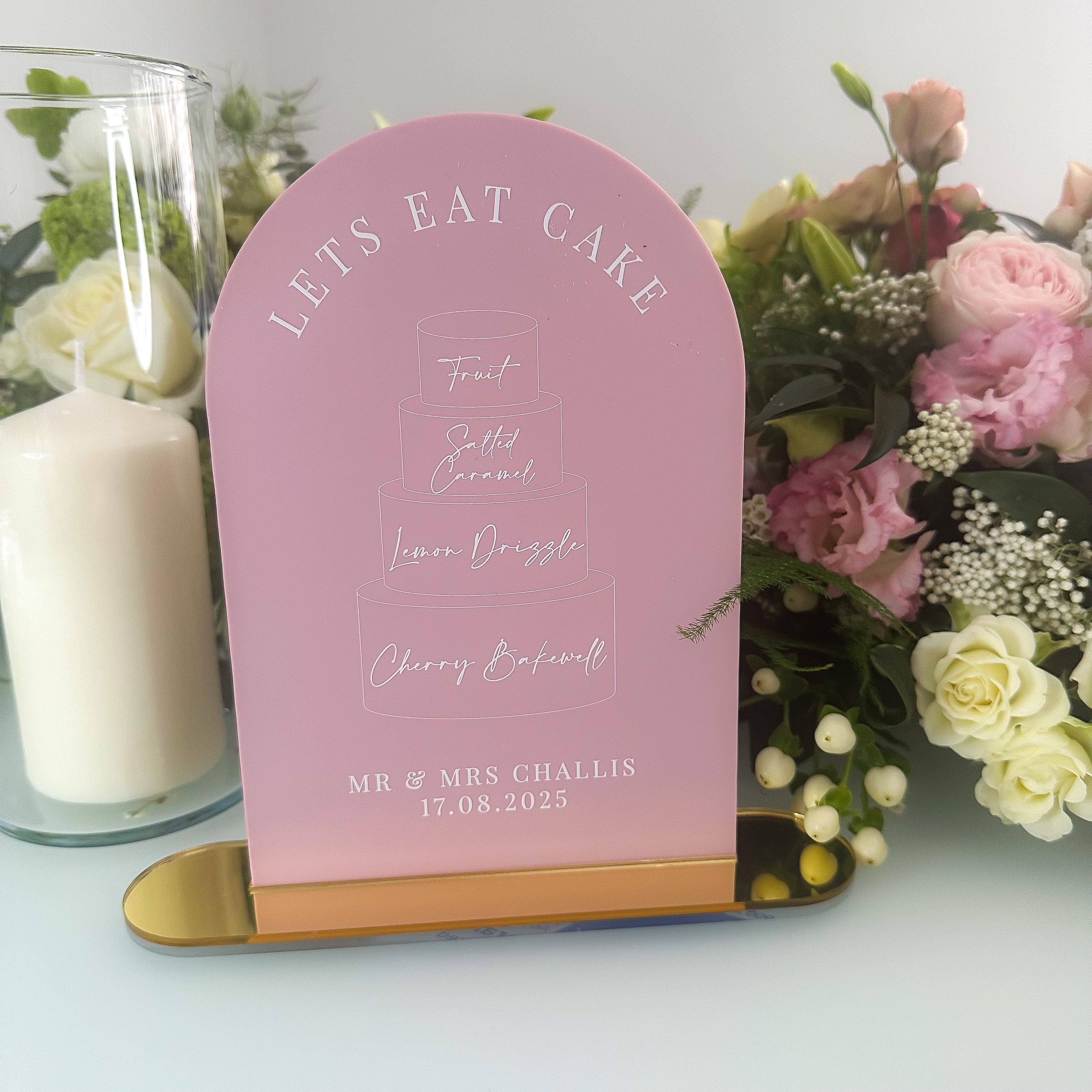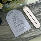 Indulge in the opulence of our dusk collection with this Bridgerton inspired wedding cake flavour menu sign. Featuring a UV printed cake illustration, this sign is available in various colours and shapes. Complete with a luxury mirror stand, it adds a touch of sophistication to any event.