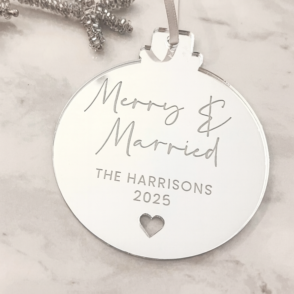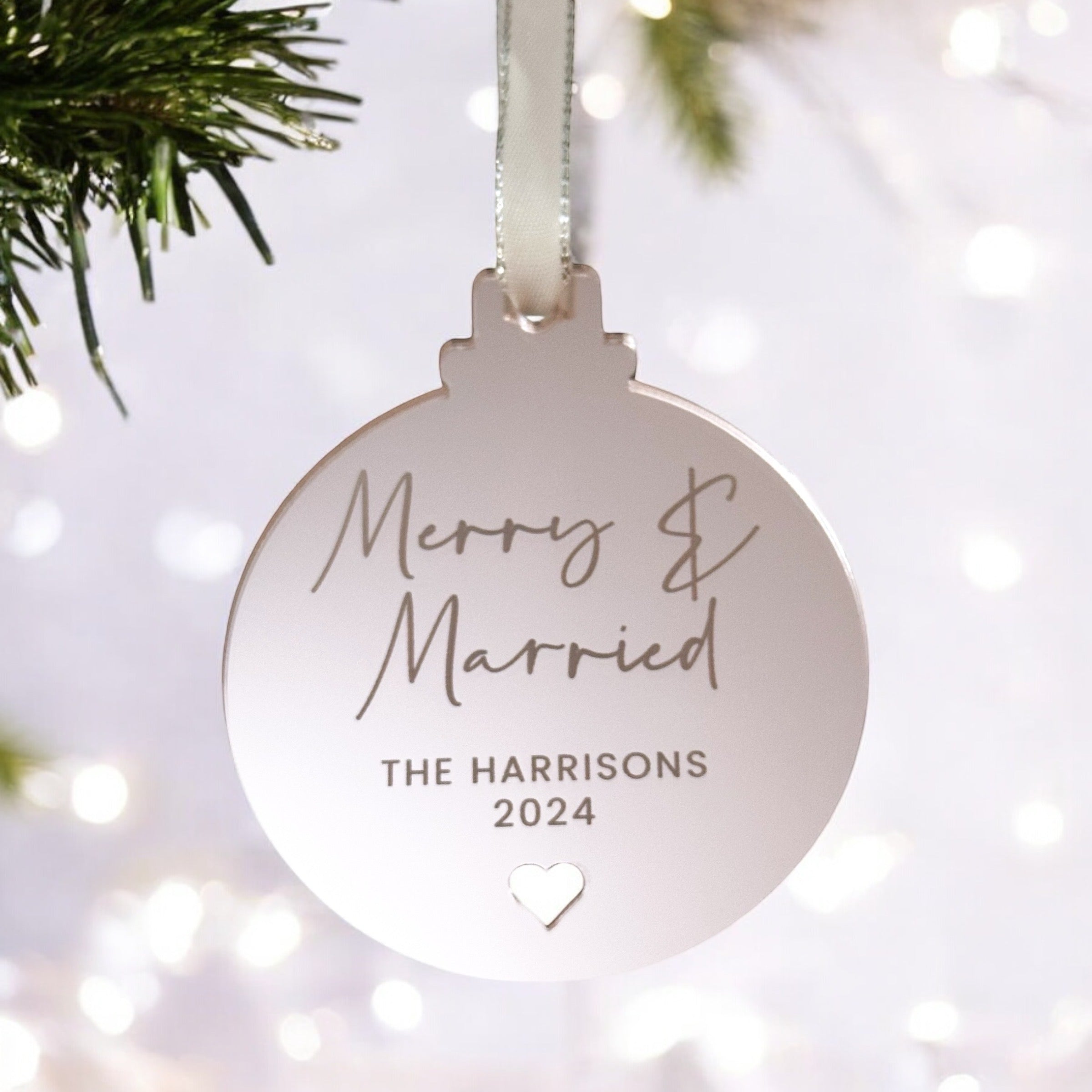 Celebrate your first Christmas as Mr & Mrs with our exclusive .Merry & Married' bauble. Available in a variety of luxurious materials, choose from three different sizes: 6cm, 8cm, or 10cm. The 3mm acrylic design is elegantly finished with a tasteful grey ribbon included separately.