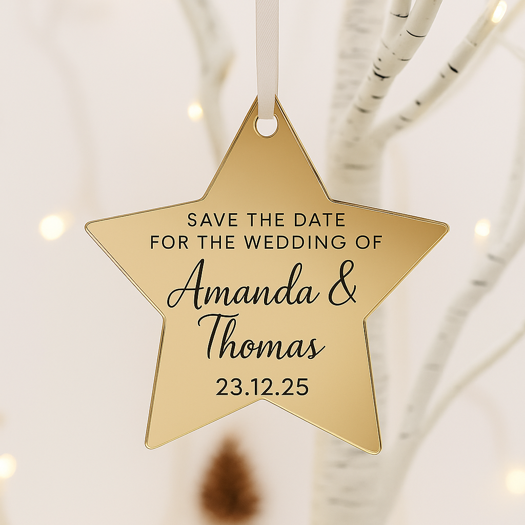 Add a touch of sophistication to your special day with our engraved acrylic star wedding announcement plaque. Personalise each tag with your names, dates, and wedding details. This plaque includes a 5mm hole, but can be made without upon request. Keep in mind, ribbon is not included. Choose from a wide variety of elegant fonts and materials. Please note that our frosted acrylic option is a popular choice, but to truly showcase the stunning engraving, it is best paired with a darker background.